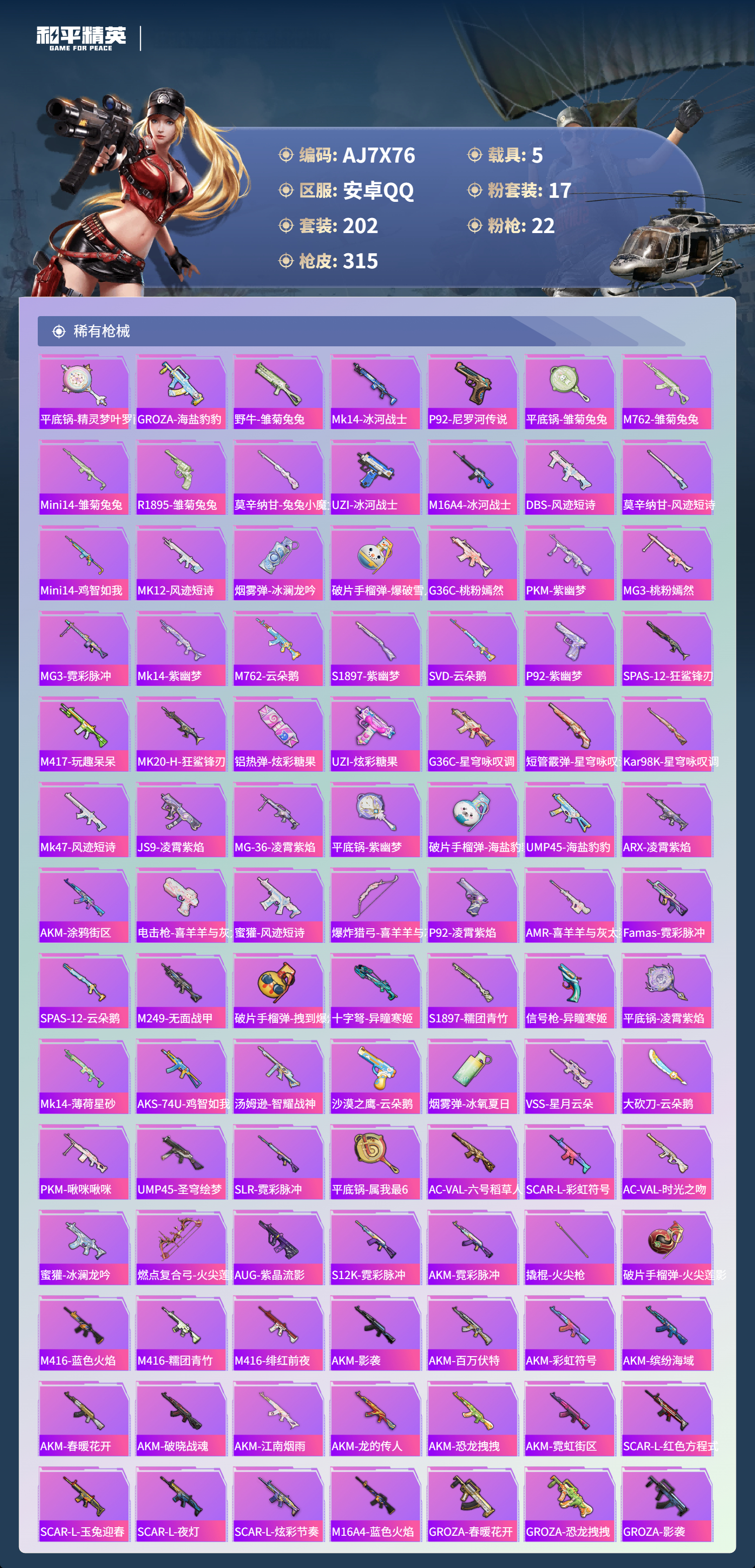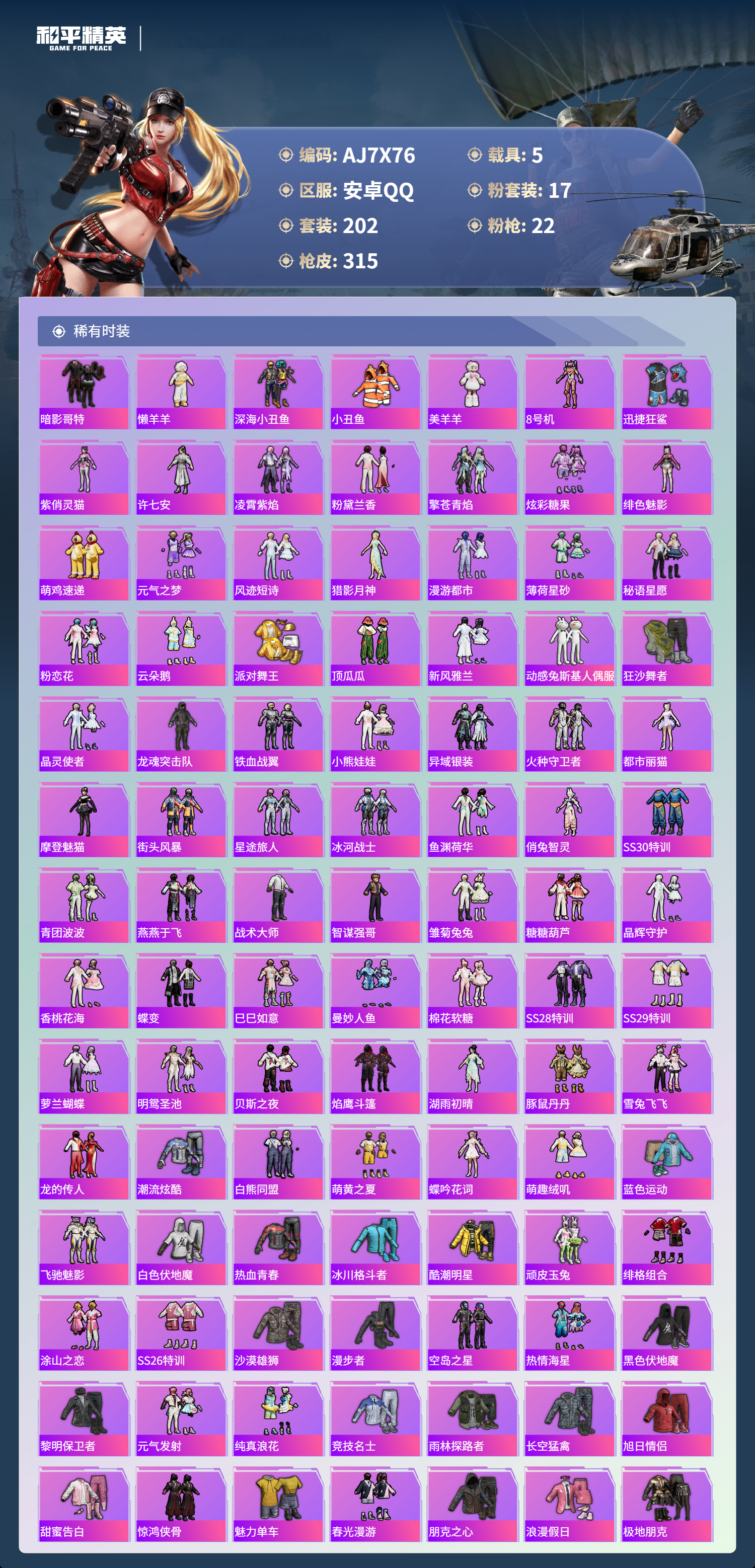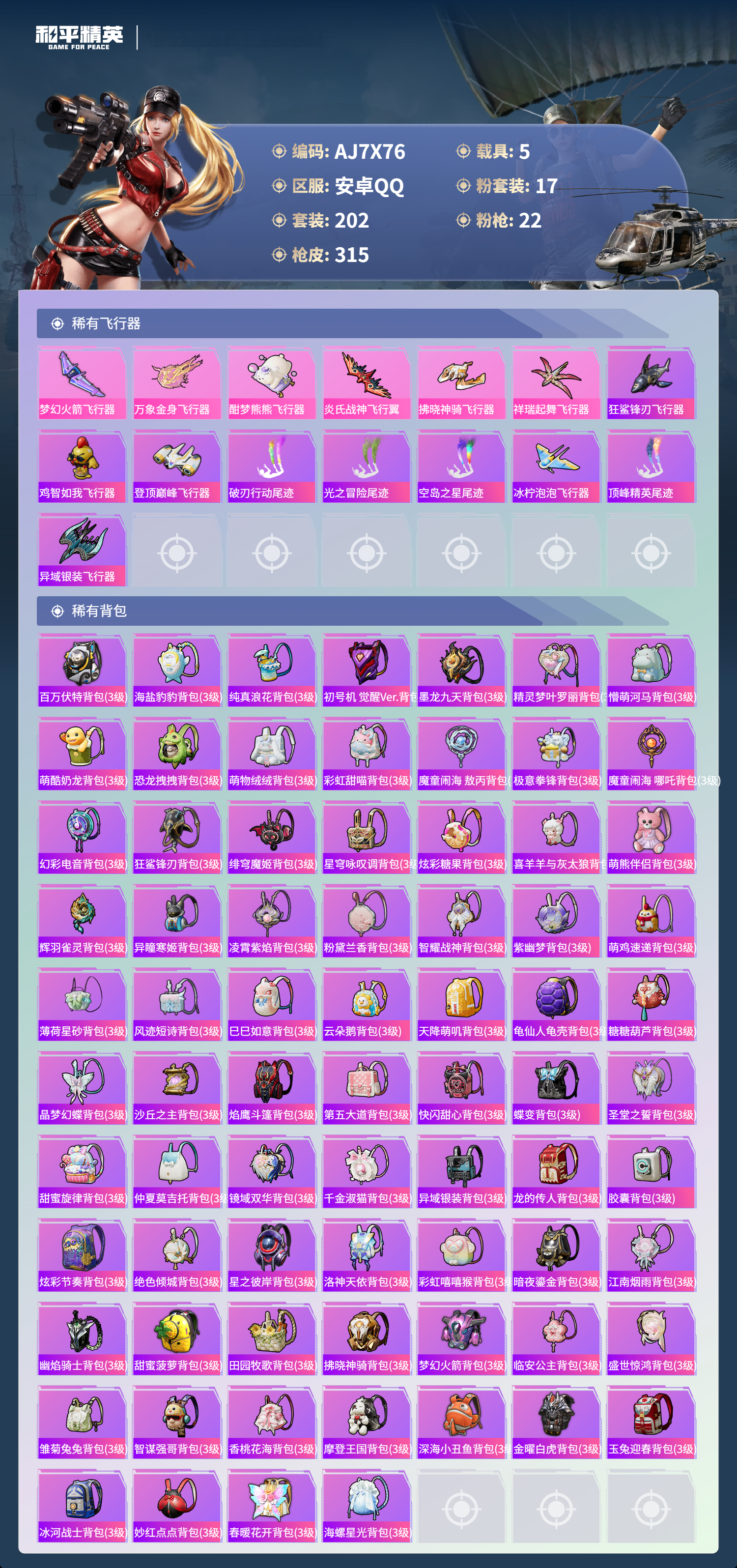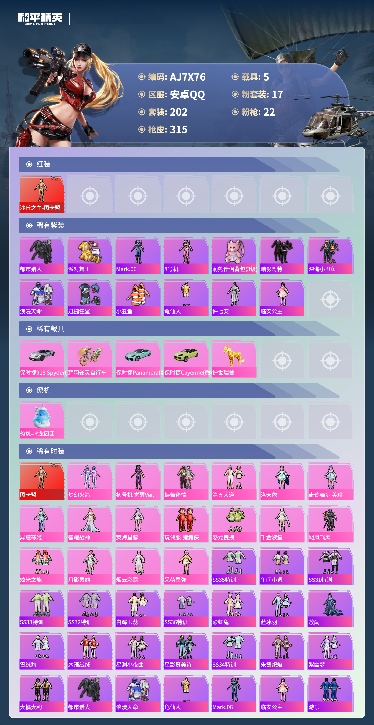 5载具-202套装-315呛皮-1红-16粉-21呛-5车-3级图卡盟觉醒螳螂-龙师傅外套-金手指-洛天依梦幻火箭-都市-金鞋-沙丘之主-哪吒闹海-幽焰骑士-保时捷卡宴-帕拉梅拉911-护世瑞兽-雀羽自行车-粉熊背包-猫包