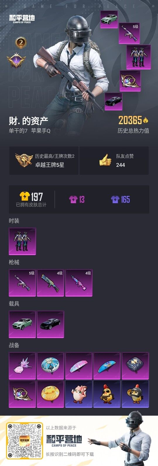[14508681]苹果 手q-1粉装-3特效呛-2载具-2粉色飞行器-20365热力值-2王牌印记-28套装-65呛皮 【粉色载具】:玛莎拉蒂quattropte(夜幕蓝),玛莎拉蒂grecale(薄荷绿) 【粉色套装】:粉装-碧穹智者 【粉色呛皮等级】:akm-星际浪客五级,野牛-青空秋雨四级,m249-蓝莓炮弹四级 【粉色呛皮】:akm-星际浪客,野牛-青空秋雨,m249-蓝莓炮弹 【粉色飞行器】:星际浪客飞行器 【粉色降落伞】:垂柳戏鸭降落伞,青空秋雨降落伞,音爆索尼克降落伞,异瞳寒姬降落伞 【稀有套装】:套装-炫彩糖果 【稀有呛皮】:aug-冰晶雪宝,akm-彩虹符号,akm-霓虹街区,m416-糯团青竹,m416-红色方程式,groza-异彩先驱,groza-田园牧歌,groza-蓝莓炮弹,m762-天降萌叽,m762-瑞龙福将,mk47-妙红点点,蜜獾-天降萌叽,蜜獾-娇憨猪猪,uzi-娇憨猪猪,ump45-蓝色火焰,vect-生命誓言,vect-田园牧歌,汤姆逊-天降萌叽,汤姆逊-异彩先驱,汤姆逊-炫彩节奏,mp5k-异彩先驱,mp5k-蓝莓炮弹,kar98k-红色方程式,kar98k-魅影蝠王,vss-田园牧歌,mini14-异彩先驱,mini14-春暖花开,win94-瑞龙福将,slr-彩虹符号,amr-妙红点点,s686-红色方程式,s12k-瑞龙福将,s12k-破晓战魂,s12k-娇憨猪猪,s12k-幻世战舞者,spas-12-田园牧歌,m249-妙红点点,mg3-妙红点点,mg3-幻世战舞者,mg3-瑞龙福将,大砍刀-青空秋雨 【其他套装】:套装-ss17特训,套装-ss18特训,套装-ss19特训,套装-ss20特训,套装-ss21特训,套装-ss22特训,套装-ss23特训,套装-幻世战舞者,套装-破蛋小黄鸡,套装-竞技名士,套装-绯格组合,套装-长空猛禽,套装-魅力单车,套装-梦魇先生,套装-瑞龙福将,套装-团圆交子,套装-异彩先驱,套装-霓虹极客,套装-萌趣咩咩,套装-田园牧歌,套装-轻风白浪,套装-幻彩翩翩,套装-飞狐塔尔斯 【营地id】:799753829