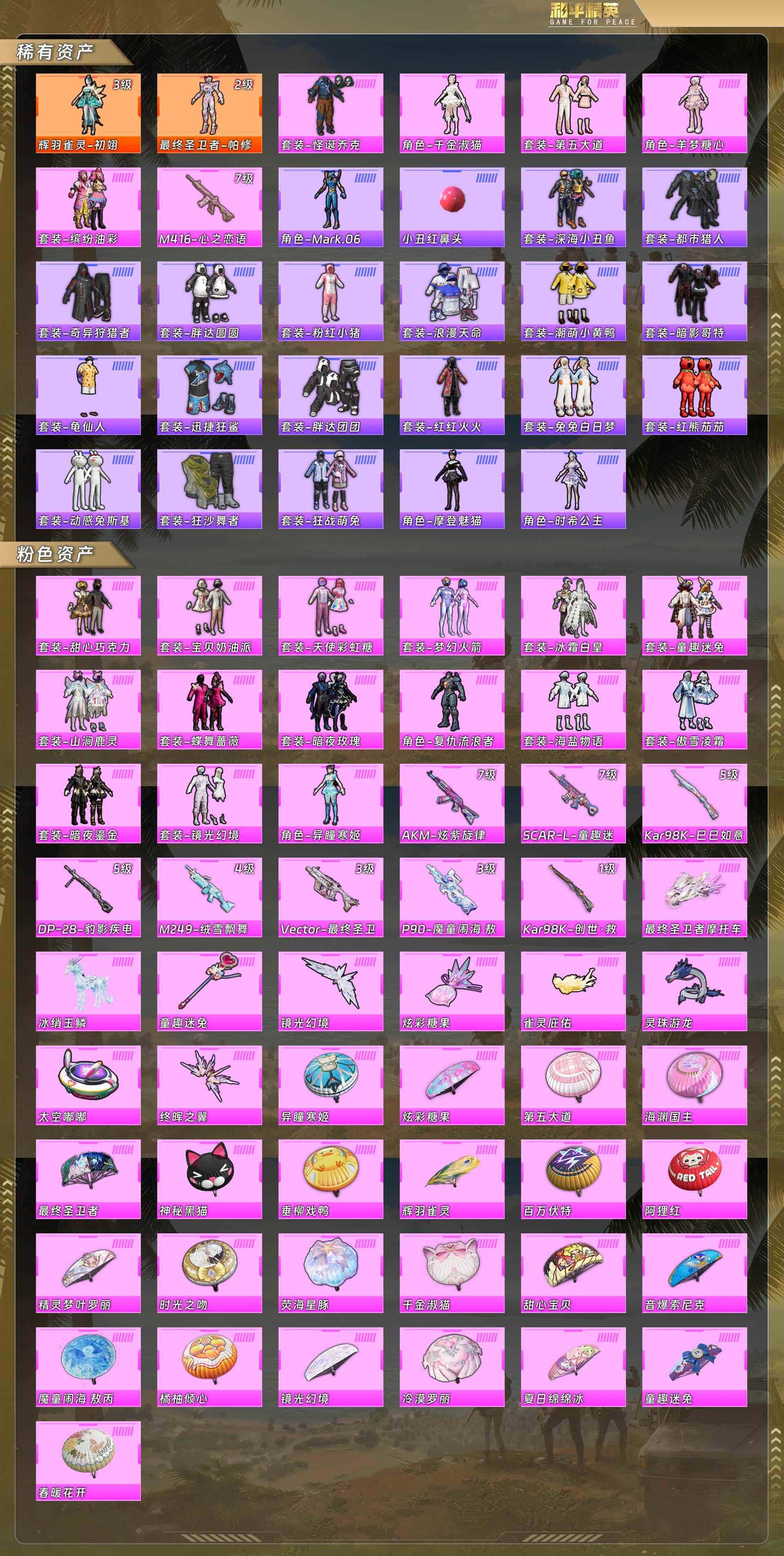 素材号-初翊3级/帕修斯2级/小丑/粉熊背包/国宝头盔/千金淑猫/第五大道/猪脸/深海小丑鱼/都市猎人/奇异狩猎者/浪漫天命/红眼罩/小番茄/甜心巧克力/梦幻火箭/童趣迷兔/山涧鹿灵/海盐物语/傲雪凌霜/暗夜鎏金/镜光幻境/异瞳寒姬/m4心之恋语7级/ak炫紫旋律7级/scar童趣迷兔7级/p90魔童闹海敖丙3级/最终圣卫者摩托车/冰绡玉鳞(2神装20粉套9粉呛2载具)没战神框hp4180-7粉色飞行器-97969热力值-14王牌印记-213套装-262呛皮 【红色神装等级】:最终圣卫者-帕修斯二级,辉羽雀灵-初翊三级 【红色角色神装】:最终圣卫者-帕修斯,辉羽雀灵-初翊 【热门品类】:粉装-怪诞乔克,粉装-梦幻火箭,粉装-童趣迷兔,粉装-缤纷油彩,套装-浪漫天命,套装-都市猎人,套装-深海小丑鱼,套装-小丑鱼,套装-奇异狩猎者,套装-胖达团团,套装-胖达圆圆,套装-动感兔斯基人偶服,套装-龟仙人,套装-潮萌小黄鸭,套装-暗影哥特,套装-粉红小猪,套装-红红火火,角色-mark.06,套装-红熊茄茄 【粉色载具】:最终圣卫者摩托车,冰绡玉鳞 【粉色套装】:粉装-怪诞乔克,粉装-甜心巧克力,粉装-宝贝奶油派,粉装-天使彩虹糖,粉装-梦幻火箭,粉装-缤纷油彩,粉装-冰霜白皇,粉装-童趣迷兔,粉装-蝶舞蔷薇,粉装-暗夜玫瑰,粉装-山涧鹿灵,粉装-海盐物语,角色-复仇流浪者,粉装-傲雪凌霜,粉装-暗夜鎏金,粉装-第五大道,粉装-镜光幻境,角色-千金淑猫,角色-羊梦糖心,角色-异瞳寒姬 【粉色呛皮等级】:akm-炫紫旋律七级,scar-l-童趣迷兔七级,m416-心之恋语七级,vect-最终圣卫者三级,p90-魔童闹海 敖丙三级,kar98k-创世·救赎一级,kar98k-巳巳如意五级,m249-绒雪飘舞四级,dp-28-豹影疾电五级 【粉色呛皮】:akm-炫紫旋律,scar-l-童趣迷兔,m416-心之恋语,vect-最终圣卫者,p90-魔童闹海 敖丙,kar98k-创世·救赎,kar98k-巳巳如意,m249-绒雪飘舞,dp-28-豹影疾电 【粉色飞行器】:童趣迷兔飞行器,太空嘟嘟飞行器,镜光幻境飞行翼,雀灵庇佑飞行器,终晖之翼飞行器,灵珠游龙飞行器 【粉色降落伞】:百万伏特降落伞,甜心宝贝降落伞,春暖花开降落伞,神秘黑猫降落伞,阿狸红降落伞,夏日绵绵冰降落伞,童趣迷兔降落伞,海渊国主降落伞,橘柚倾心降落伞,垂柳戏鸭降落伞,音爆索尼克降落伞,第五大道降落伞,镜光幻境降落伞,精灵梦叶罗丽降落伞,千金淑猫降落伞,辉羽雀灵降落伞,时光之吻降落伞,最终圣卫者降落伞,冷漠罗丽降落伞,荧海星豚降落伞,魔童闹海 敖丙降落伞,异瞳寒姬降落伞 【稀有套装】:套装-龟仙人,角色-摩登魅猫,套装-彩虹兔,套装-云朵鹅,套装-雪绒豹,套装-诡诞巡游,套装-混沌火种,角色-时希公主,角色-绛羽幽主,套装-朱霞炽焰,套装-凌霄紫焰,套装-擎苍青焰,角色-绯色魅影,角色-紫俏灵猫,套装-琴音绮想,套装-炫彩糖果 【稀有呛皮】:aug-冰晶雪宝,akm-夜灯,akm-彩虹符号,akm-影袭,akm-灼热熔岩,akm-筑梦精灵,akm-萌趣颜团子,akm-虎虎生威,akm-阿狸红,akm-霓虹街区,akm-龙的传人,m16a4-夜灯,m16a4-幻世战舞者,m16a4-甜心亚梦,m16a4-最终圣卫者,scar-l-炫彩节奏,scar-l-玉兔迎春,scar-l-甜蜜誓约,m416-糯团青竹,m416-绯红前夜,m416-蓝色火焰,groza-异彩先驱,groza-彩虹符号,groza-影袭,groza-林间仙鹿,groza-治愈之星,groza-田园牧歌,aug-天降萌叽,aug-耀粉歌者,aug-青春冒险家,q-彩虹符号,q-诡娃娃,q-飞驰魅影,m762-天降萌叽,m762-奇异狩猎者,m762-瑞龙福将,m762-甜心宝贝,m762-第五大道,m762-绒雪飘舞,m762-绯红前夜,m762-萌物绒绒,m762-镭射皇者,m762-云朵鹅,mk47-妙红点点,mk47-百万伏特,mk47-青春冒险家,g36c-时空追击者,ac-val-天降萌叽,ac-val-彩虹甜喵,ac-val-甜心亚梦,蜜獾-垂柳戏鸭,蜜獾-天降萌叽,蜜獾-娇憨猪猪,ace32-画境星梦,arx-凌霄紫焰,uzi-啾咪啾咪,uzi-天降萌叽,uzi-娇憨猪猪,uzi-影袭,uzi-炫彩节奏,uzi-红色方程式,ump45-夜灯,ump45-怪兽之王,ump45-时空追击者,ump45-海渊国主,ump45-生命誓言,ump45-粉色回忆,ump45-金玉无双,vect-夜灯,vect-彩虹符号,vect-暗夜玫瑰,vect-治愈之星,vect-生命誓言,vect-田园牧歌,vect-音爆索尼克,汤姆逊-奇异狩猎者,汤姆逊-异彩先驱,汤姆逊-炫彩节奏,汤姆逊-耀粉歌者,野牛-夜灯,野牛-青春冒险家,野牛-最终圣卫者,mp5k-异彩先驱,mp5k-甜蜜誓约,mp5k-画境星梦,aks-74u-辉羽雀灵,js9-凌霄紫焰,p90-飞驰魅影,p90-巳巳如意,kar98k-彩虹符号,kar98k-影袭,kar98k-梦幻火箭,kar98k-王子的夏天,kar98k-飞驰魅影,kar98k-最终圣卫者,m24-影袭,m24-治愈之星,m24-炫彩节奏,m24-幻彩电音,awm-垂柳戏鸭,sks-时空追击者,sks-炫彩节奏,vss-呛炮玫瑰,vss-田园牧歌,vss-绿野极光,vss-镭射皇者,mini14-异彩先驱,mini14-星夜魔法师,mini14-春暖花开,mini14-梦幻火箭,mini14-炫彩节奏,mini14-穿刺龙虾,mini14-阿狸红,mini14-绯穹魔姬,mk14-治愈之星,mk14-童趣迷兔,win94-瑞龙福将,slr-娇憨猪猪,slr-彩虹符号,qbu-青春冒险家,amr-妙红点点,amr-镜光幻境,m417-绒雪飘舞,m200-爆裂游戏,svd-云朵鹅,m1加兰德-画境星梦,s686-奇异狩猎者,s686-彩虹符号,s686-生命誓言,s686-千金淑猫,s1897-呛炮玫瑰,s1897-炫彩节奏,s1897-百万伏特,s1897-神秘黑猫,s1897-镭射皇者,s1897-飞驰魅影,s1897-荧海星豚,s12k-瑞龙福将,s12k-童趣迷兔,s12k-音爆索尼克,s12k-垂柳戏鸭,s12k-娇憨猪猪,s12k-幻世战舞者,s12k-极意拳锋,dbs-时空追击者,dbs-甜心亚梦,dbs-第五大道,dbs-荧海星豚,spas-12-田园牧歌,spas-12-云朵鹅,m249-妙红点点,m249-彩虹符号,m249-镭射皇者,m249-绯穹魔姬,dp-28-彩虹符号,dp-28-旋转彩虹,dp-28-橘柚倾心,dp-28-甜心亚梦,dp-28-甜心宝贝,mg3-妙红点
