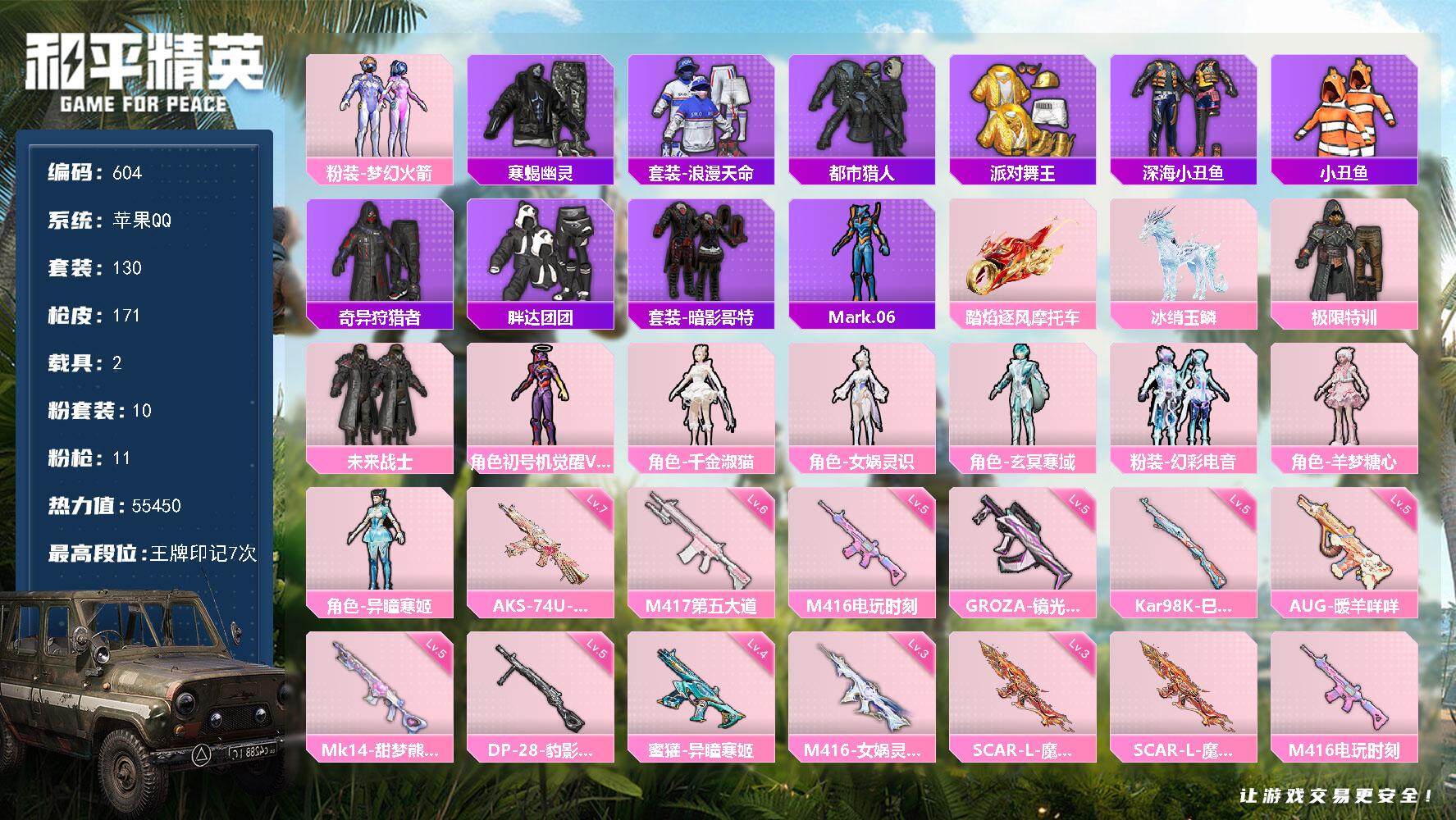 [14510713]苹果 手q-10粉装-11特效呛-2载具-6粉色飞行器-55450热力值-7王牌印记-130套装-171呛皮 【热门品类】:粉装-梦幻火箭,套装-寒蝎幽灵,套装-浪漫天命,套装-都市猎人,套装-派对舞王,套装-深海小丑鱼,套装-小丑鱼,套装-奇异狩猎者,套装-胖达团团,套装-暗影哥特,角色-mark.06 【粉色载具】:踏焰逐风摩托车,冰绡玉鳞 【粉色套装】:粉装-极限特训,粉装-未来战士,粉装-梦幻火箭,角色-初号机 觉醒ver.,角色-千金淑猫,角色-女娲灵识,角色-玄冥寒域,粉装-幻彩电音,角色-羊梦糖心,角色-异瞳寒姬 【粉色呛皮等级】:scar-l-魔童闹海 哪吒三级,m416-电玩时刻五级,m416-女娲灵识三级,groza-镜光银凌五级,aug-暖羊咩咩五级,蜜獾-异瞳寒姬四级,aks-74u-星穹咏叹调七级,kar98k-巳巳如意五级,mk14-甜梦熊击五级,m417-第五大道六级,dp-28-豹影疾电五级 【粉色呛皮】:scar-l-魔童闹海 哪吒,m416-电玩时刻,m416-女娲灵识,groza-镜光银凌,aug-暖羊咩咩,蜜獾-异瞳寒姬,aks-74u-星穹咏叹调,kar98k-巳巳如意,mk14-甜梦熊击,m417-第五大道,dp-28-豹影疾电 【粉色飞行器】:天之羽翼飞行器,星夜魔法师飞行翼,飞天猪飞行器,灵珠游龙飞行器 【粉色降落伞】:未来战士降落伞,梦幻火箭降落伞,星夜魔法师降落伞,千面幻镜降落伞,第五大道降落伞,萌物绒绒降落伞,创世·救赎降落伞,金丰海韵降落伞,鬼刀降落伞,樱桃泡泡降落伞,圣域龙灵降落伞,喜羊羊与灰太狼降落伞,魔童闹海 哪吒降落伞,魔童闹海 敖丙降落伞,异瞳寒姬降落伞 【稀有套装】:套装-巳巳如意,套装-雏菊兔兔,套装-萝兰蝴蝶,套装-小熊娃娃,套装-先驱飞行员,套装-糖糖葫芦,套装-青团波波,套装-棉花软糖,角色-光矢逐梦,套装-燕燕于飞,套装-鱼渊荷华,套装-晶辉守护,角色-糖霜甜心,套装-雪夜云雾,套装-粉恋花,套装-紫幽梦,套装-蓝冰羽,套装-虚空漩涡,套装-朱霞炽焰,套装-凌霄紫焰,套装-擎苍青焰,玩偶服-懒羊羊,玩偶服-美羊羊,玩偶服-喜羊羊,角色-绯色魅影,角色-紫俏灵猫,套装-炫彩糖果 【稀有呛皮】:aug-冰晶雪宝,akm-奇异狩猎者,akm-影袭,a