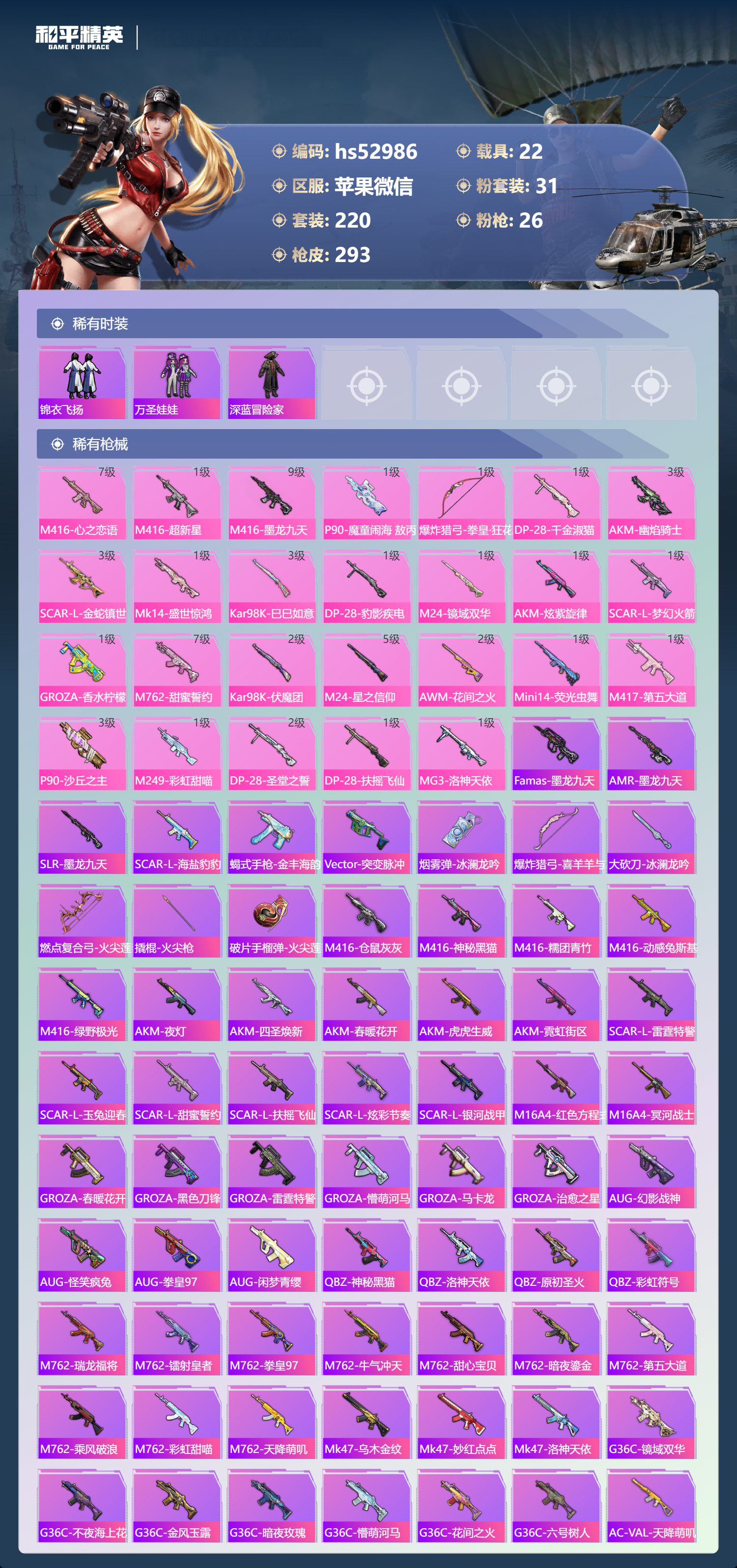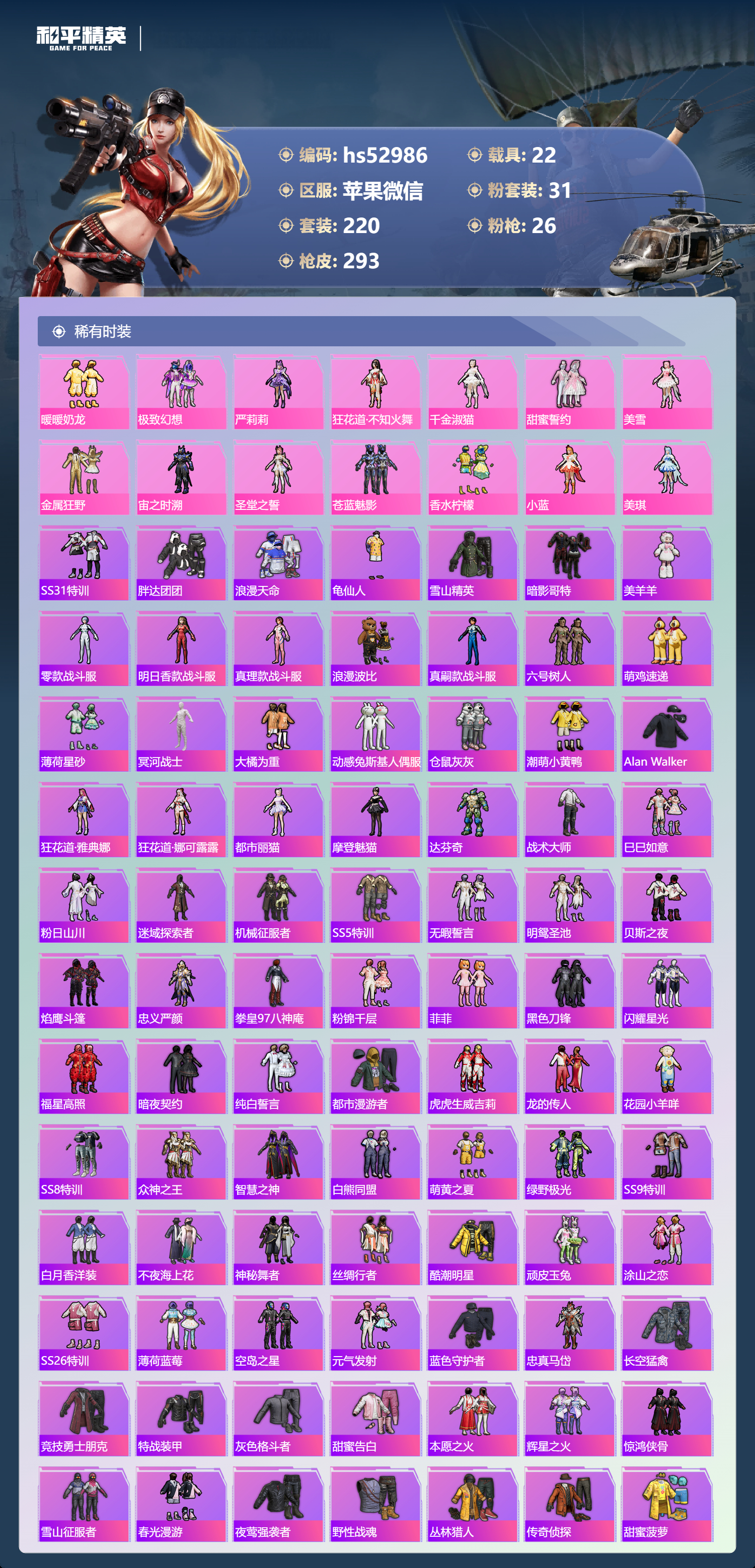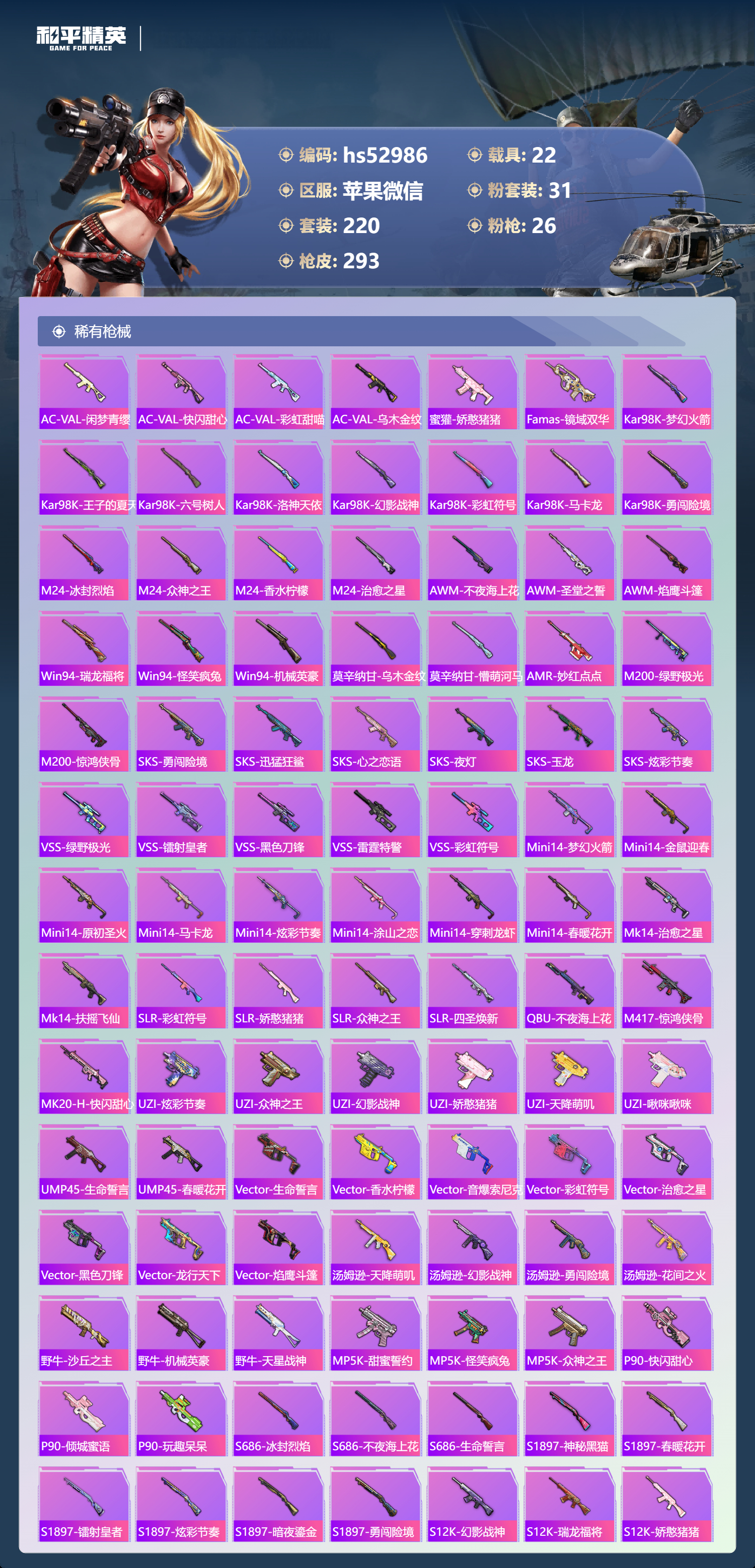 2301717苹果微信-9王牌印记-4红装-31粉装-26特效呛-22载具-热力值-220套装-293呛皮-2卓越印记-2传奇印记 【4红装】魔童闹海-哪吒/1级镜域双华-欧若拉/1级墨龙九天-敖渊/1级沙丘之主-图卡盟/6级 【31粉装】套装-极致幻想角色-零号机款机体服套装-新星烈龙套装-缤纷油彩角色-美雪套装-宝贝奶油派角色-圣堂之誓套装-梦幻火箭角色-严莉莉