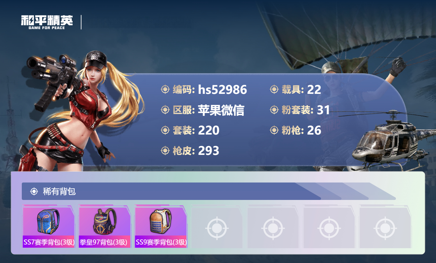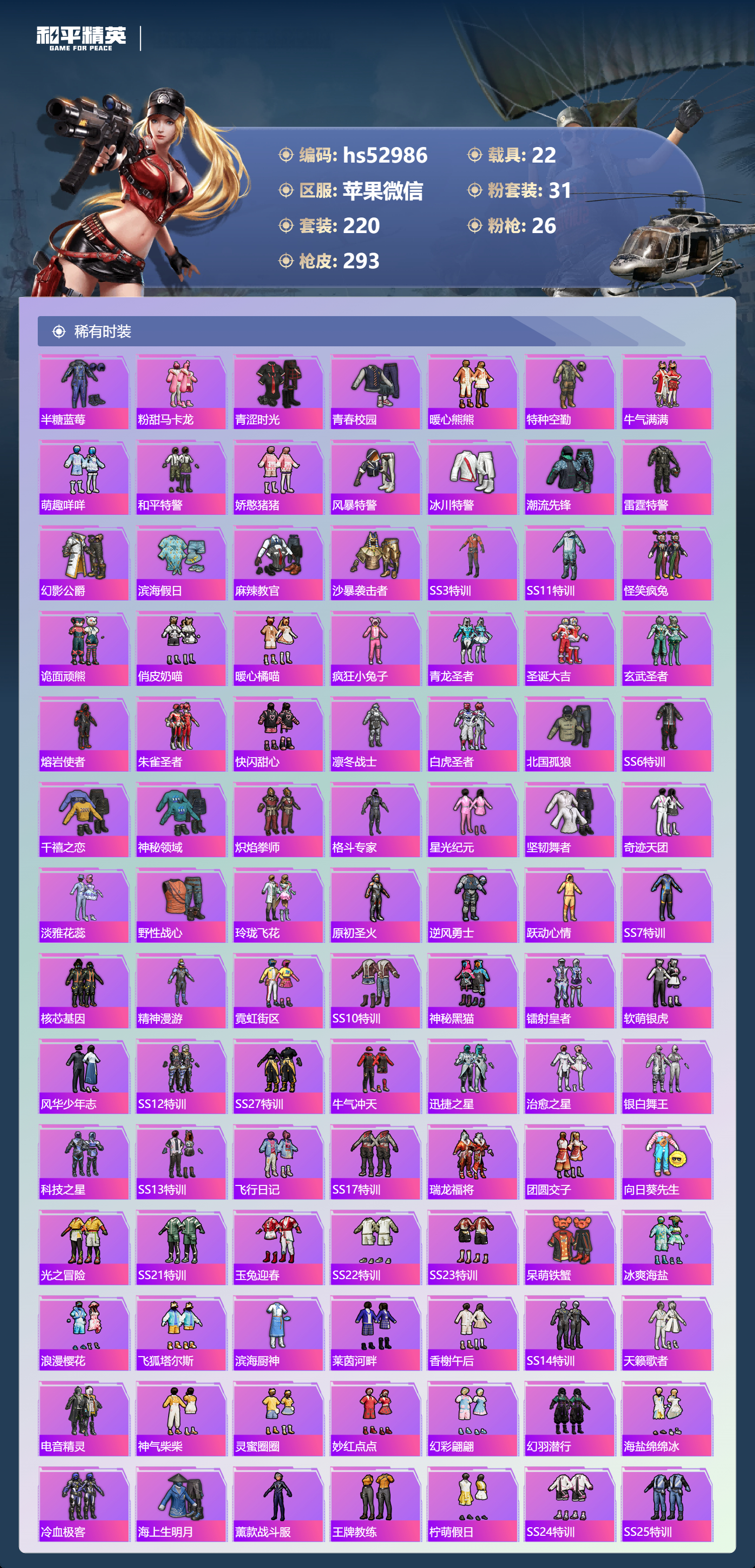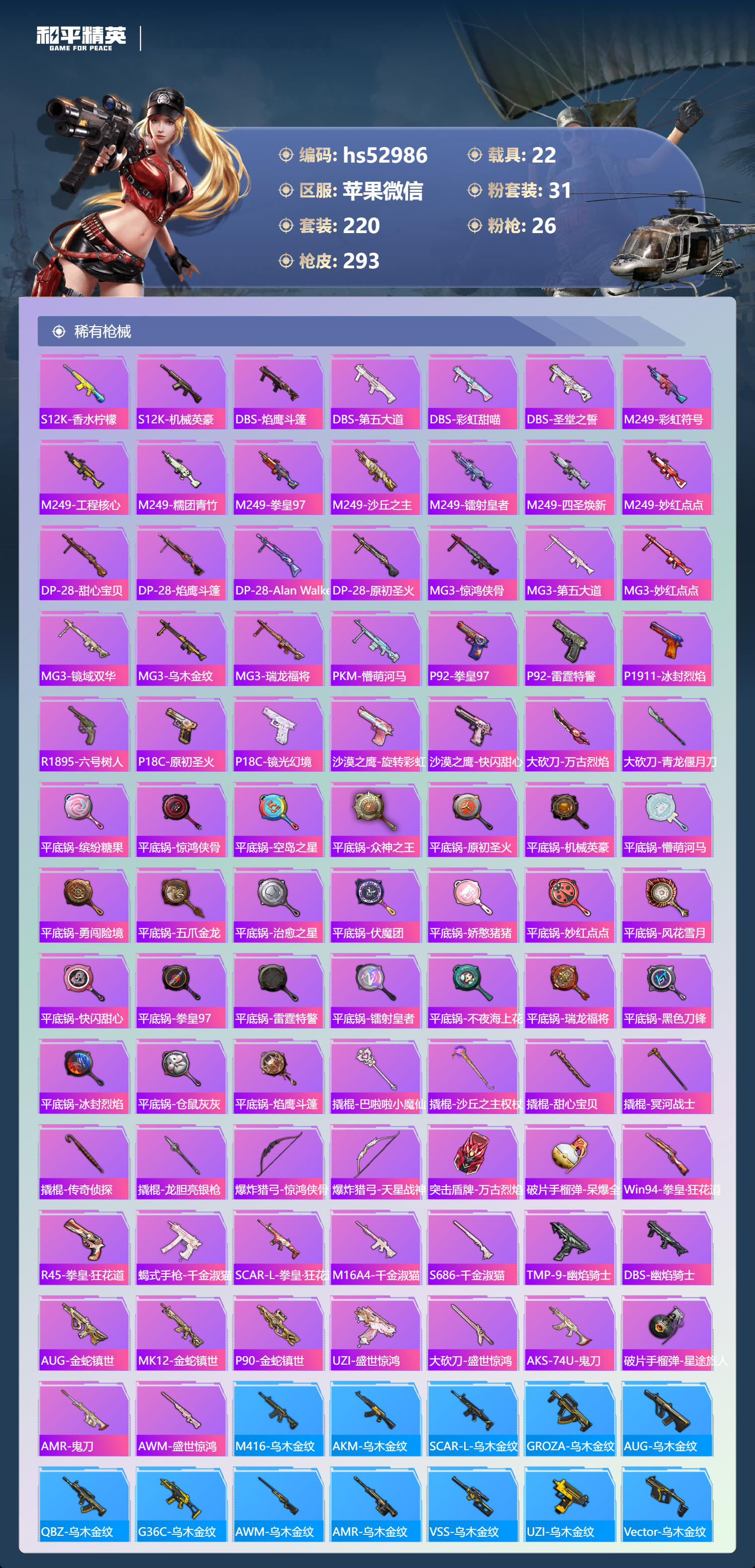 2301717苹果微信-9王牌印记-4红装-31粉装-26特效呛-22载具-热力值-220套装-293呛皮-2卓越印记-2传奇印记 【4红装】魔童闹海-哪吒/1级镜域双华-欧若拉/1级墨龙九天-敖渊/1级沙丘之主-图卡盟/6级 【31粉装】套装-极致幻想角色-零号机款机体服套装-新星烈龙套装-缤纷油彩角色-美雪套装-宝贝奶油派角色-圣堂之誓套装-梦幻火箭角色-严莉莉