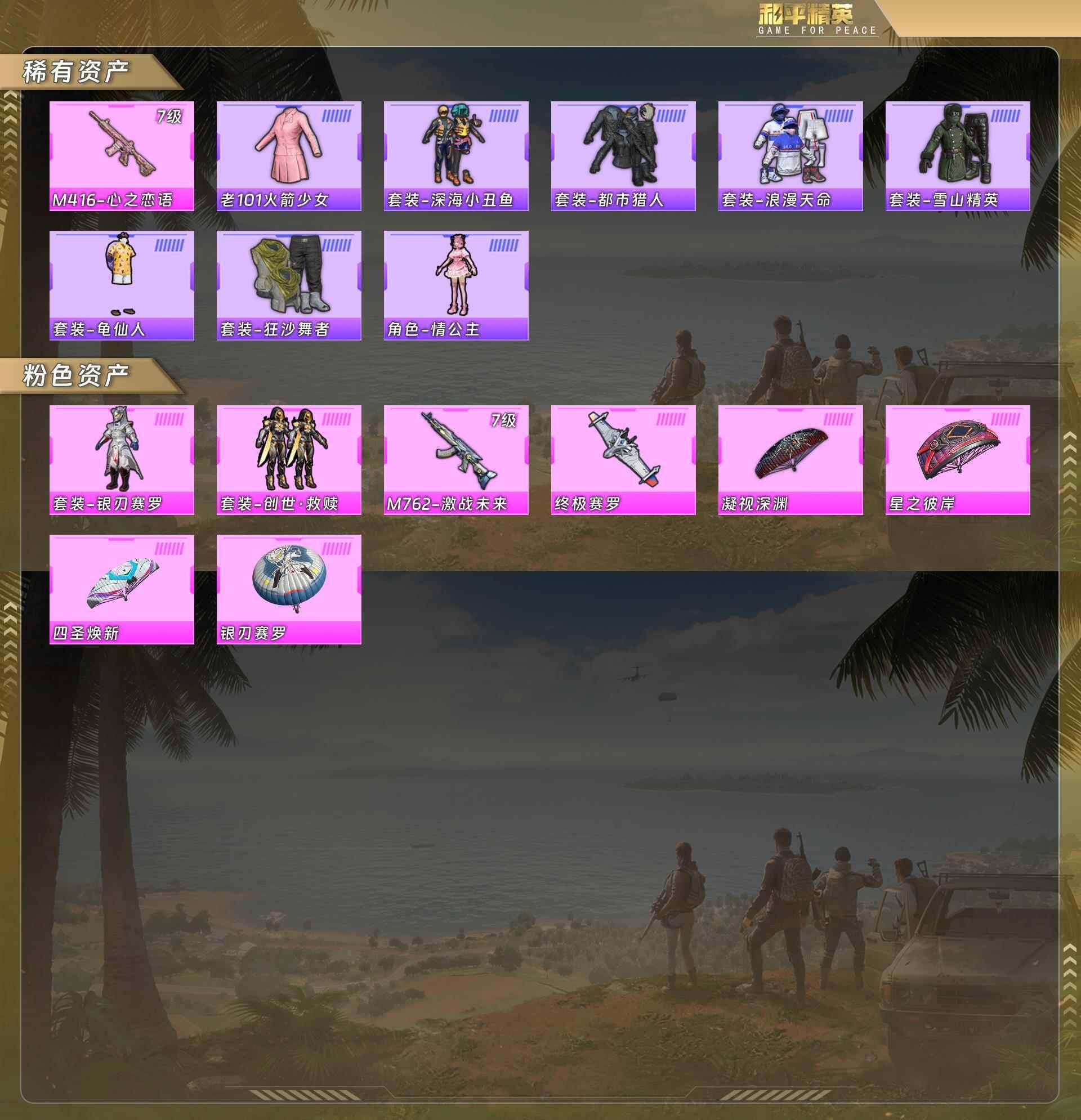 素材号-老101/粉熊背包/都市/浪漫天命/老六服/深海小丑鱼/银刃赛罗/创世·救赎【呛皮】m762激战未来7级/m4心之恋语7级 没战神框(2粉套2粉呛)hp4197-1粉色飞行器-53222热力值-14王牌印记-138套装-177呛皮 【热门品类】:套装-浪漫天命,套装-火箭少女101,套装-都市猎人,套装-深海小丑鱼,旭日初心兜帽大衣,套装-龟仙人 【粉色套装】:粉装-银刃赛罗,套装-创世·救赎 【粉色呛皮等级】:m416-心之恋语七级,m762-激战未来七级 【粉色呛皮】:m416-心之恋语,m762-激战未来 【粉色飞行器】:终极赛罗飞行器 【粉色降落伞】:凝视深渊降落伞,四圣焕新降落伞,银刃赛罗降落伞,星之彼岸降落伞 【稀有套装】:套装-龟仙人 【稀有呛皮】:akm-2p战斗服款,akm-夜灯,akm-彩虹符号,akm-影袭,akm-灼热熔岩,akm-玉龙,akm-生命誓言,akm-萌趣颜团子,akm-虎虎生威,akm-霓虹街区,akm-龙的传人,m16a4-夜灯,m16a4-幻世战舞者,m16a4-机械英豪,m16a4-生命誓言,m16a4-红色方程式,m16a4-蓝色火焰,scar-l-玉兔迎春,scar-l-红色方程式,scar-l-黄金龙骨,m416-夜灯,m416-滑板小狐,m416-糯团青竹,m416-红色方程式,m416-绯红前夜,m416-蓝色火焰,groza-彩虹符号,groza-影袭,groza-治愈之星,groza-生命誓言,groza-黑色刀锋,aug-凝视深渊,aug-青春冒险家,q-原初圣火,q-赛罗,m762-天降萌叽,m762-牛气冲天,m762-瑞龙福将,m762-生命誓言,m762-绯红前夜,m762-镭射皇者,mk47-炫光之旅,mk47-青春冒险家,g36c-不夜海上花,g36c-时空追击者,g36c-暗夜玫瑰,ac-val-天降萌叽,蜜獾-天降萌叽,uzi-天降萌叽,uzi-影袭,uzi-炫彩节奏,ump45-夜灯,ump45-时空追击者,ump45-生命誓言,ump45-诡娃娃,ump45-金玉无双,vect-焰鹰斗篷,vect-彩虹符号,vect-暗夜玫瑰,vect-治愈之星,vect-生命誓言,vect-香水柠檬,汤姆逊-天降萌叽,汤姆逊-银刃赛罗,野牛-机械英豪,野牛-青春冒险家,p90-倾城蜜语,kar98k-彩虹符号,kar98k-影袭,kar98k-王子的夏天,kar98k-红色方程式,kar98k-终极赛罗,m24-影袭,m24-治愈之星,awm-焰鹰斗篷,awm-不夜海上花,sks-夜灯,sks-心之恋语,sks-时空追击者,sks-炫彩节奏,vss-镭射皇者,mini14-原初圣火,mini14-春暖花开,mini14-生命誓言,mini14-金鼠迎春,mk14-治愈之星,win94-怪笑疯兔,win94-机械英豪,win94-瑞龙福将,qbu-不夜海上花,qbu-青春冒险家,m417-惊鸿侠骨,m200-惊鸿侠骨,s686-不夜海上花,s686-生命誓言,s686-红色方程式,s1897-炫彩节奏,s1897-镭射皇者,s12k-瑞龙福将,s12k-夜灯,s12k-机械英豪,dbs-焰鹰斗篷,dbs-时空追击者,m249-彩虹符号,m249-破晓战魂,m249-镭射皇者,dp-28-焰鹰斗篷,dp-28-原初圣火,dp-28-彩虹符号,dp-28-甜心宝贝,dp-28-锦绣火鲤,mg3-幻世战舞者,mg3-惊鸿侠骨,mg3-瑞龙福将,p18c-原初圣火,爆炸猎弓-惊鸿侠骨 【其他套装】:套装-ss2特训,套装-ss3特训,套装-ss4特训,套装-ss5特训,套装-ss6特训,套装-ss7特训,套装-ss8特训,套装-ss9特训,套装-ss10特训,套装-ss11特训,套装-ss12特训,套装-ss13特训,套装-ss14特训,套装-ss15特训,套装-ss16特训,套装-ss17特训,套装-ss18特训,套装-ss19特训,套装-ss20特训,套装-ss21特训,套装-ss22特训,套装-ss24特训,套装-ss25特训,套装-ss26特训,套装-ss27特训,套装-ss28特训,套装-决胜时刻,套装-冷焰舞者,套装-北国孤狼,套装-吉莉礼服,套装-夏日音浪,套装-帅气教官,套装-幻影武者,套装-战地督导,套装-探宝勇士,套装-春日漫步,套装-格斗先锋,套装-沙漠兵团,套装-浪漫天命,套装-海上生明月,套装-海岛探路者,套装-海滨突袭者,套装-深蓝色名流,套装-游猎者,套装-滨海假日,套装-滨海厨神,套装-灰色格斗者,套装-炫蓝之夏,套装-燃烧卡路里,套装-牛气冲天,套装-牛气满满,套装-特战装甲,套装-特种颜团子,套装-狂沙舞者,套装-玉兔迎春,套装-甜蜜告白,套装-甜蜜熊情侣,套装-疯狂小兔子,套装-白色伏地魔,套装-破蛋小黄鸡,套装-福星高照,套装-竞技勇士朋克,套装-竞技名士,套装-绮丽涂鸦,套装-绯格组合,套装-缤纷果语,套装-耀眼新星,套装-荣耀,套装-萌趣颜团子,套装-萌黄之夏,套装-蓝彩潮人,套装-蓝色守护者,套装-蓝色运动,套装-虎虎生威吉莉,套装-街头潮人,套装-跃动心情,套装-都市魅力,套装-酒红色名流,套装-野性战魂,套装-金鼠迎春,套装-长空猛禽,套装-霓虹街区,套装-青春校园,套装-青涩时光,套装-飞行日记,套装-魅力单车,套装-黄色名流,套装-黎明保卫者,套装-黑色伏地魔,套装-龙的传人,套装-龟仙人,套装-刚毅裁决者,套装-鹰眼刺客,套装-冰冻风暴,套装-漫步者,套装-战地菁英,套装-极地朋克,套装-深海小丑鱼,套装-呆萌铁蟹,套装-夜莺强袭者,套装-冰川特警,套装-wifi精灵,套装-坚韧舞者,套装-雪山精英,套装-白月香洋装,套装-风华少年志,套装-机械英豪,套装-机械征服者,套装-原初圣火,套装-逆风勇士,套装-青龙圣者,套装-镭射皇者,套装-银白舞王,套装-诡谋托雷基亚,套装-骁骑迪迦,套装-治愈之星,套装-迅捷之星,套装-科技之星,套装-青春冒险家,套装-潮流游乐家,套装-暴风机械师,套装-时空追击者,套装-瑞龙福将,套装-团圆交子,套装-惊鸿侠骨,套装-锦衣飞扬,套装-焰鹰斗篷,套装-幻羽潜行,角色-情公主,套装-纯真浪花,套装-热情海星 【稀有头盔】:百万伏特头盔1级,心之恋语头盔3级,心之恋语头盔2级,心之恋语头盔1级 【稀有背包】:萌熊伴侣背包3级,萌熊伴侣背包2级,萌熊伴侣背包1级,神秘黑猫背包1级,古堡领主背包3级,金羽特工背包2级 【营地id】:706184772