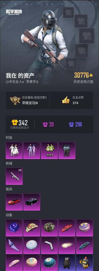 [14513104]苹果 【公主号 心之回忆/梦幻火箭/玛莎拉蒂quattropte/】手q-4粉装-1特效呛-2载具-3粉色飞行器-30776热力值-1王牌印记-72套装-83呛皮 【热门品类】:粉装-梦幻火箭,大砍刀-青龙偃月刀 【粉色载具】:玛莎拉蒂quattropte(夜幕蓝),仰望u9(赤霞丹朱) 【粉色套装】:粉装-梦幻火箭,粉装-显圣真君,粉装-恐龙拽拽,粉装-心之回忆 【粉色呛皮等级】:scar-l-纯梦嫁纱五级 【粉色呛皮】:scar-l-纯梦嫁纱 【粉色飞行器】:梦幻火箭飞行器,齐天大圣飞行器,天之羽翼飞行器 【粉色降落伞】:甜心宝贝降落伞,梦幻火箭降落伞,繁花小夜曲降落伞,心之恋语降落伞,夏日绵绵冰降落伞,暗夜玫瑰降落伞,彩虹甜喵降落伞,暗夜鎏金降落伞,苔丝玫瑰降落伞,宇宙意志降落伞 【稀有套装】:角色-多纳泰罗 【稀有呛皮】:akm-四圣焕新,akm-萝萝小趴兔,akm-虎虎生威,m16a4-机械英豪,scar-l-炫彩节奏,scar-l-碧影闪光,m416-糯团青竹,groza-马卡龙,aug-黑白懵懵牛,q-原初圣火,q-彩虹符号,q-飞驰魅影,m762-牛气冲天,m762-瑞龙福将,g36c-时空追击者,uzi-墨染幽兰,uzi-炫彩节奏,ump45-夜灯,ump45-时空追击者,ump45-生命誓言,ump45-蓝色火焰,vect-炎氏战神,vect-生命誓言,野牛-机械英豪,野牛-粉锦千层,p90-飞驰魅影,kar98k-炫彩节奏,kar98k-红色方程式,kar98k-飞驰魅影,awm-庄周梦蝶,sks-心之恋语,sks-时空追击者,vss-繁花小夜曲,mini14-原初圣火,mini14-旋转彩虹,mini14-梦幻火箭,mini14-炫彩节奏,win94-机械英豪,win94-瑞龙福将,slr-四圣焕新,slr-彩虹符号,qbu-飒粉甜心,m417-星兔领航员,s686-生命誓言,s1897-飞驰魅影,s12k-玩趣呆呆,s12k-瑞龙福将,s12k-机械英豪,dbs-彩虹甜喵,dbs-时空追击者,dbs-暗星紫秘,dp-28-原初圣火,dp-28-锦绣火鲤,mg3-瑞龙福将,p18c-原初圣火,p18c-镜光幻境,tmp-9-未来歌姬,大砍刀-青龙偃月刀 【其他套装】:套装-ss11特训,套装-ss12特训,套
