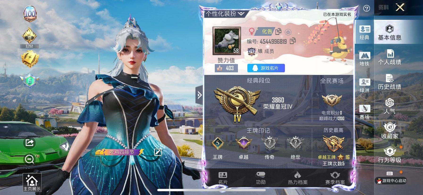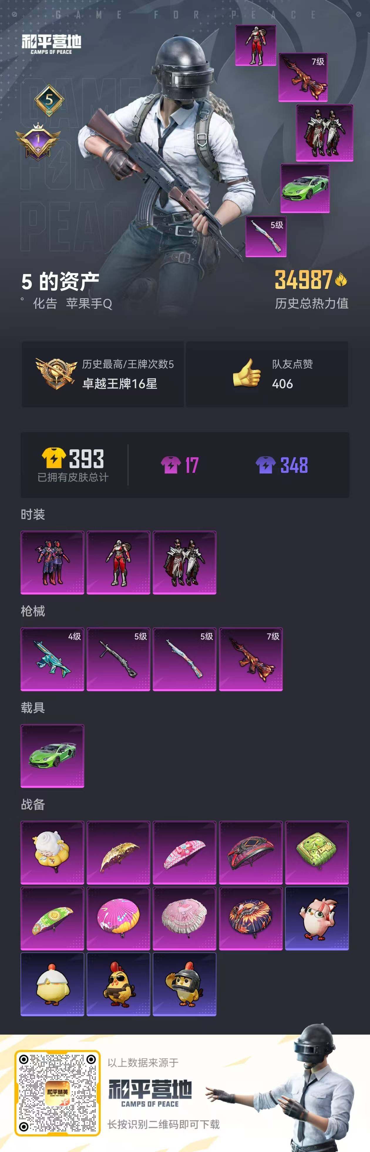 _2302125-手q-3粉装-4特效呛-1载具-0粉色飞行器-34987热力值-5王牌印记-89套装-106呛皮 【热门品类】:套装-龟仙人 【粉色载具】:兰博基尼aventadsvj(翡翠绿) 【粉色套装】:粉装-星之彼岸,粉装-沙场疾风,角色-阿尔茜 【粉色呛皮等级】:m416-风花雪月七级,蜜獾-异瞳寒姬四级,kar98k-巳巳如意五级,dp-28-豹影疾电五级 【粉色呛皮】:m416-风花雪月,蜜獾-异瞳寒姬,kar98k-巳巳如意,dp-28-豹影疾电 【粉色降落伞】:甜蜜誓约降落伞,星之彼岸降落伞,风花雪月降落伞,蓝莓炮弹降落伞,碧影闪光降落伞,恐龙拽拽降落伞,樱桃泡泡降落伞,圣域龙灵降落伞,喜羊羊与灰太狼降落伞 【稀有套装】:套装-龟仙人,套装-巳巳如意,套装-燕燕于飞,套装-鱼渊荷华,角色-蜜桃派对,套装-朱霞炽焰,套装-凌霄紫焰,套装-擎苍青焰,玩偶服-美羊羊,角色-紫俏灵猫 【稀有呛皮】:akm-彩虹符号,akm-恐龙拽拽,akm-破晓战魂,akm-虎虎生威,akm-霓虹街区,akm-龙的传人,m16a4-幻世战舞者,scar-l-玉兔迎春,m416-夜灯,m416-蓝色火焰,groza-异彩先驱,groza-酷泡奶龙,q-洛神天依,q-飞驰魅影,m762-瑞龙福将,m762-风花雪月,g36c-暗夜玫瑰,蜜獾-垂柳戏鸭,蜜獾-娇憨猪猪,arx-凌霄紫焰,uzi-娇憨猪猪,uzi-炫彩节奏,ump45-仲夏莫吉托,ump45-生命誓言,vect-生命誓言,汤姆逊-异彩先驱,mp5k-异彩先驱,js9-凌霄紫焰,p90-筑梦精灵,p90-飞驰魅影,p90-巳巳如意,kar98k-炫彩节奏,kar98k-蓝莓炮弹,kar98k-飞驰魅影,awm-垂柳戏鸭,awm-雷霆特警,sks-未来歌姬,mini14-异彩先驱,win94-瑞龙福将,slr-娇憨猪猪,amr-喜羊羊与灰太狼,s1897-炫彩节奏,s1897-飞驰魅影,s12k-瑞龙福将,s12k-垂柳戏鸭,s12k-娇憨猪猪,s12k-幻世战舞者,mg3-瑞龙福将,mg3-第五大道,mg-36-凌霄紫焰,p92-凌霄紫焰,爆炸猎弓-喜羊羊与灰太狼,平底锅-凌霄紫焰,破片手留单-巳巳如意 【其他套装】:套装-ss17特训,套装-ss18特训,套装-ss19特训,套装-ss2