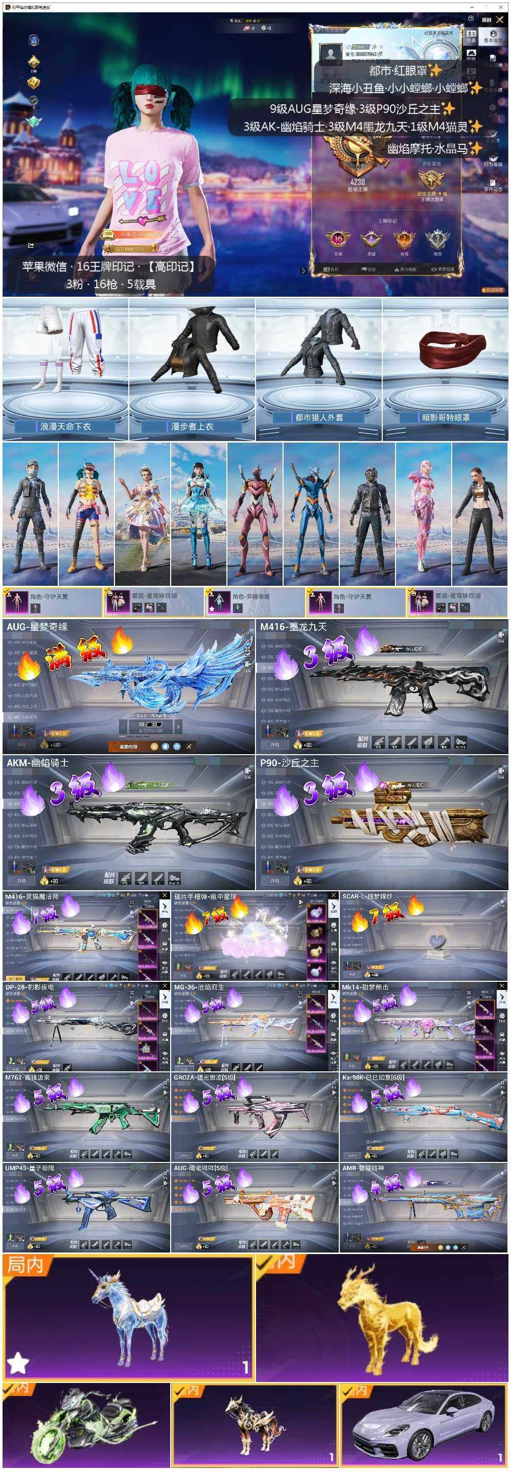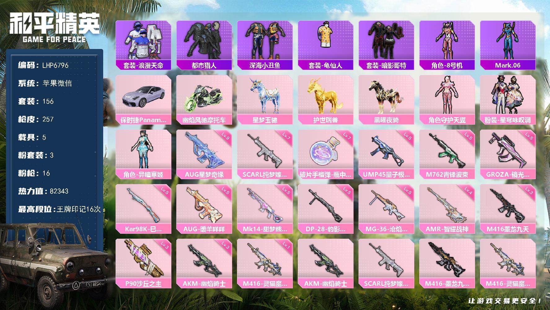 [14514861]素材身法号/地铁满天赋/aug-星梦奇缘九级 苹果 微信-3粉装-16特效呛-5载具-8粉色飞行器-8.2w热力值-16王牌印记-156套装-257呛皮【热门品类】:套装-浪漫天命,套装-都市猎人,套装-深海小丑鱼,套装-龟仙人,套装-暗影哥特,角色-8号机,角色-mark.06【粉色载具】:保时捷panamera(星辰紫),幽焰风驰摩托车,星梦玉骢,护世瑞兽,黑曜夜骑【粉色套装】:角色-守护天翼,粉装-星穹咏叹调,角色-异瞳寒姬【粉色呛皮等级】:akm-幽焰骑士三级,scar-l-纯梦嫁纱七级,m416-墨龙九天三级,m416-灵猫魔法师一级,groza-镜光银凌五级,aug-星梦奇缘九级,aug-暖羊咩咩五级,m762-青锋波束五级,ump45-量子极限五级,p90-沙丘之主三级,kar98k-巳巳如意五级,mk14-甜梦熊击五级,amr-智耀战神四级,dp-28-豹影疾电五级,mg-36-沧焰双生五级,破片手留单-瓶中星球七级【粉色飞行器】:酣梦熊熊飞行器,镜域双华-灵镜之阶,龙翔九天飞行器,幽焰列车飞行器,万象金身飞行器,灵猫魔法师飞行器