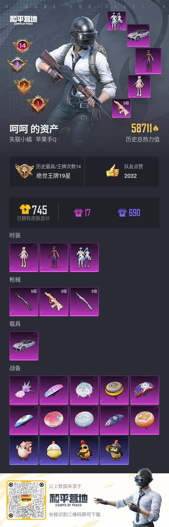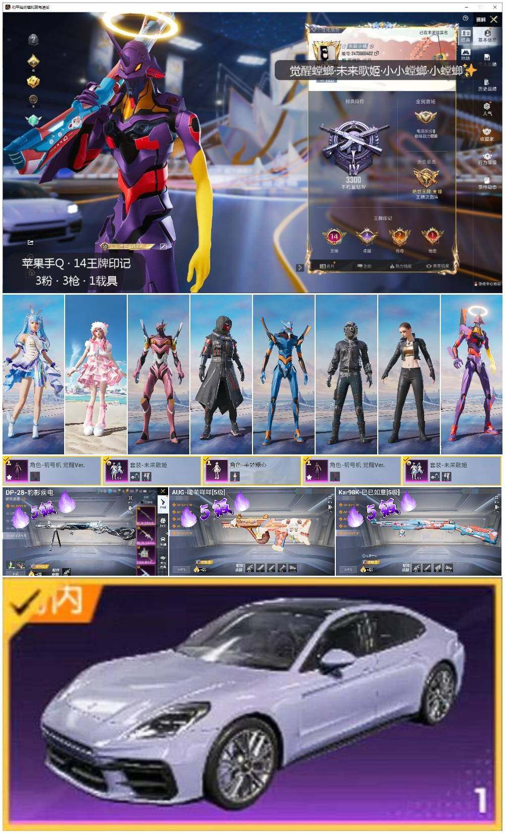 [14516165]可二次【店主推荐捡漏号!可直接换绑】 苹果 手q-3粉装-3特效呛-1载具-1粉色飞行器-5.8w热力值-14王牌印记-156套装-195呛皮【热门品类】:套装-奇异狩猎者,套装-龟仙人,套装-粉红小猪,角色-8号机,角色-mark.06【粉色载具】:保时捷panamera(星辰紫)【粉色套装】:粉装-未来歌姬,角色-初号机 觉醒ver.,角色-羊梦糖心【粉色呛皮等级】:aug-暖羊咩咩五级,kar98k-巳巳如意五级,dp-28-豹影疾电五级