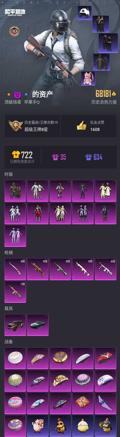 11粉6特效呛2载 梦幻火箭 智能音符 极限特训 紫螳螂 天网 多呛型 满级scar-l天蓬元帅 满级m4心语 阿斯顿马丁 国宝头盔 粉熊背包