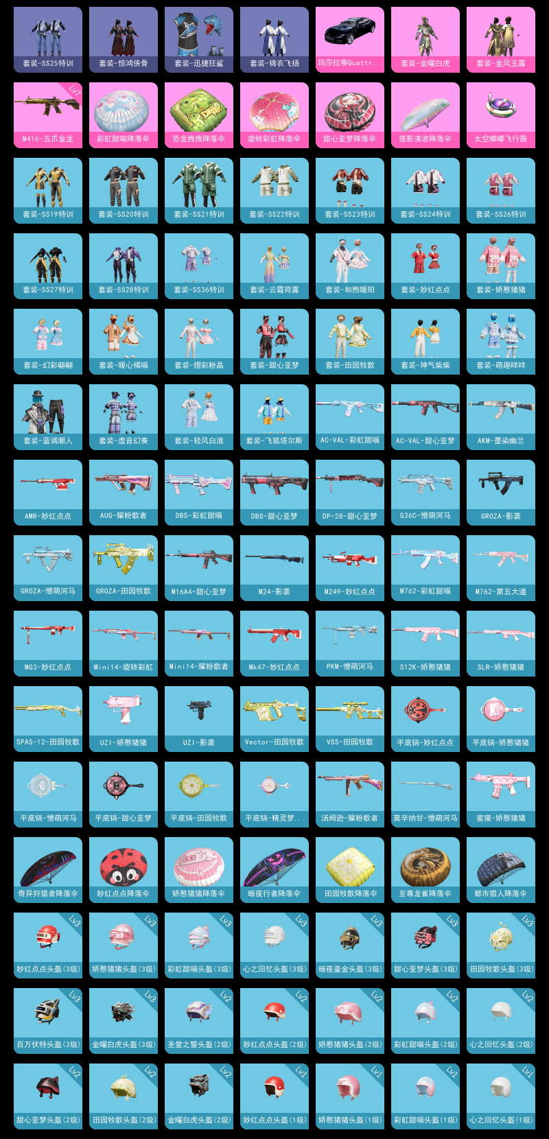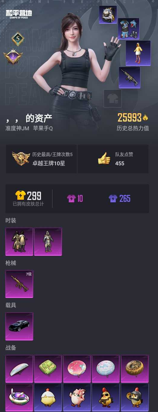 【和平精英】【lyhp17763】2粉1特效呛1载 狂鲨 满级m4金龙 黑玛莎 猫包 2粉装,1特效呛,1载具,历史最高段位:卓越王牌10星 王牌印记5次 热力值:25993,55套装,91呛械,85装备,48战备;套装:套装-金曜白虎,套装-金风玉露,套装-猎鹰,套装-白色伏地魔,套装-竞技名士,套装-黄色名流,套装-长空猛禽,套装-甜蜜告白,套装-沙漠毒蛇,套装-魅力单车,套装-夜莺强袭者,套装-野性战心,套装-幻世战舞者,套装-蓝调潮人,套装-迅捷狂鲨,套装-冰川特警,套装-极速红龙,套装-麻辣教官,套装-破蛋小黄鸡,套装-萌黄之夏,套装-牛气冲天,套装-飞行日记,套装-ss19特训,套装-ss20特训,套装-甜心亚梦,套装-虚音幻奏,套装-ss21特训,套装-萌趣咩咩,套装-娇憨猪猪,套装-暖心橘喵,套装-ss22特训,套装-和煦暖阳,套装-田园牧歌,套装-轻风白浪,套装-熠彩粉晶,套装-光之冒险,套装-绯格组合,套装-ss23特训,套装-飞狐塔尔斯,套装-神气柴柴,套装-妙红点点,套装-幻彩翩翩,套装-王牌教练,套装-柠萌假日,套装-青玉碎影,套装-ss24特训,套装-龟仙人,套装-ss25特训,套装-惊鸿侠骨,套装-锦衣飞扬,套装-云霞荷露,套装-ss26特训,套装-ss27特训,套装-ss28特训,套装-ss36特训;呛皮:scar-l-黄金龙骨,scar-l-炫彩节奏,scar-l-玉兔迎春,scar-l-海盐豹豹,mk47-乌木金纹,mk47-妙红点点,7级m416-五爪金龙,m416-蓝色火焰,m416-糯团青竹,akm-破晓战魂,akm-彩虹符号,akm-墨染幽兰,akm-龙的传人,g36c-懵萌河马,ac-val-甜心亚梦,ac-val-乌木金纹,ac-val-彩虹甜喵,ac-val-天降萌叽,蜜獾-娇憨猪猪,蜜獾-天降萌叽,q-彩虹符号,m762-彩虹甜喵,m762-第五大道,m762-天降萌叽,m16a4-甜心亚梦,m16a4-幻世战舞者,groza-影袭,groza-田园牧歌,groza-懵萌河马,aug-耀粉歌者,aug-天降萌叽,莫辛纳甘-乌木金纹,莫辛纳甘-懵萌河马,m24-影袭,m24-炫彩节奏,m24-乌木金纹,amr-妙红点点,amr-乌木金纹,awm-天降萌叽,m200-惊鸿侠骨,m417-惊鸿侠骨,vss-田园牧歌,slr-娇憨猪猪,slr-彩虹符号,mini14-炫彩节奏,mini14-耀粉歌者,mini14-旋转彩虹,mk14-乌木金纹,mk12-乌木金纹,汤姆逊-耀粉歌者,汤姆逊-炫彩节奏,汤姆逊-天降萌叽,ump45-夜灯,ump45-蓝色火焰,ump45-生命誓言,p90-乌木金纹,vect-生命誓言,vect-田园牧歌,uzi-影袭,uzi-娇憨猪猪,s12k-娇憨猪猪,s12k-幻世战舞者,dbs-甜心亚梦,dbs-彩虹甜喵,dbs-彩虹符号,dbs-乌木金纹,s1897-炫彩节奏,spas-12-田园牧歌,s686-生命誓言,m249-彩虹符号,m249-糯团青竹,m249-妙红点点,m249-无面战甲,pkm-懵萌河马,mg3-幻世战舞者,mg3-乌木金纹,mg3-妙红点点,mg3-惊鸿侠骨,dp-28-甜心亚梦,平底锅-飞行日记,平底锅-甜心亚梦,平底锅-娇憨猪猪,平底锅-田园牧歌,平底锅-光之冒险,平底锅-妙红点点,平底锅-懵萌河马,平底锅-惊鸿侠骨,平底锅-空岛之星,平底锅-精灵梦叶罗丽,撬棍-幻世战舞者,爆炸猎弓-惊鸿侠骨;载具:玛莎拉蒂quattropte夜幕蓝;降落伞:太空嘟嘟飞行器; 详情看图