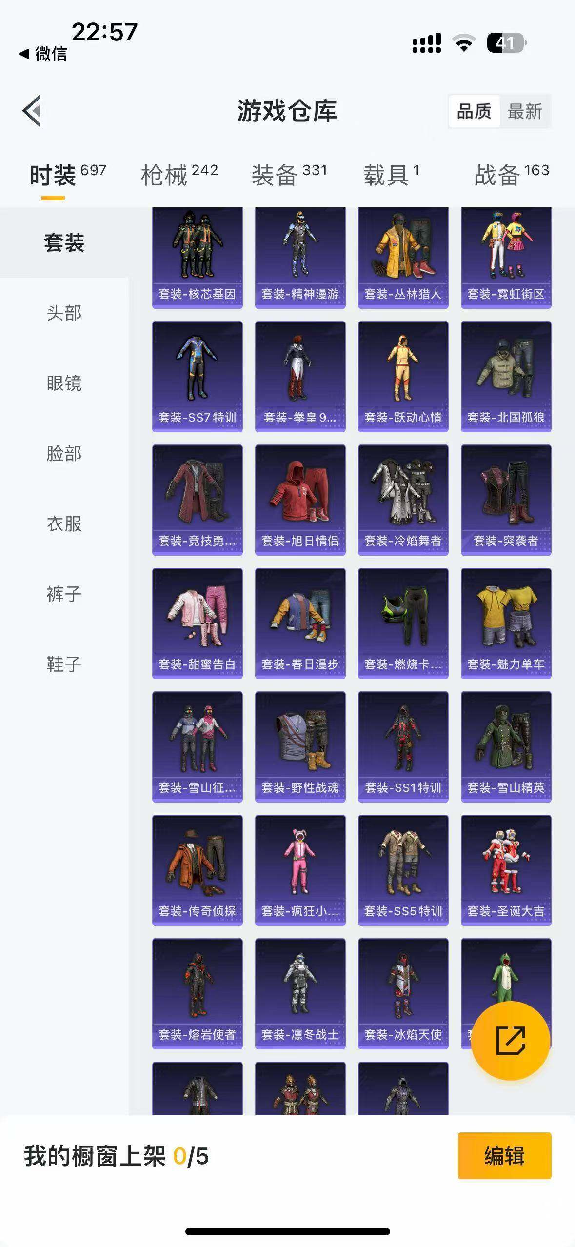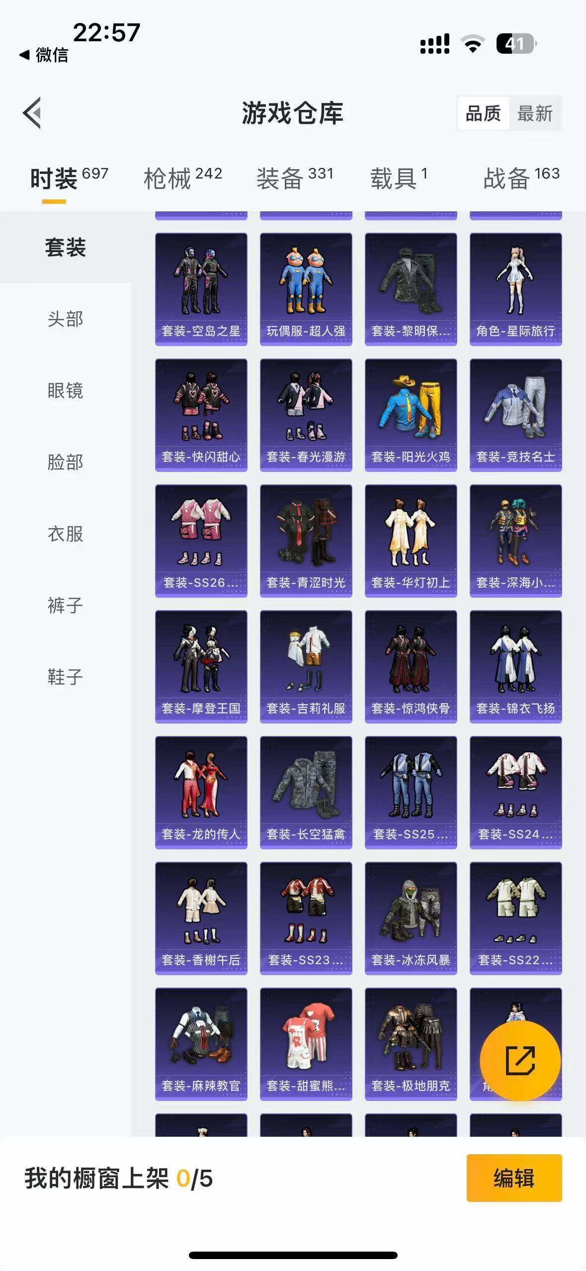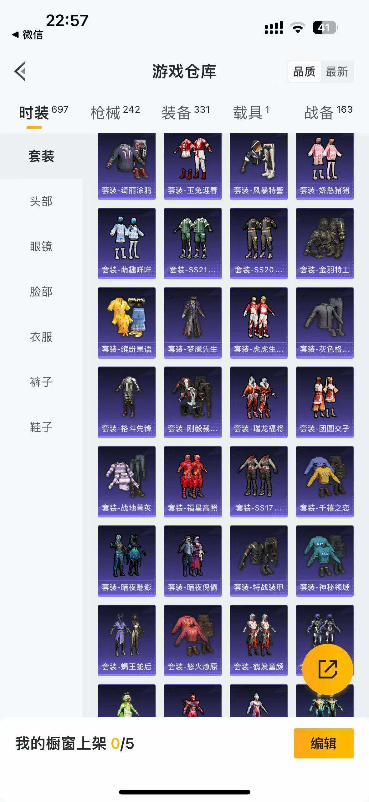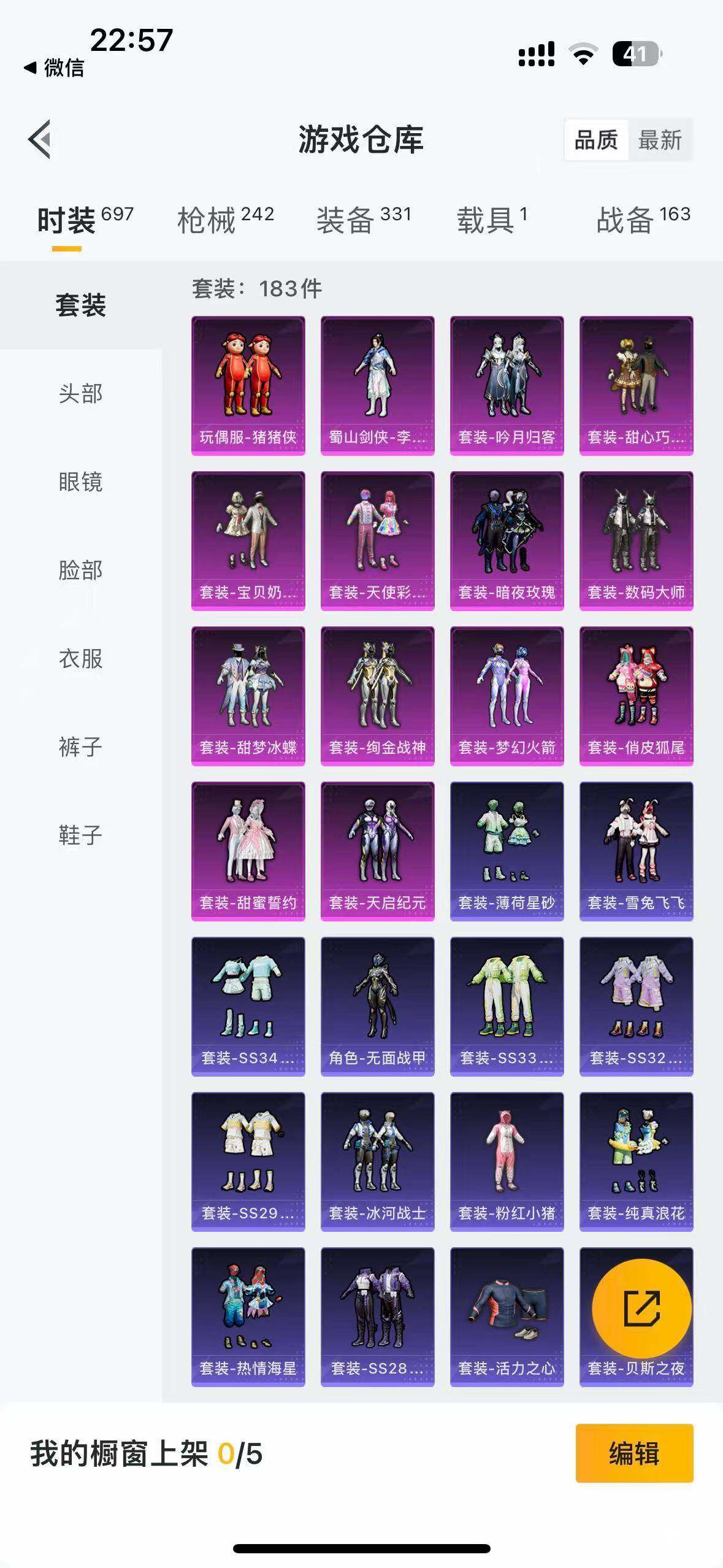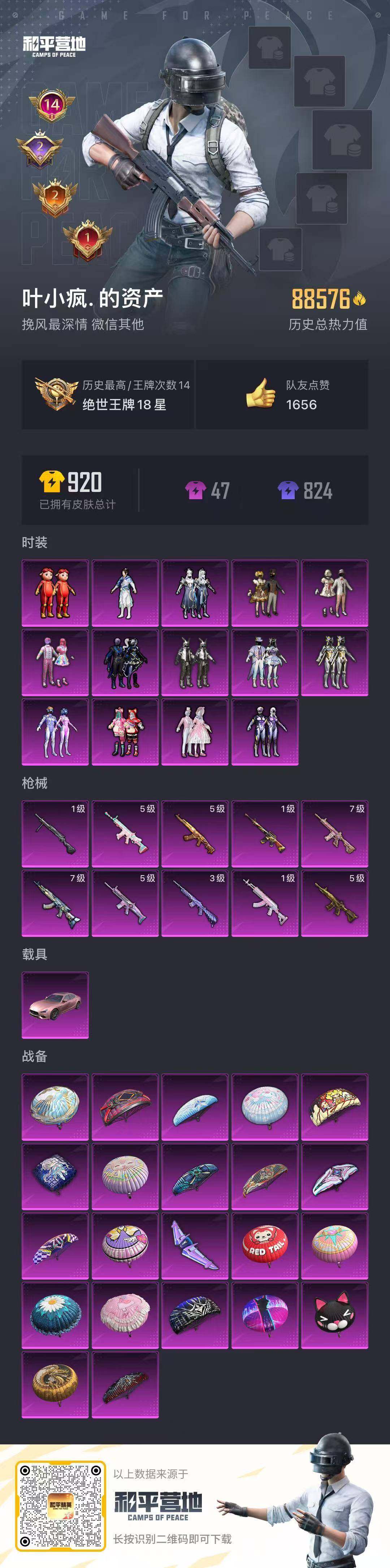 _2257963-时装数:697载具数:1呛械数:242战备数:163热门装扮:奇异狩猎者梦幻火箭新101甜心巧克力呆萌铁蟹数码大师深海小丑鱼天启纪元宝贝奶油派天使彩虹糖梦魇先生迅捷狂鲨好奇恐龙甜蜜誓约绚金战神俏皮狐尾甜梦冰蝶暗夜玫瑰吟月归客s1赛事上衣蜀山剑侠-李潮萌小黄鸭大橘为重浪客战士暗夜魅影猪猪侠载具:玛莎拉蒂ghibli粉稀有呛皮:七级m762-激战未来七级m416-心之恋语五级scar-l-锦绣绵绵五级scar-l-梦幻火箭五级m416-五爪金龙五级akm-甜心宝贝三级mini14-荧光虫舞一级m16a4-葫芦兄弟一级m762-甜蜜誓约一级dp-28-豹影疾电