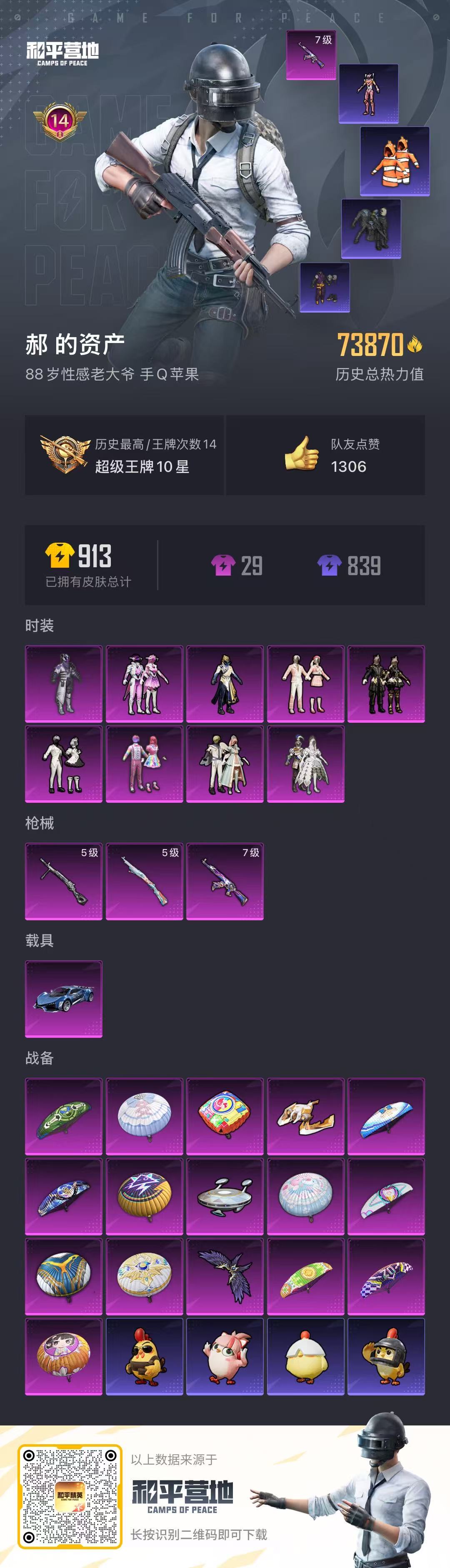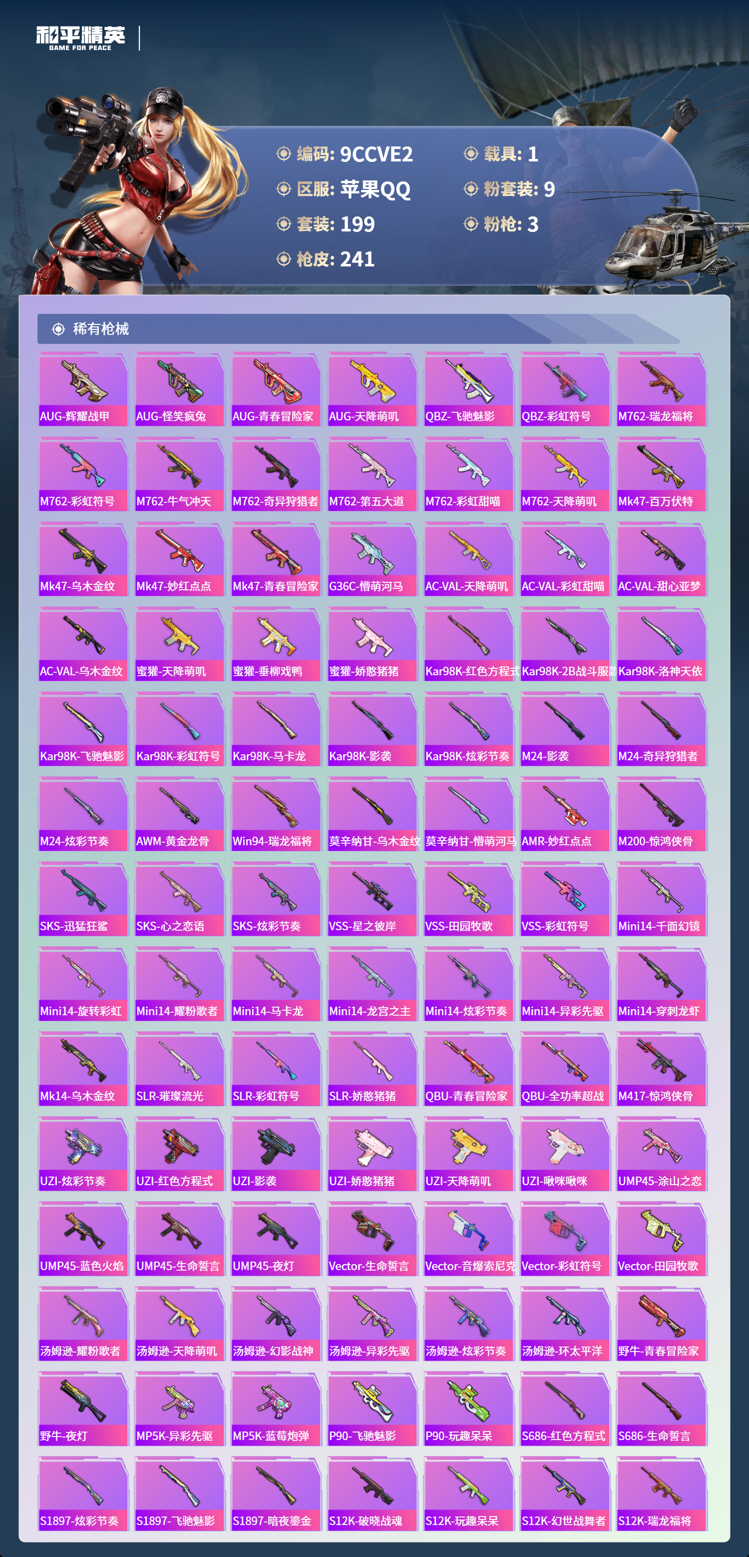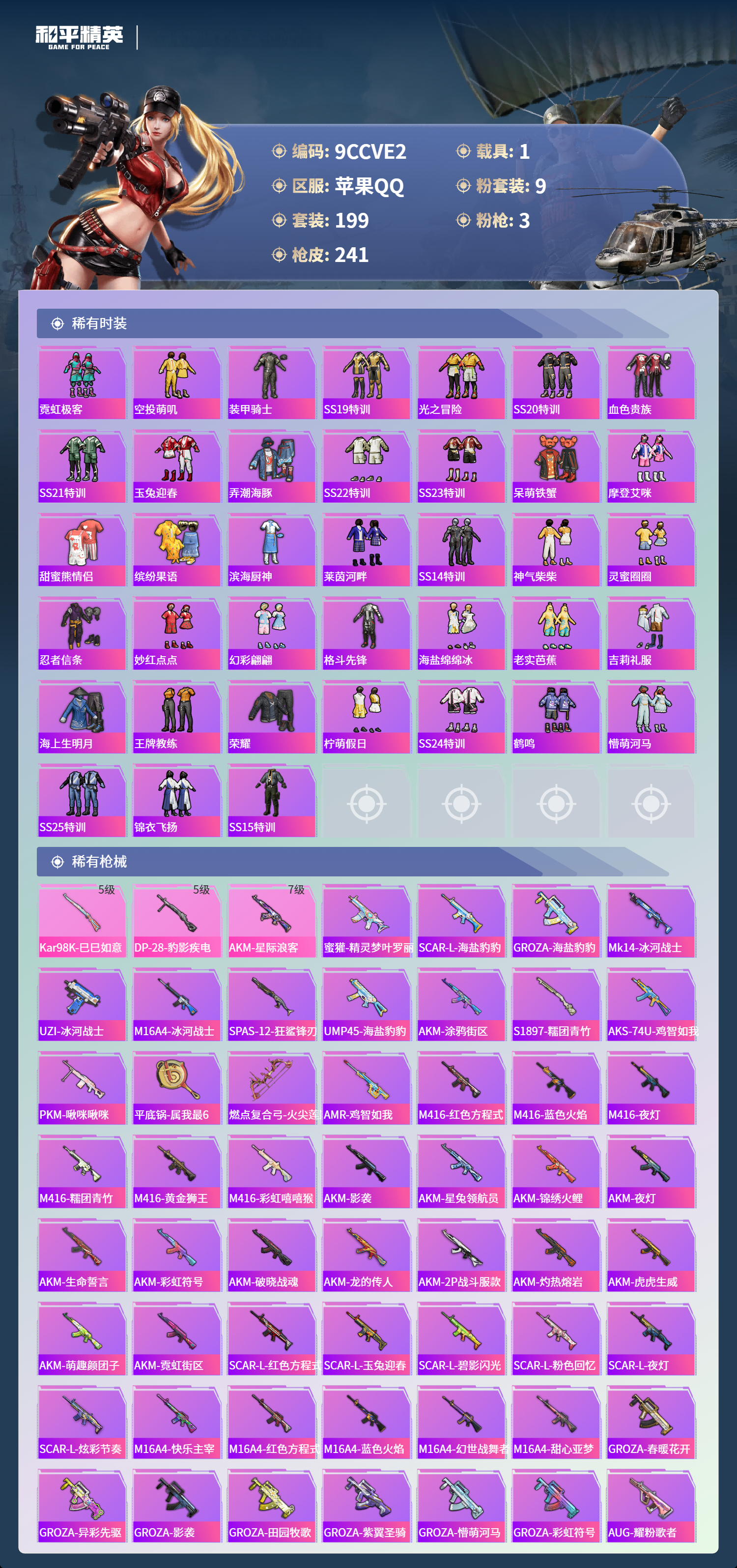 1载具-199套装-241呛皮-苹果手q-14王牌印记-9粉装-3特效呛-1载具-73870热力值-199套装-241呛皮【9粉装】套装-冰川幽秘套装-筑梦精灵套装-幻影战神套装-黄族统领套装-第五大道套装-天使彩虹糖套装-暗夜鎏金套装-室女星神套装-冰霜白皇【3特效呛】kar98k-巳巳如意/5级akm-星际浪客/7级dp-28-豹影疾电/5级【7稀有紫装】都市猎人8号机深海小丑鱼浪漫天命迅捷狂鲨