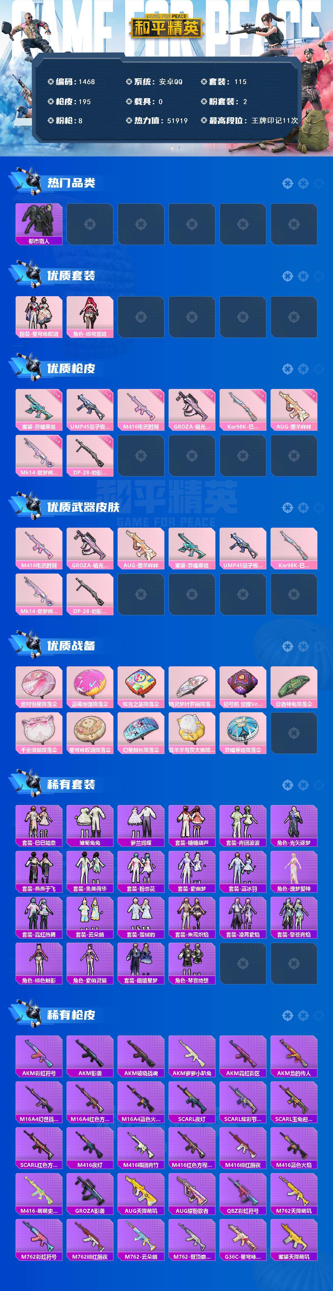 0载具-115套装-195呛皮-115套装/呛械8/装备213/战备121/王牌印记11/热力值51919/五级m416-电玩时刻/五级groza-镜光银凌/五级aug-暖羊咩咩/六级蜜獾-异瞳寒姬/五级ump45-量子极限/五级kar98k-巳巳如意/五级mk14-甜梦熊击/五级dp-28-豹影疾电/套装-浪漫天命/都市猎人/深海小丑鱼/套装-龟仙人/套装-暗影哥特/套装-粉红小猪/角色-mark.06/粉装-星穹咏叹调/