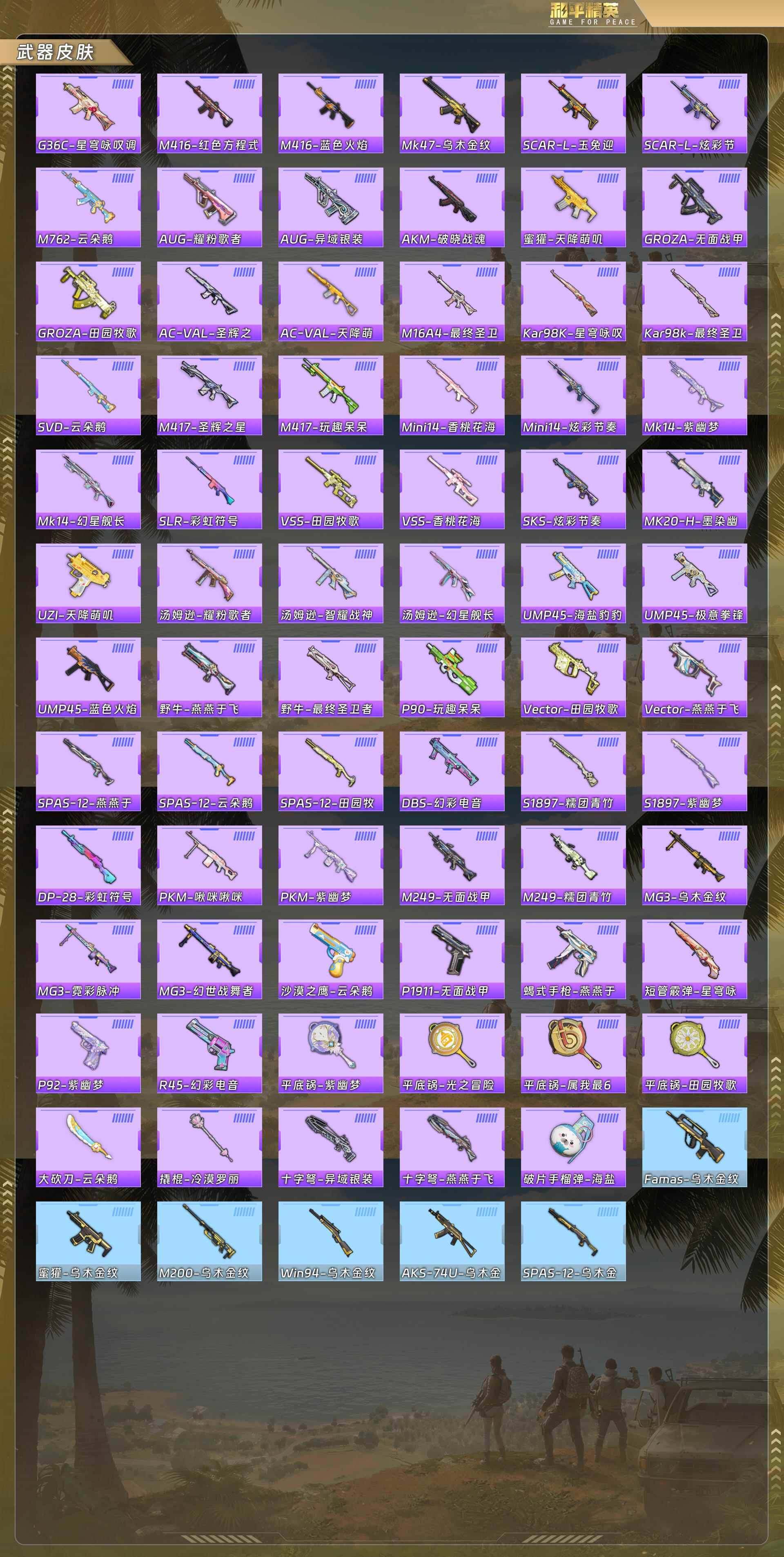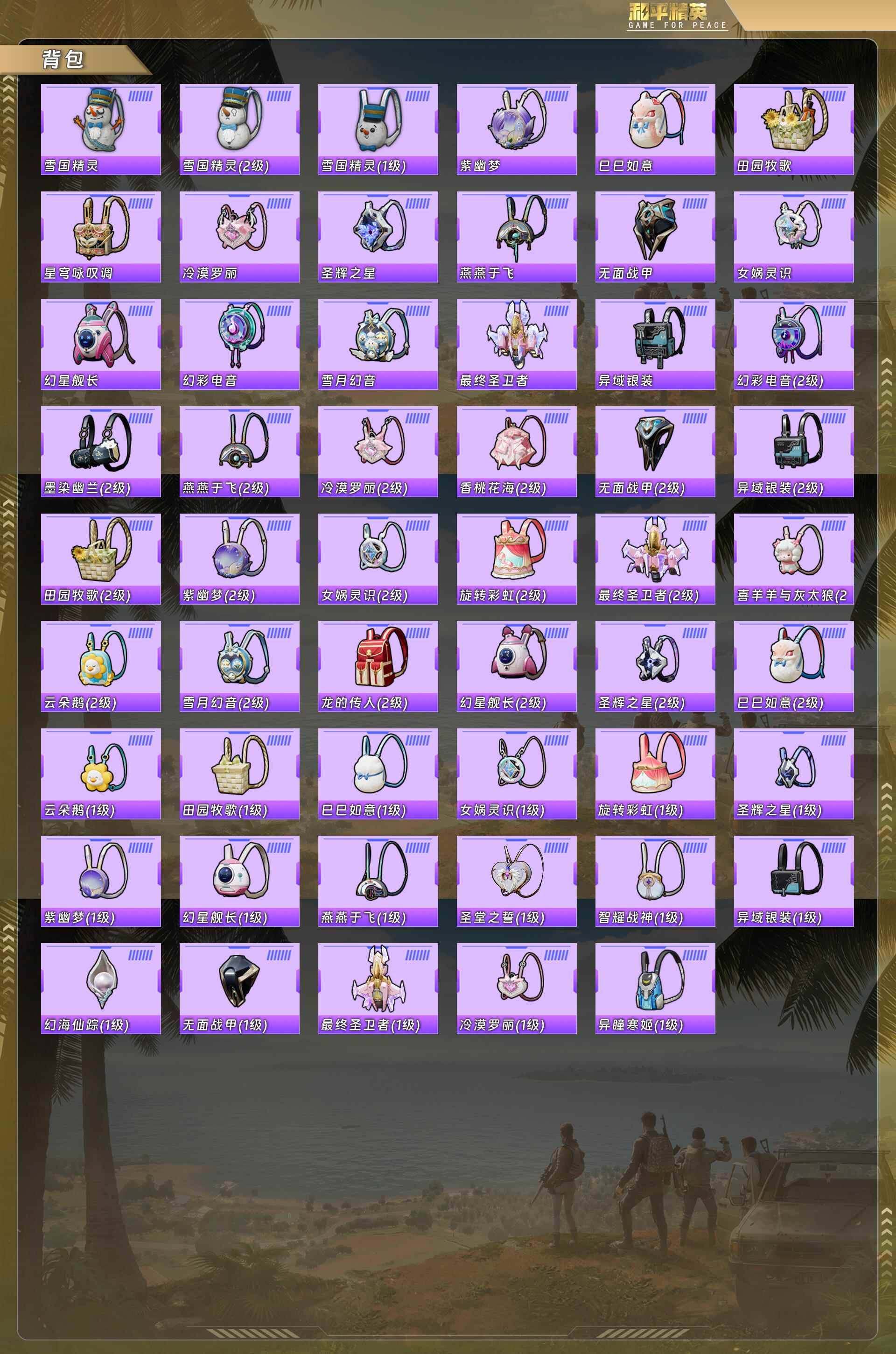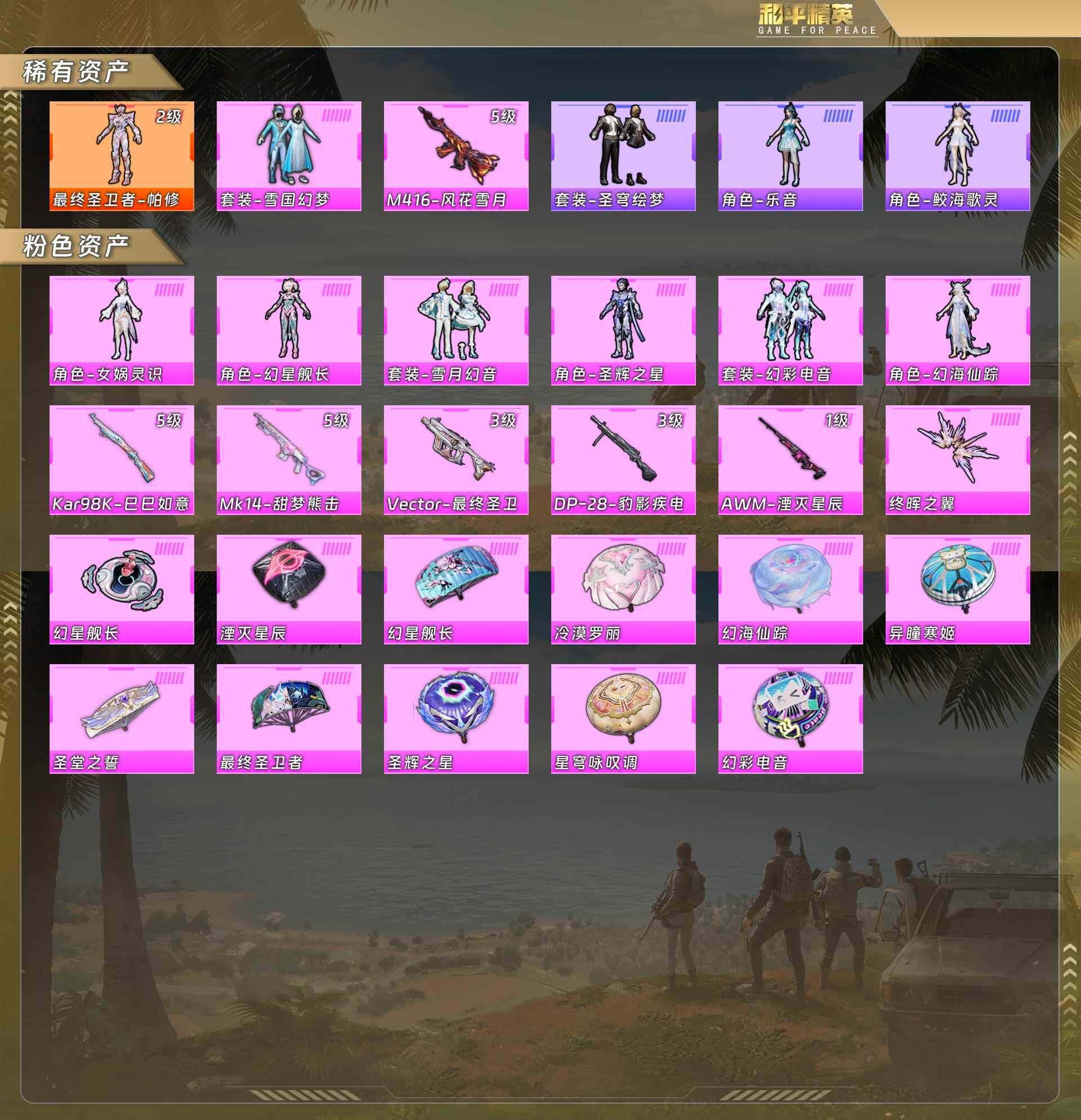 安卓 手q-1神装-7粉装-6特效呛-0载具-2粉色飞行器-29864热力值-1王牌印记-53套装-83呛皮 【红色神装等级】:最终圣卫者-帕修斯二级 【红色角色神装】:最终圣卫者-帕修斯 【热门品类】:粉装-雪国幻梦 【粉色套装】:粉装-雪国幻梦,角色-女娲灵识,粉装-雪月幻音,角色-圣辉之星,角色-幻海仙踪,粉装-幻彩电音 【粉色呛皮等级】:m416-风花雪月五级,vect-最终圣卫者三级,kar98k-巳巳如意五级,awm-湮灭星辰一级,mk14-甜梦熊击五级,dp-28-豹影疾电三级 【粉色呛皮】:m416-风花雪月,vect-最终圣卫者,kar98k-巳巳如意,awm-湮灭星辰,mk14-甜梦熊击,dp-28-豹影疾电 【粉色飞行器】:幻星舰长飞行器,终晖之翼飞行器 【粉色降落伞】:圣堂之誓降落伞,圣辉之星降落伞,幻海仙踪降落伞,星穹咏叹调降落伞,湮灭星辰降落伞,幻星舰长降落伞,幻彩电音降落伞,最终圣卫者降落伞,冷漠罗丽降落伞,异瞳寒姬降落伞 【稀有套装】:套装-圣穹绘梦,套装-小鸟芋圆,套装-兰香蝶语,套装-燕燕于飞,套装-鱼渊荷华,套装-风舞幻音,角色-幽秘之星,角色-冷霜之星,套装-粉恋花,套装-紫幽梦,套装-蓝冰羽,角色-猎影月神,角色-幽澜祭司,角色-鲛海歌灵,套装-星渊小夜曲,套装-霓虹热舞,套装-云朵鹅,套装-雪绒豹,角色-乐音 【稀有呛皮】:akm-破晓战魂,m16a4-最终圣卫者,scar-l-炫彩节奏,scar-l-玉兔迎春,m416-红色方程式,m416-蓝色火焰,groza-田园牧歌,aug-耀粉歌者,m762-云朵鹅,g36c-星穹咏叹调,ac-val-天降萌叽,ac-val-圣辉之星,蜜獾-天降萌叽,uzi-天降萌叽,ump45-蓝色火焰,ump45-极意拳锋,vect-田园牧歌,汤姆逊-耀粉歌者,汤姆逊-幻星舰长,汤姆逊-智耀战神,野牛-最终圣卫者,kar98k-最终圣卫者,kar98k-星穹咏叹调,sks-炫彩节奏,vss-田园牧歌,mini14-炫彩节奏,mk14-幻星舰长,slr-彩虹符号,m417-圣辉之星,mk20-h-墨染幽兰,svd-云朵鹅,dbs-幻彩电音,spas-12-田园牧歌,spas-12-云朵鹅,m249-糯团青竹,dp-28-彩虹符号,mg3-幻世战舞者,r45-幻彩电音,短管霰弹-星穹咏叹调,沙墨之鹦-云朵鹅,大砍刀-云朵鹅,撬棍-冷漠罗丽 【其他套装】:套装-ss22特训,套装-ss23特训,套装-光之冒险,套装-完美偶像,套装-旭日情侣,套装-柠萌假日,套装-滨海厨神,套装-竞技名士,套装-缤纷果语,套装-长空猛禽,套装-飞行日记,套装-龙的传人,套装-田园牧歌,套装-轻风白浪,套装-和煦暖阳 【稀有头盔】:雪国精灵头盔3级,雪国精灵头盔2级,雪国精灵头盔1级 【稀有背包】:雪国精灵背包3级,雪国精灵背包2级,雪国精灵背包1级 【营地id】:915646390