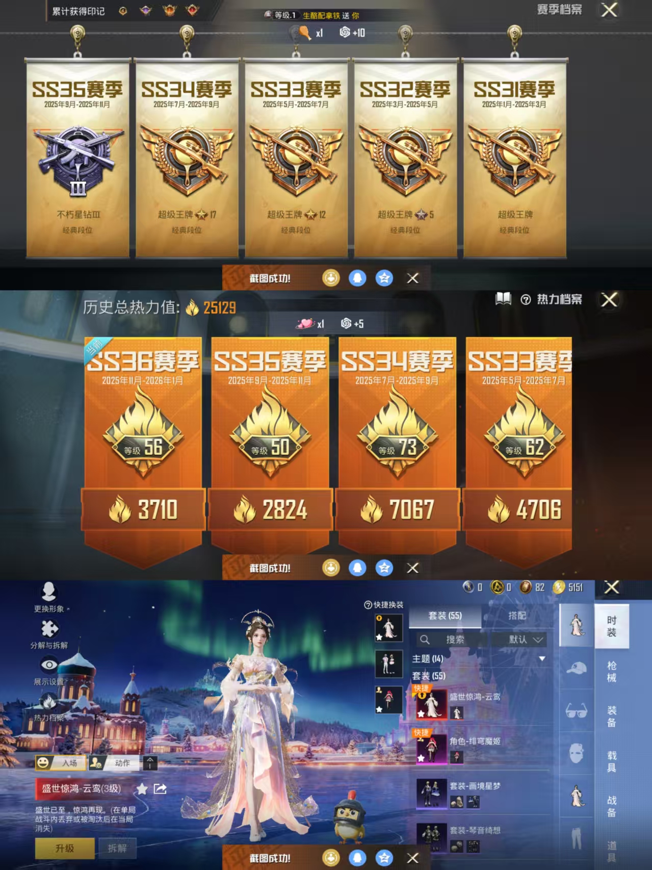 【3级红装】安卓q-1红装1稀有1粉装2特效呛4热门55套装80呛皮 25129热力值 4印记 历史绝世王牌17星 【1红装】 盛世惊鸿-云鸾 3级 【1稀有】 awm-黄金龙骨 【1粉装】 绯穹魔姬 【2特效呛】 kar98k-巳巳如意 5级 dp-28-豹影疾电 5级 【4热门】 晶辉守护 鹰眼刺客 漫步者 akm-奇异狩猎者 【1头盔】 金羽特工头盔 炫彩糖果飞行器 绝对恒星飞行