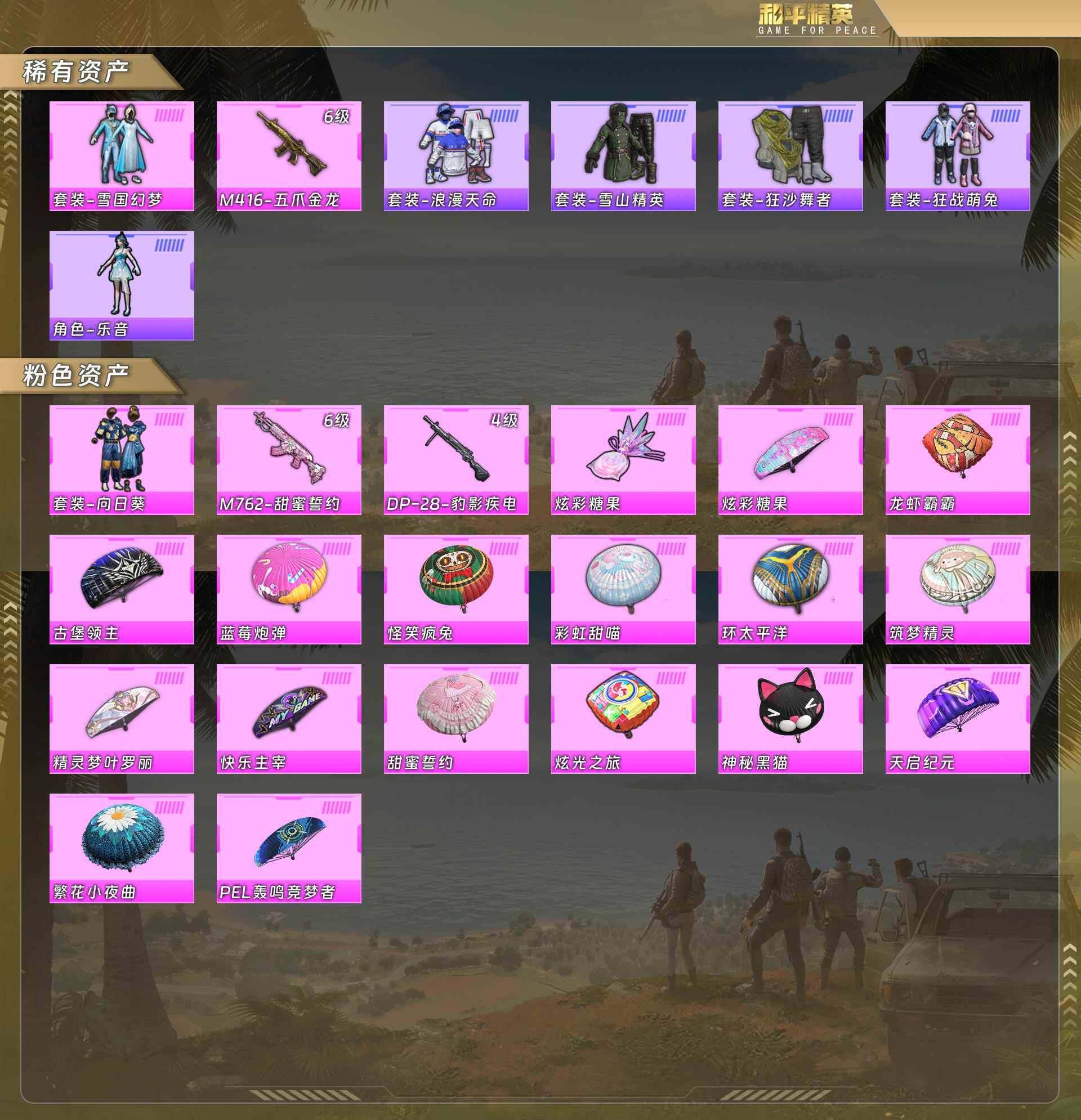 身法号-雪国/粉熊/浪漫天命/雪山精英/狂沙舞者/向日葵/m4五爪金龙6级/m762甜蜜誓约6级/dp28豹影疾电4级(2粉套3粉呛)没战神框hp4207-1粉色飞行器-56708热力值-6王牌印记-141套装-173呛皮 【热门品类】:粉装-雪国幻梦,套装-浪漫天命 【粉色套装】:粉装-雪国幻梦,粉装-向日葵 【粉色呛皮等级】:m416-五爪金龙六级,m762-甜蜜誓约六级,dp-28-豹影疾电四级 【粉色呛皮】:m416-五爪金龙,m762-甜蜜誓约,dp-28-豹影疾电 【粉色降落伞】:快乐主宰降落伞,天启纪元降落伞,龙虾霸霸降落伞,pel轰鸣竞梦者降落伞,神秘黑猫降落伞,古堡领主降落伞,繁花小夜曲降落伞,甜蜜誓约降落伞,怪笑疯兔降落伞,蓝莓炮弹降落伞,筑梦精灵降落伞,环太平洋降落伞,彩虹甜喵降落伞,炫光之旅降落伞,精灵梦叶罗丽降落伞 【稀有套装】:角色-乐音,套装-炫彩糖果 【稀有呛皮】:aug-冰晶雪宝,akm-pel轰鸣竞梦者,akm-夜灯,akm-彩虹符号,akm-影袭,akm-星之彼岸,akm-灼热熔岩,akm-破晓战魂,akm-萌趣颜团子,akm-虎虎生威,akm-龙的传人,m16a4-九霄,m16a4-幻世战舞者,m16a4-机械英豪,m16a4-甜心亚梦,scar-l-炫彩节奏,scar-l-玉兔迎春,scar-l-甜蜜誓约,m416-夜灯,m416-神秘黑猫,groza-异彩先驱,groza-彩虹符号,groza-影袭,groza-黑色刀锋,aug-pec最牛战神,aug-青春冒险家,q-原初圣火,q-彩虹符号,q-潮汐统领,q-神秘黑猫,q-赛罗,q-飞驰魅影,m762-天降萌叽,m762-牛气冲天,m762-瑞龙福将,m762-绯红前夜,mk47-青春冒险家,g36c-不夜海上花,ac-val-天降萌叽,ac-val-甜心亚梦,蜜獾-天降萌叽,uzi-众神之王,uzi-古堡领主,uzi-天降萌叽,uzi-影袭,ump45-炫光之旅,ump45-生命誓言,ump45-蓝色火焰,ump45-金玉无双,vect-pel轰鸣竞梦者,vect-夜灯,vect-彩虹符号,vect-生命誓言,vect-黑色刀锋,汤姆逊-勇闯险境,汤姆逊-天降萌叽,汤姆逊-异彩先驱,野牛-机械英豪,野牛-青春冒险家,mp5k-众神之王,mp5k-异彩先驱,mp5k-甜蜜誓约,mp5k-蓝莓炮弹,p90-倾城蜜语,p90-飞驰魅影,kar98k-勇闯险境,kar98k-古堡领主,kar98k-彩虹符号,kar98k-炫彩节奏,kar98k-飞驰魅影,m24-影袭,m24-炫彩节奏,m24-众神之王,awm-不夜海上花,sks-勇闯险境,sks-炫彩节奏,vss-碧影闪光,vss-繁花小夜曲,vss-黑色刀锋,mini14-原初圣火,mini14-异彩先驱,mini14-穿刺龙虾,mini14-筑梦精灵,mini14-耀粉歌者,win94-怪笑疯兔,win94-机械英豪,win94-瑞龙福将,slr-众神之王,qbu-不夜海上花,qbu-青春冒险家,莫辛纳甘-炙焰牛王,s686-不夜海上花,s686-橘柚倾心,s686-生命誓言,s686-红色方程式,s1897-勇闯险境,s1897-神秘黑猫,s1897-飞驰魅影,s12k-玩趣呆呆,s12k-瑞龙福将,s12k-香水柠檬,s12k-pel轰鸣竞梦者,s12k-华贵君王,s12k-幻世战舞者,s12k-幻影战神,s12k-机械英豪,dbs-甜心亚梦,m249-古堡领主,m249-四圣焕新,m249-破晓战魂,dp-28-原初圣火,dp-28-彩虹符号,dp-28-甜心亚梦,mg3-幻世战舞者,mg3-瑞龙福将,pkm-蜜语绒猫,p18c-原初圣火 【其他套装】:套装-ss11特训,套装-ss14特训,套装-ss15特训,套装-ss17特训,套装-ss18特训,套装-ss19特训,套装-ss20特训,套装-ss21特训,套装-ss22特训,套装-ss23特训,套装-ss24特训,套装-ss25特训,套装-ss26特训,套装-ss27特训,套装-ss29特训,套装-丛林猎人,套装-人气偶像,套装-六六大吉,套装-军械专家,套装-冰川格斗者,套装-冷焰舞者,套装-北国孤狼,套装-吉莉礼服,套装-夏日音浪,套装-完美偶像,套装-幻世战舞者,套装-幻影武者,套装-战地督导,套装-探宝勇士,套装-摇滚狂鲨,套装-时尚圣诞,套装-极速红龙,套装-柠萌假日,套装-格斗先锋,套装-橘黑制服,套装-浪漫天命,套装-海上生明月,套装-深蓝色名流,套装-湖蓝色名流,套装-灼焰舞者,套装-炫蓝之夏,套装-牛气冲天,套装-牛气满满,套装-特战装甲,套装-特殊使命,套装-特训学院,套装-狂战萌兔,套装-狂沙舞者,套装-猎鹰,套装-猛禽,套装-玉兔迎春,套装-甜蜜熊情侣,套装-疯狂小兔子,套装-白色伏地魔,套装-破晓战魂,套装-破蛋小黄鸡,套装-空岛之星,套装-空投萌叽,套装-竞技勇士朋克,套装-竞技名士,套装-竞技达人朋克,套装-红色运动,套装-绮丽涂鸦,套装-绯格组合,套装-耀粉歌者,套装-萌趣颜团子,套装-萌黄之夏,套装-蓝彩潮人,套装-蓝色运动,套装-虎虎生威吉莉,套装-街头潮人,套装-跃动心情,套装-都市魅力,套装-酒红色名流,套装-长空猛禽,套装-霓虹街区,套装-青年教官,套装-青涩时光,套装-骑行爱好者,套装-魅力单车,套装-鹤鸣,套装-麻辣教官,套装-黄色伏地魔,套装-黄色名流,套装-黄色格斗者,套装-黄色运动,套装-黎明保卫者,套装-黑色伏地魔,套装-龙腾端午,套装-鹰眼刺客,套装-冰冻风暴,套装-漫步者,套装-冰川特警,套装-梦魇先生,套装-雪山精英,套装-核芯基因,套装-精神漫游,套装-迷域探索者,套装-众神之王,套装-智慧之神,套装-乘风破浪,套装-神秘黑猫,套装-大橘为重,套装-软萌银虎,套装-风华少年志,套装-红酒骑士,套装-舞夜骑士,套装-机械英豪,套装-机械征服者,套装-荷鲁斯之眼,套装-暗夜契约,套装-纯白誓言,套装-原初圣火,套装-逆风勇士,套装-冰爽海盐,套装-青春冒险家,套装-潮流游乐家,套装-瑞龙福将,套装-团圆交子,套装-电音精灵,套装-异彩先驱,套装-霓虹极客,套装-极速竞梦,套装-飞驰魅影,套装-音速流光,套装-智慧隐士,套装-猎梦纪元,套装-甜心亚梦,套装-虚音幻奏,套装-华灯初上 【稀有头盔】:九霄头盔3级,雪国精灵头盔3级,雪国精灵头盔2级,雪国精灵头盔1级,幻影战神头盔2级,深海小丑鱼头盔3级,甜蜜誓约头盔3级,甜蜜誓约头盔2级,甜蜜誓约头盔1级 【稀有背包】:九