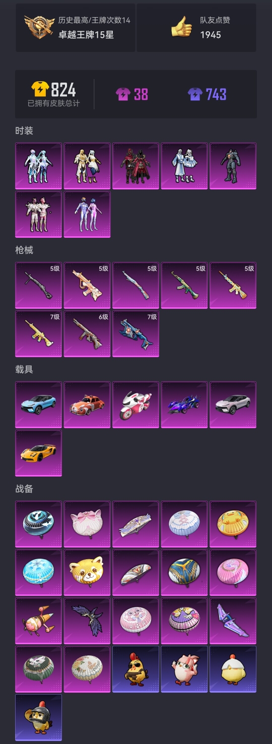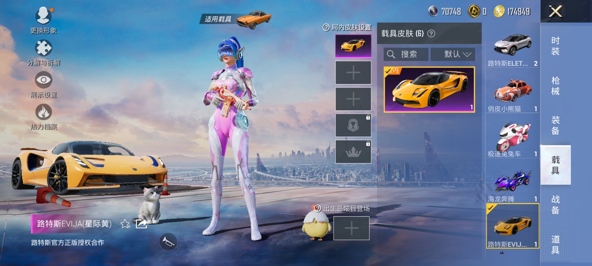 6载具-195套装-207呛皮-【赤蝎幽灵金鞋6载具8特效呛7粉装素材号 秒换绑不用等】 安卓q区-75748热力值-14印记-195套装-207呛皮 【6载具】 路特斯el蓝色 路特斯ev黄色 海龙奔腾 路特斯el花绽灰 俏皮小熊猫 极速兔兔车【4稀有】 赤蝎幽灵 派对舞王 派对舞王(金靴子) 奇异狩猎者【7粉装】 梦幻火箭 傲雪凌霜 复仇流浪者 炙焰红王 海渊国主 天星战神 幻彩电音【8特效呛】 m416