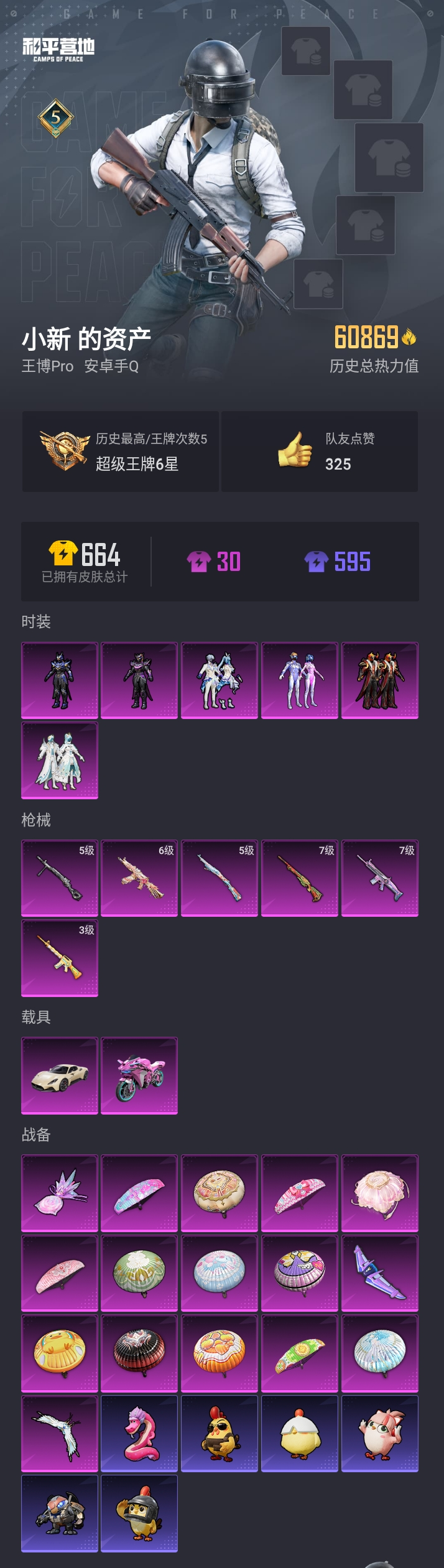 【和平精英】【lyhp17790】6粉装6特效呛2载具 梦幻火箭 未来歌姬 满级死噶梦幻火箭 6级aks-74u星穹咏叹调 玛莎拉蒂 梦幻火箭摩托 6粉装,6特效呛,2载具,历史最高段位:超级王牌6星 王牌印记5次 热力值:60869,144套装,178呛械,222装备,96战备;套装:套装-梦幻火箭,套装-天之羽翼,套装-炙焰牛王,角色-宙之时溯,角色-星云暗核,套装-未来歌姬,套装-猎鹰,套装-青年教官,套装-黄色运动,套装-黄色伏地魔,套装-登山爱好者,套装-竞技名士,套装-深蓝色名流,套装-湖蓝色名流,套装-长空猛禽,套装-漫步者,套装-黎明保卫者,套装-蓝色守护者,套装-海岛探路者,套装-冷焰舞者,套装-特战装甲,套装-沙漠毒蛇,套装-完美偶像,套装-幻影武者,套装-街头潮人,套装-蓝彩潮人,套装-魅力单车,套装-耀眼新星,套装-坚韧舞者,套装-野性战心,套装-超能勇士,套装-破晓战魂,套装-幻世保卫者,套装-森林游猎者,套装-荣耀,套装-幻世战舞者,套装-甜蜜菠萝,套装-蓝调潮人,套装-青涩时光,套装-缤纷果语,套装-龙魂突击队,套装-元素星魂,套装-麻辣教官,套装-粉红小猪,套装-破蛋小黄鸡,套装-疯狂小兔子,套装-迷域探索者,套装-熔岩使者,套装-军械专家,套装-黑色刀锋,套装-银河圣歌,套装-鹤鸣,套装-霓虹街区,套装-众神之王,套装-智慧之神,套装-夏日音浪,套装-lgd战队服,套装-牛气满满,套装-白糯汤圆,套装-战术大师,套装-牛气冲天,套装-ss18特训,套装-耀粉歌者,套装-飞行日记,套装-pai战队服,套装-ss17特训,套装-极乐追光,套装-福星高照,套装-异彩先驱,套装-霓虹极客,套装-ss19特训,套装-甜星爱神,套装-沁蓝冰爽,套装-浓情蜜辣,套装-极速竞梦,套装-飞驰魅影,套装-音速流光,套装-紫翼圣骑,套装-炫蓝之夏,套装-ss20特训,套装-浑天鲲鹏,套装-覆海蛟龙,套装-ss21特训,套装-萌趣咩咩,套装-娇憨猪猪,套装-梦幻奶油,套装-暗夜行者,套装-玉兔迎春,套装-ss22特训,套装-极光玫瑰,套装-光之冒险,套装-绯格组合,套装-ss23特训,套装-王牌教练,套装-柠萌假日,套装-青玉碎影,套装-ss24特训,套装-绚紫流光,套装-龟仙人,套装-涂山之恋,套装-ss25特训,套装-惊鸿侠骨,套装-锦衣飞扬,套装-香桃花海,套装-ss26特训,套装-云魄琉璃,套装-ss27特训,套装-恋语绒绒,套装-老实芭蕉,套装-街头风暴,套装-海盐绵绵冰,套装-蝶变,套装-ss29特训,角色-紫俏灵猫,套装-异域银装,套装-星途旅人,套装-霸天金鸿,角色-临安公主,套装-焰舞炽心,套装-ss30特训,套装-ss31特训,套装-鱼渊荷华,套装-燕燕于飞,套装-智谋强哥,套装-紫幽梦,套装-粉恋花,套装-巳巳如意,套装-ss32特训,角色-琉璃花蕾,角色-冰晶湖光,套装-蓝冰羽,套装-大橘大利,套装-炫彩糖果,玩偶服-美羊羊,套装-绯夜呢喃,套装-元气之梦,套装-ss34特训,套装-擎苍青焰,套装-朱霞炽焰,套装-凌霄紫焰,套装-薄荷星砂,套装-ss35特训,套装-ss36特训,套装-萌鸡速递;呛皮:g36c-炙焰牛王,g36c-星穹咏叹调,g36c-乌木金纹,m762-绯红前夜,m762-橘柚倾心,m762-天降萌叽,akm-涂鸦街区,akm-王牌投手,akm-霓彩脉冲,akm-绿洲时空,蜜獾-娇憨猪猪,蜜獾-垂柳戏鸭,蜜獾-天降萌叽,蜜獾-精灵梦叶罗丽,蜜獾-乌木金纹,3级m16a4-垂柳戏鸭,m16a4-幻世战舞者,m16a4-冰河战士,aug-耀粉歌者,aug-天降萌叽,aug-异域银装,aug-金蛇镇世,aug-冰晶雪宝,aug-紫晶流影,m416-蓝色火焰,m416-红色方程式,m416-月影鸳鸯,m416-紫翼圣骑,m416-暗夜行者,m416-糯团青竹,q-飞驰魅影,arx-凌霄紫焰,mk47-天之羽翼,mk47-乌木金纹,7级scar-l-梦幻火箭,scar-l-夜灯,scar-l-炫彩节奏,scar-l-碧影闪光,scar-l-玉兔迎春,scar-l-海盐豹豹,groza-异彩先驱,groza-紫翼圣骑,groza-海盐豹豹,famas-霓彩脉冲,ac-val-乌木金纹,ac-val-天降萌叽,5级kar98k-巳巳如意,kar98k-王子的夏天,kar98k-梦幻火箭,kar98k-彩虹符号,kar98k-炫彩节奏,kar98k-飞驰魅影,kar98k-顶峰精英,kar98k-星穹咏叹调,kar98k-乌木金纹,amr-鸡智如我,amr-喜羊羊与灰太狼,amr-乌木金纹,7级m24-翩跹演武,m24-影袭,m24-乌木金纹,awm-炙焰牛王,awm-超新星,awm-盛世惊鸿,awm-绿洲时空,m200-惊鸿侠骨,m200-乌木金纹,莫辛纳甘-炙焰牛王,莫辛纳甘-乌木金纹,win94-乌木金纹,svd-霓彩脉冲,mini14-梦幻火箭,mini14-炫彩节奏,mini14-异彩先驱,mini14-星夜魔法师,mini14-涂山之恋,mini14-香桃花海,mini14-鸡智如我,mk20-h-净心行者,mk20-h-狂鲨锋刃,mk20-h-乌木金纹,mk14-乌木金纹,mk14-海螺星光,mk14-冰河战士,mk14-紫幽梦,mk14-薄荷星砂,mk14-紫晶流影,slr-月影鸳鸯,slr-娇憨猪猪,slr-霓彩脉冲,sks-炫彩节奏,sks-天之羽翼,vss-碧影闪光,vss-彩虹符号,vss-香桃花海,qbu-飒粉甜心,m417-惊鸿侠骨,mk12-乌木金纹,ump45-夜灯,ump45-生命誓言,ump45-涂山之恋,ump45-海盐豹豹,p90-飞驰魅影,p90-玩趣呆呆,p90-巳巳如意,p90-乌木金纹,6级aks-74u-星穹咏叹调,aks-74u-乌木金纹,汤姆逊-异彩先驱,汤姆逊-天降萌叽,uzi-影袭,uzi-娇憨猪猪,uzi-冰河战士,uzi-盛世惊鸿,uzi-炫彩糖果,vect-彩虹符号,vect-燕燕于飞,野牛-燕燕于飞,野牛-乌木金纹,mp5k-异彩先驱,mp5k-乌木金纹,js9-凌霄紫焰,s12k-夜灯,s12k-娇憨猪猪,s12k-垂柳戏鸭,s12k-幻世战舞者,s12k-霓彩脉冲,s686-红色方程式,s686-橘柚倾心,s686-王牌投手,spas-12-燕燕于飞,spas-12-乌木金纹,s1897-飞驰魅影,s1897-紫幽梦,s1897-糯团青竹,dbs-彩虹符号,dbs-净心行者,dbs-乌木金纹,mg3-幻世战舞者,mg3-乌木金纹,mg3-暗夜行者,mg3-惊鸿侠骨,mg3-霓彩脉冲,m249-月影鸳鸯,m249-彩虹符号,m249-糯团青竹,m249-无面战甲,pkm-紫幽梦,5级dp-28-豹影疾电,dp-28-彩虹符号,dp-28-橘柚倾心,dp-28-紫翼圣