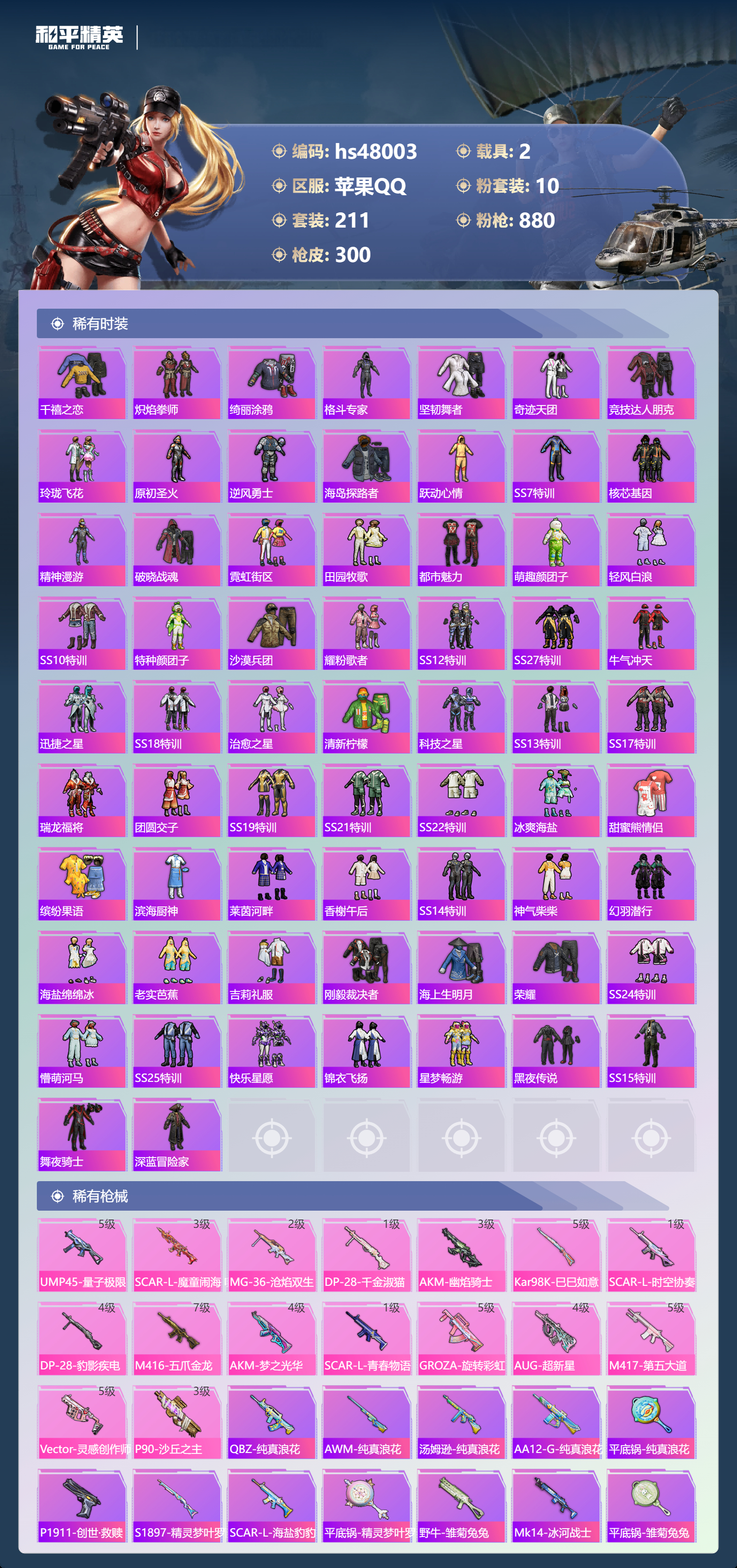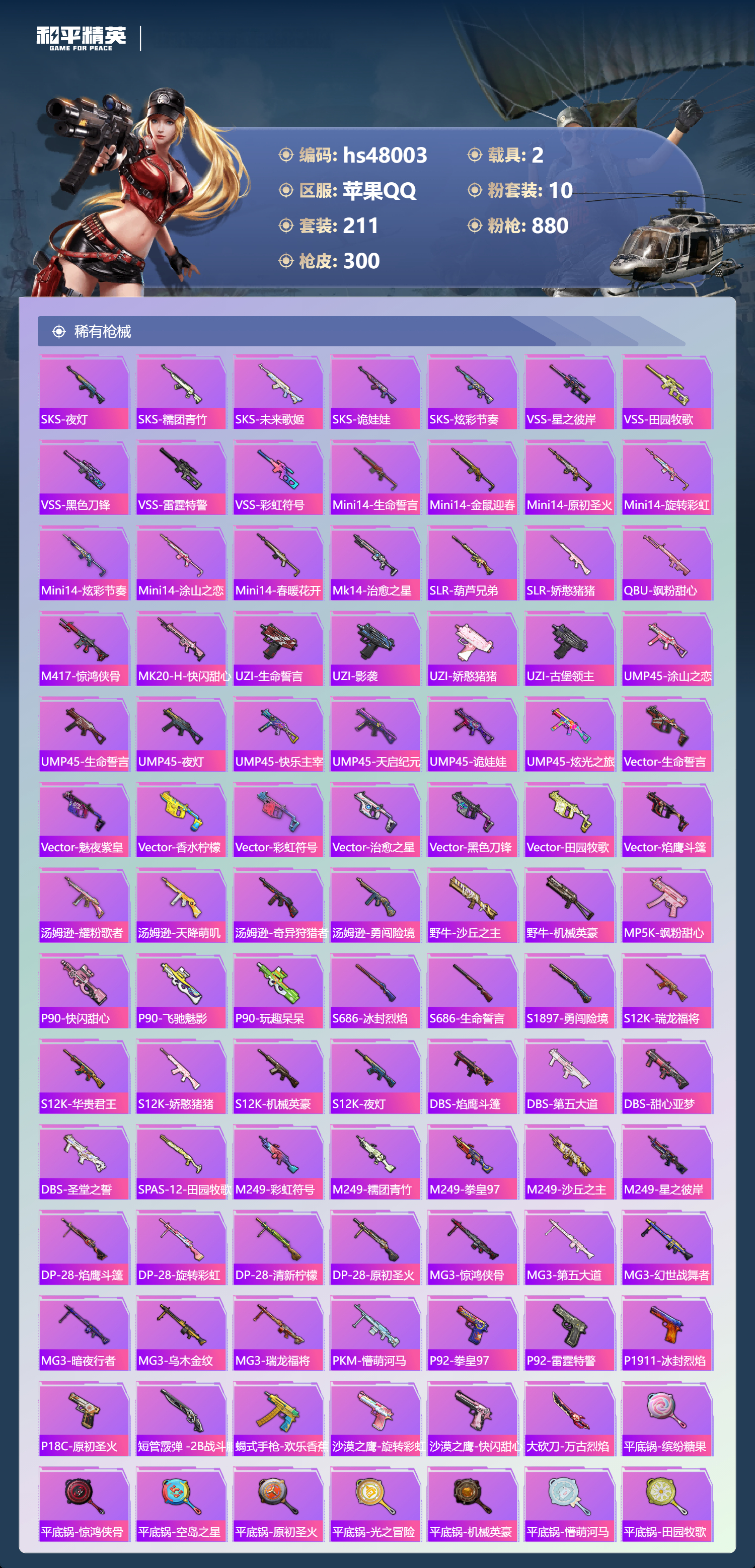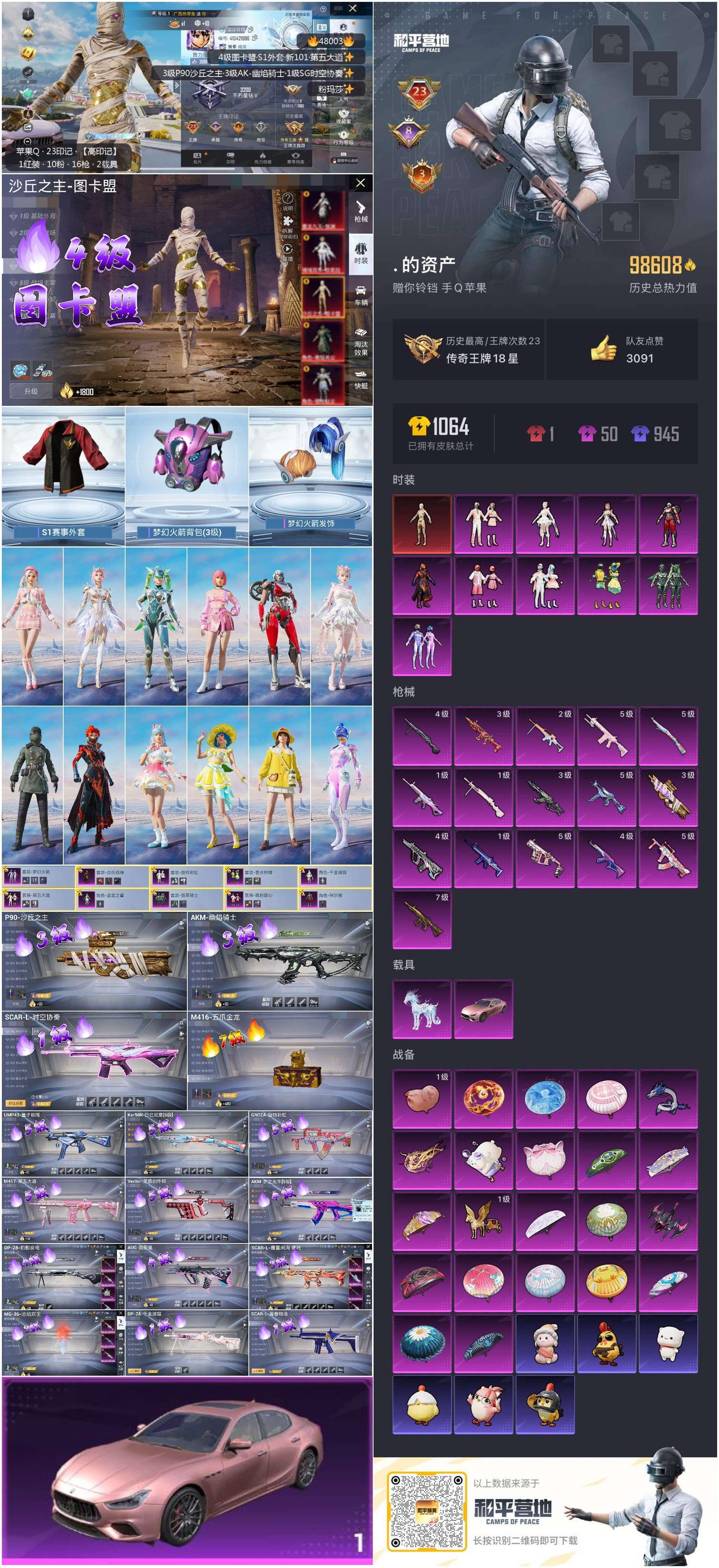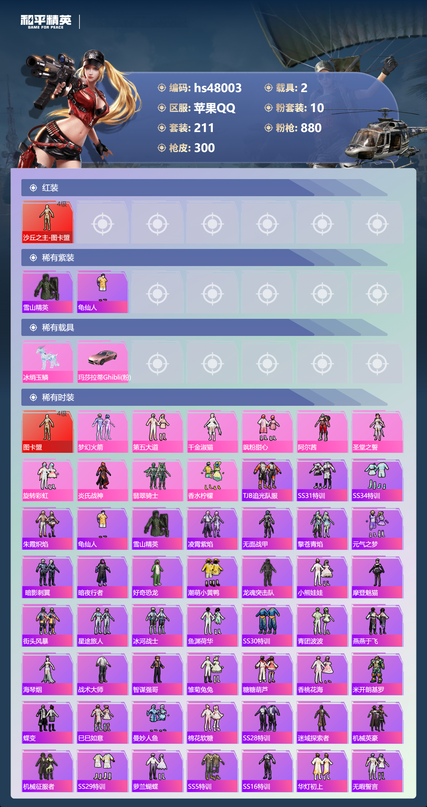 2235853苹果手q-23王牌印记-1红装-10粉装-16特效呛-2载具-98608热力值-211套装-300呛皮-8卓越印记-3传奇印记 【1红装】沙丘之主-图卡盟/4级 【10粉装】套装-梦幻火箭套装-翡翠骑士套装-香水柠檬套装-旋转彩虹套装-炎氏战神套装-第五大道套装-飒粉甜心角色-阿尔茜角色-圣堂之誓角色-千金淑猫 【16特效呛】m416-五爪金龙/7级gr