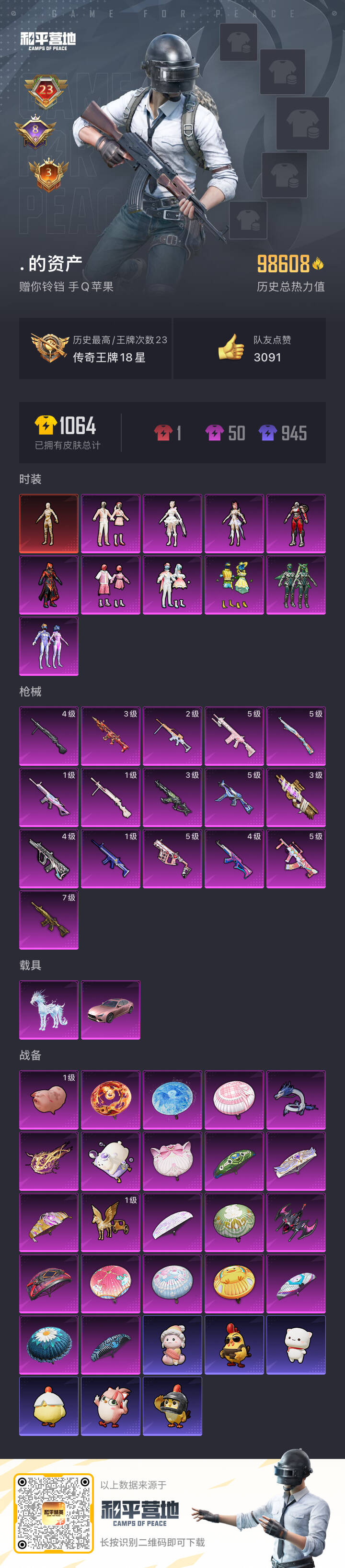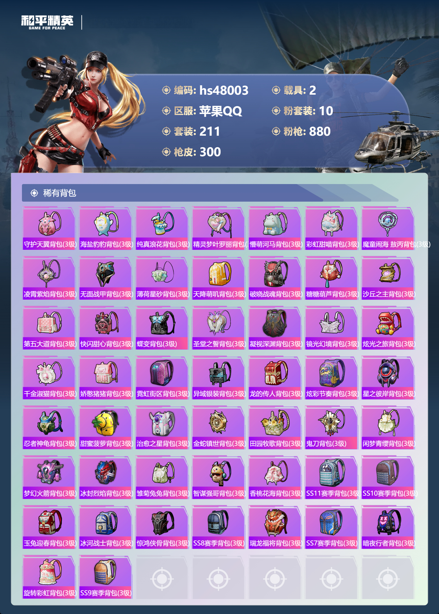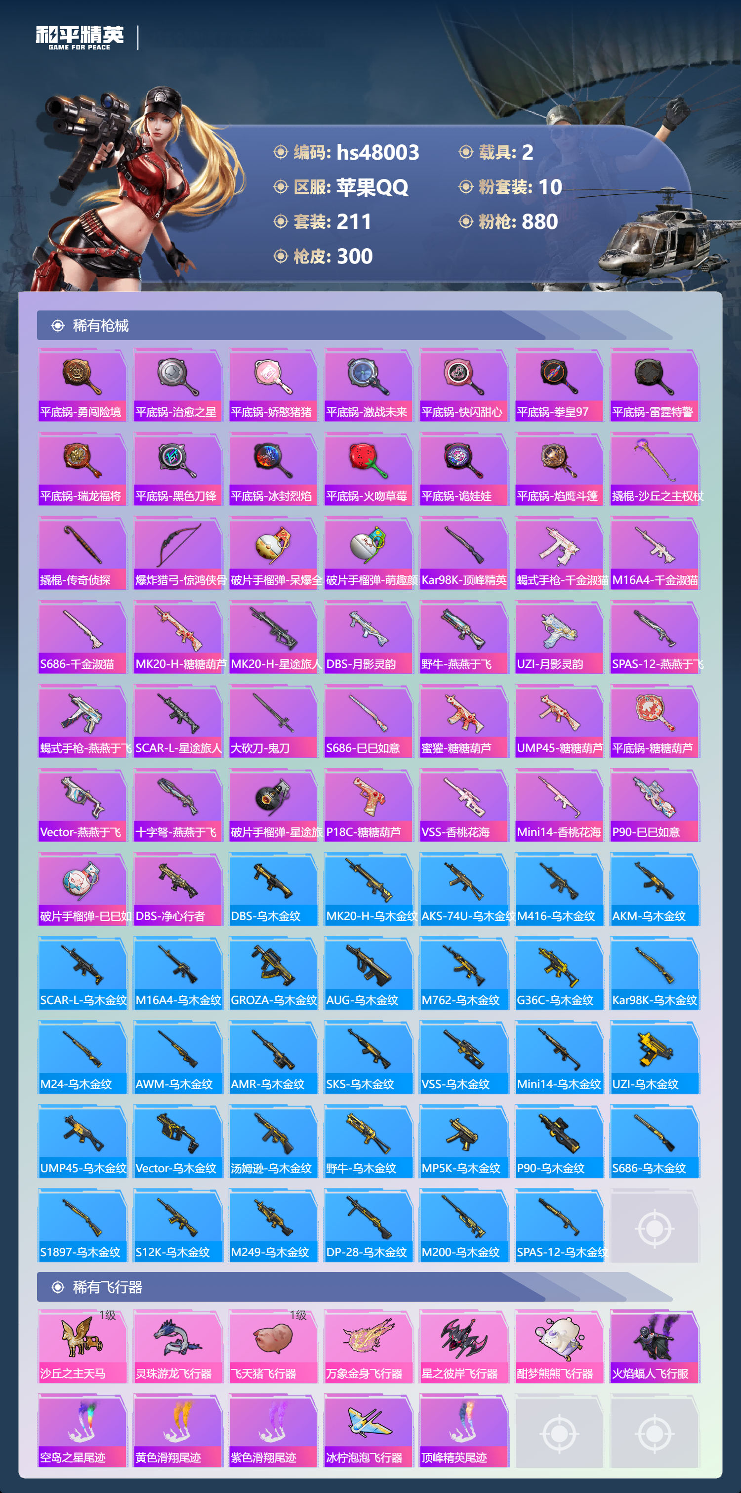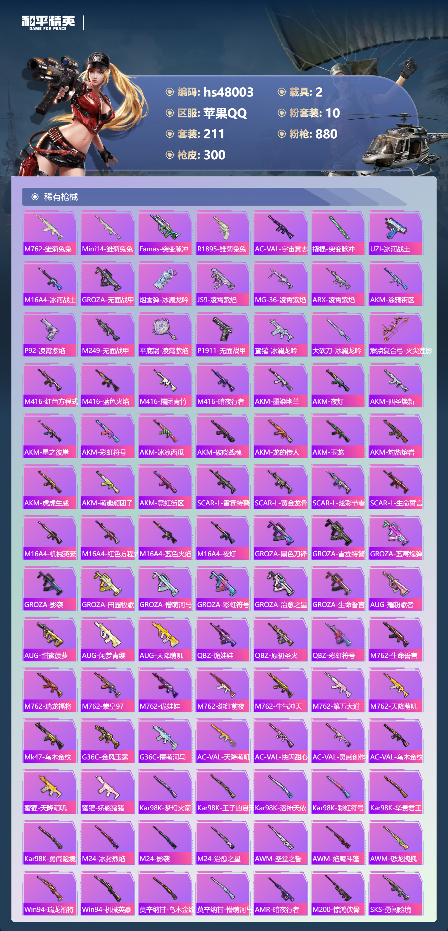 2235853苹果手q-23王牌印记-1红装-10粉装-16特效呛-2载具-98608热力值-211套装-300呛皮-8卓越印记-3传奇印记 【1红装】沙丘之主-图卡盟/4级 【10粉装】套装-梦幻火箭套装-翡翠骑士套装-香水柠檬套装-旋转彩虹套装-炎氏战神套装-第五大道套装-飒粉甜心角色-阿尔茜角色-圣堂之誓角色-千金淑猫 【16特效呛】m416-五爪金龙/7级gr