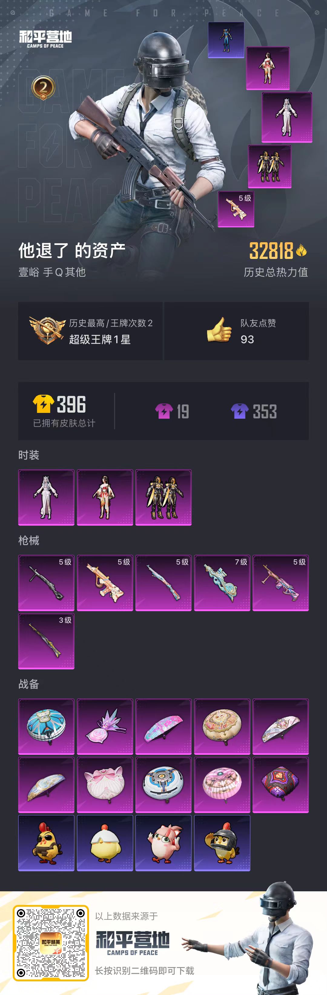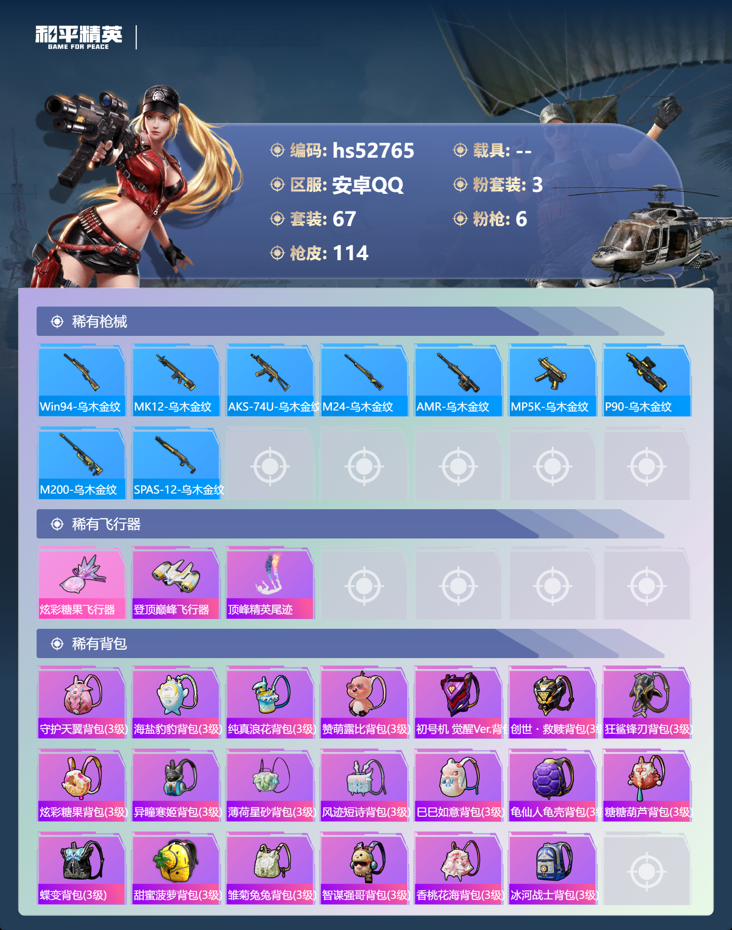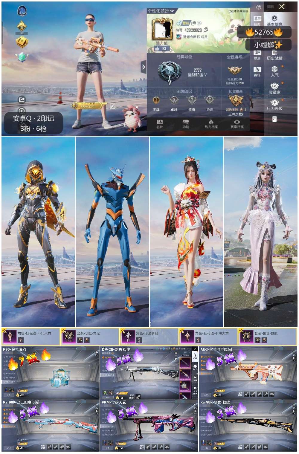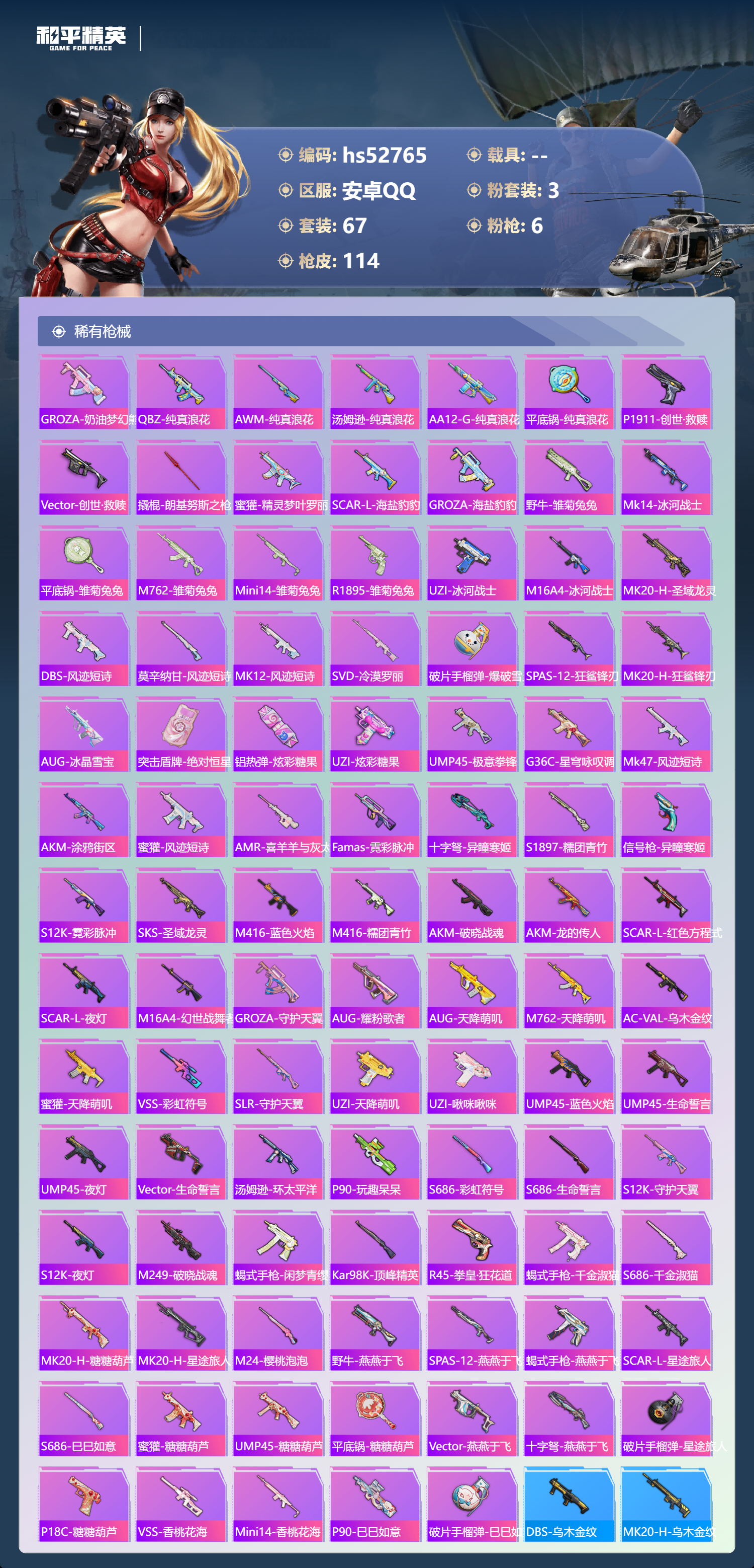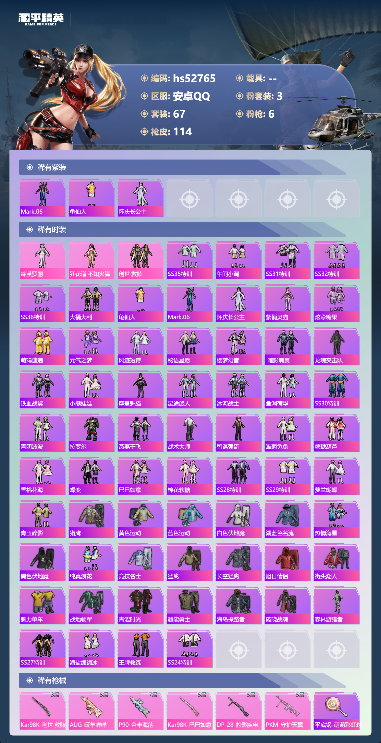 hs52765 安卓手q-2王牌印记-3粉装-6特效呛-32818热力值-67套装-114呛皮【3粉装】角色-狂花道·不知火舞套装-创世·救赎角色-冷漠罗丽【6特效呛】kar98k-巳巳如意/5级dp-28-豹影疾电/5级pkm-守护天翼/5级kar98k-创世·救赎/3级aug-暖羊咩咩/5级p90-金丰海韵/7级【3稀有紫装】mark.06龟仙人怀庆长公主【67稀有时