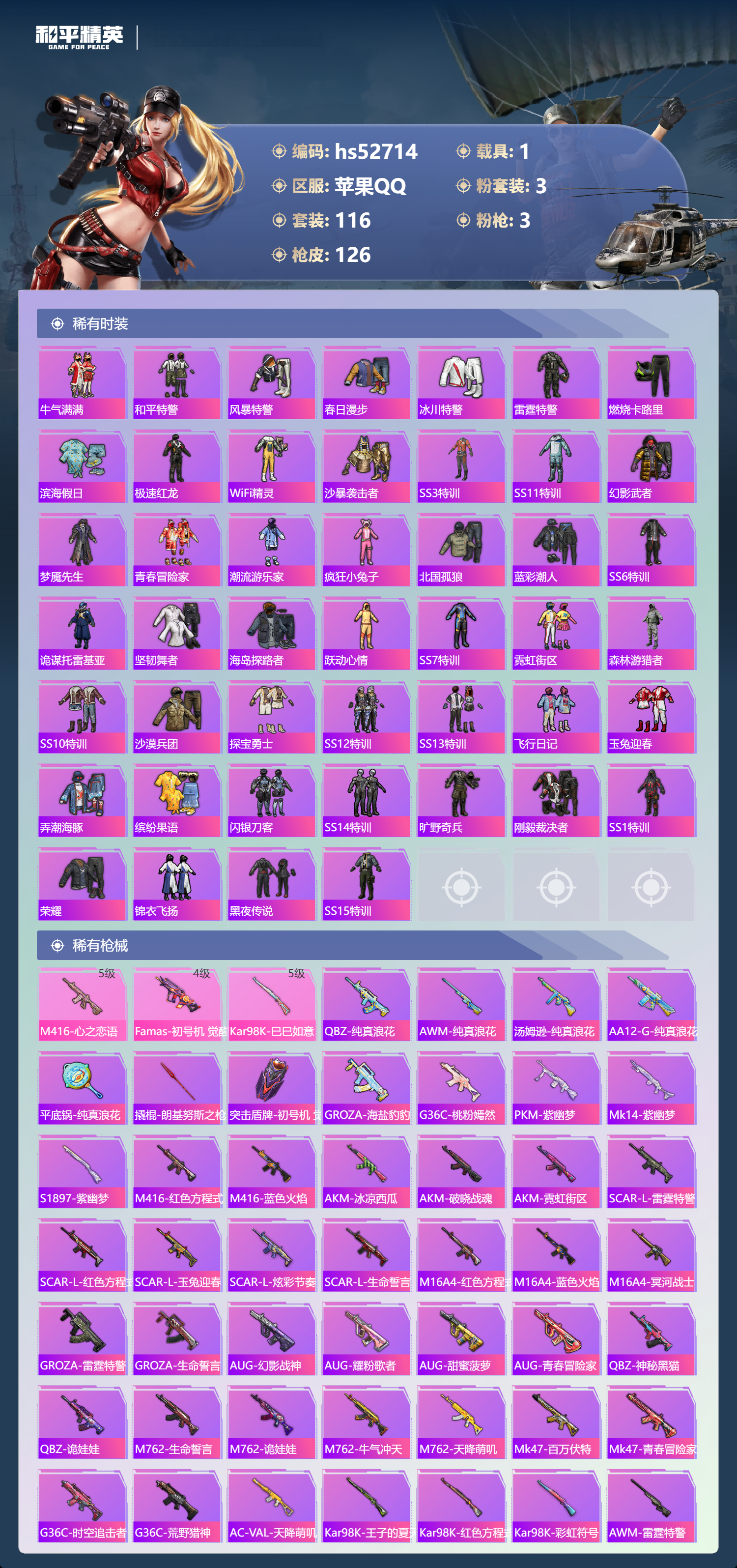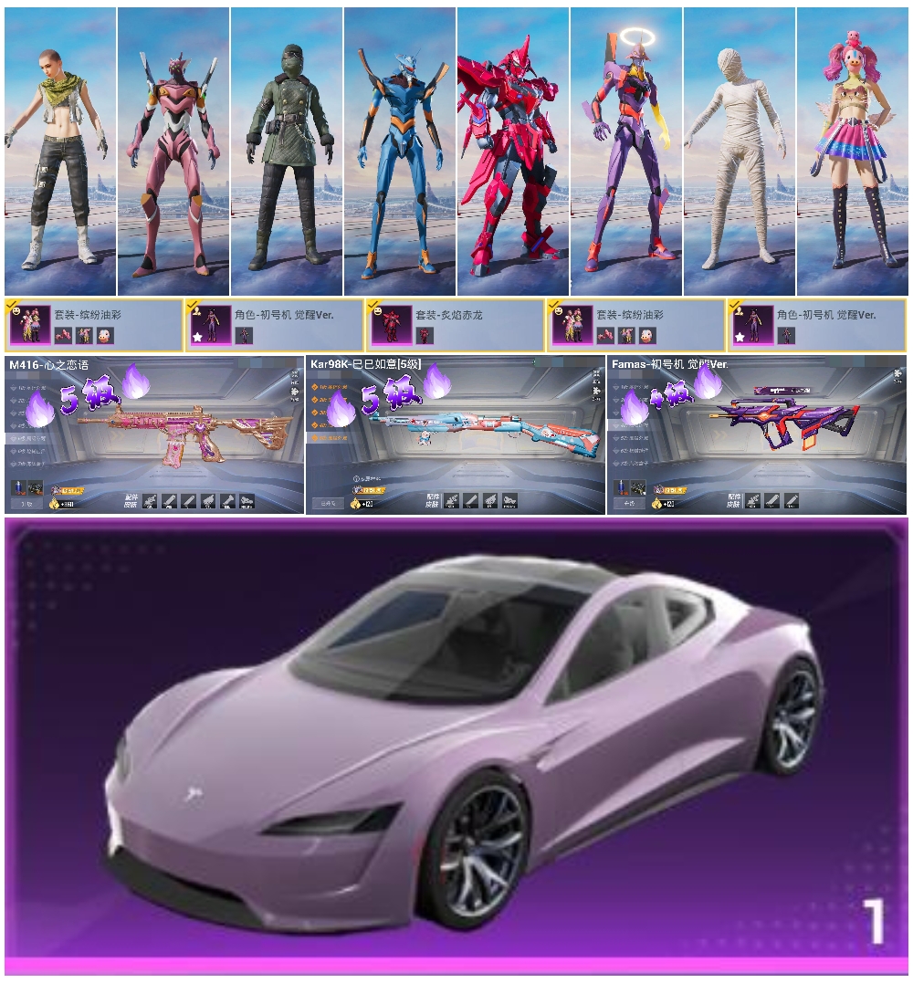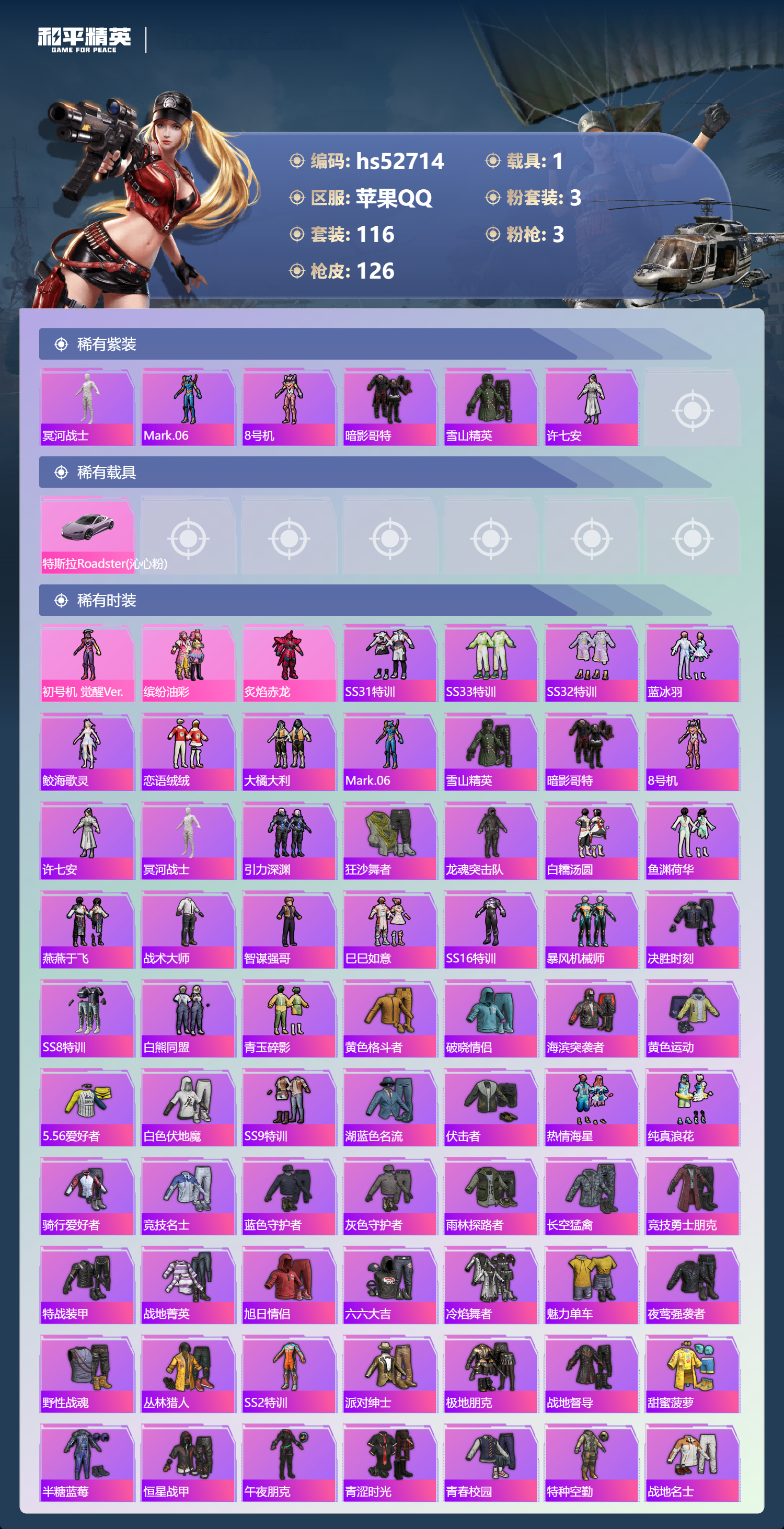 hs52714 苹果手q-1王牌印记-3粉装-3特效呛-1载具-36938热力值-116套装-126呛皮【3粉装】角色-初号机 觉醒ver.套装-炙焰赤龙套装-缤纷油彩【3特效呛】kar98k-巳巳如意/5级m416-心之恋语/5级famas-初号机 觉醒ver./4级【6稀有紫装】冥河战士mark.068号机暗影哥特雪山精英许七安【1稀有载具】特斯拉roadster沁