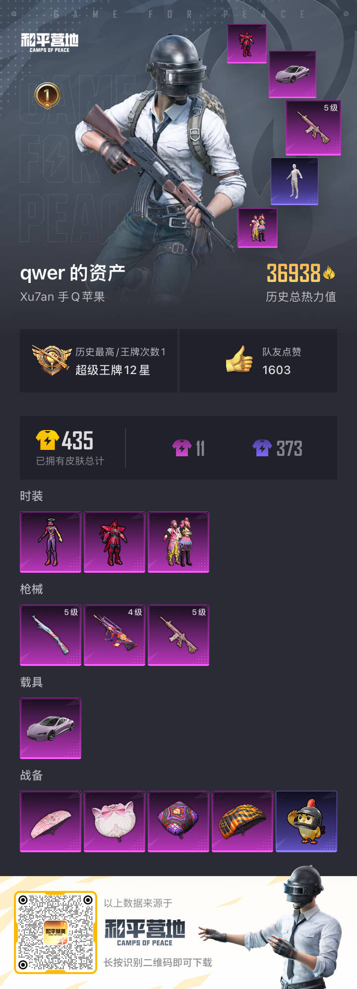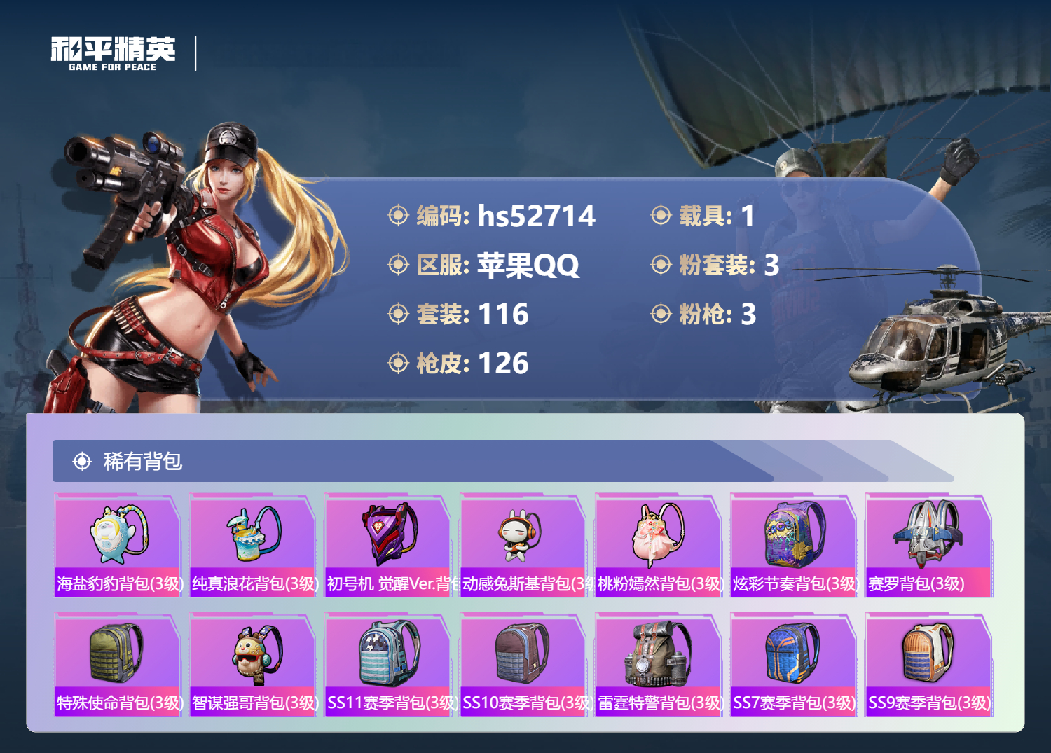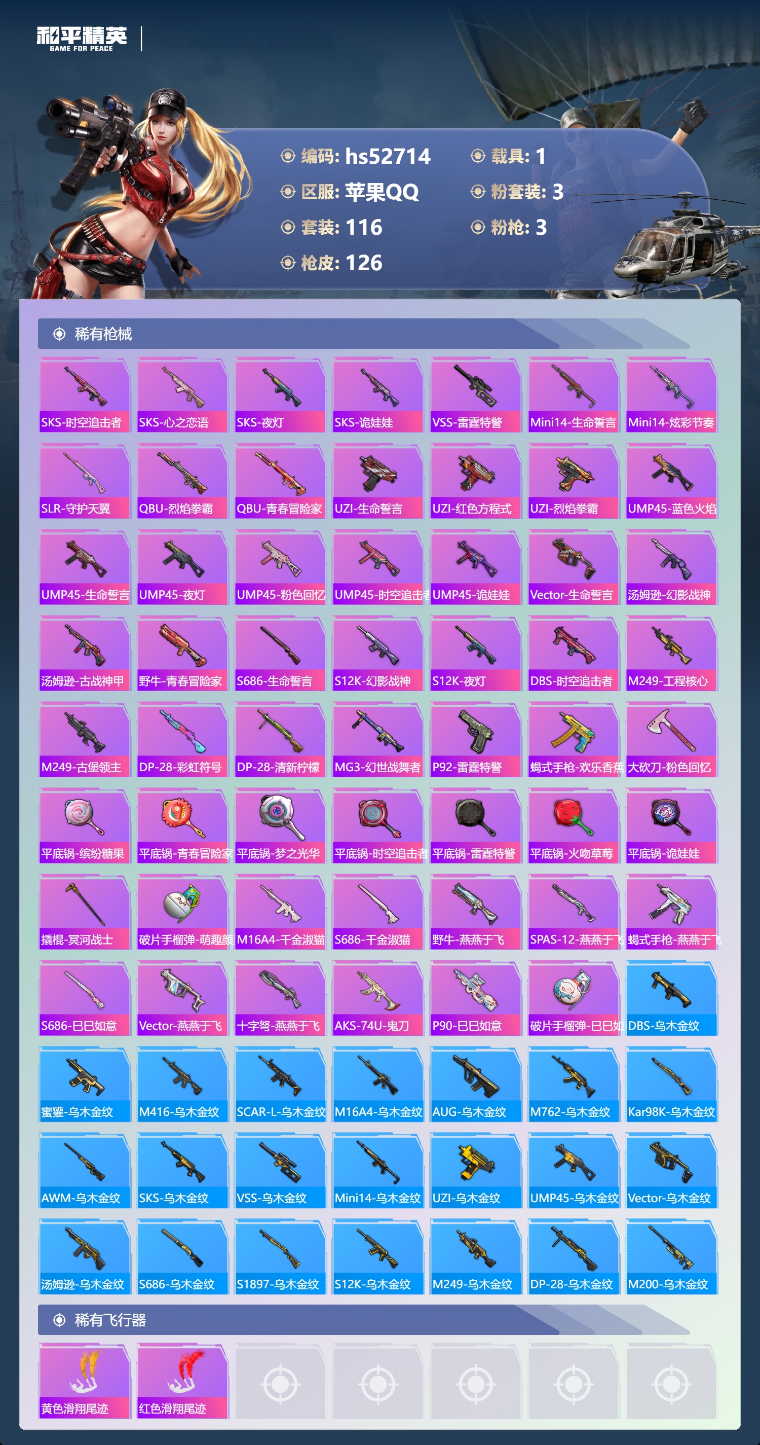 hs52714 苹果手q-1王牌印记-3粉装-3特效呛-1载具-36938热力值-116套装-126呛皮【3粉装】角色-初号机 觉醒ver.套装-炙焰赤龙套装-缤纷油彩【3特效呛】kar98k-巳巳如意/5级m416-心之恋语/5级famas-初号机 觉醒ver./4级【6稀有紫装】冥河战士mark.068号机暗影哥特雪山精英许七安【1稀有载具】特斯拉roadster沁
