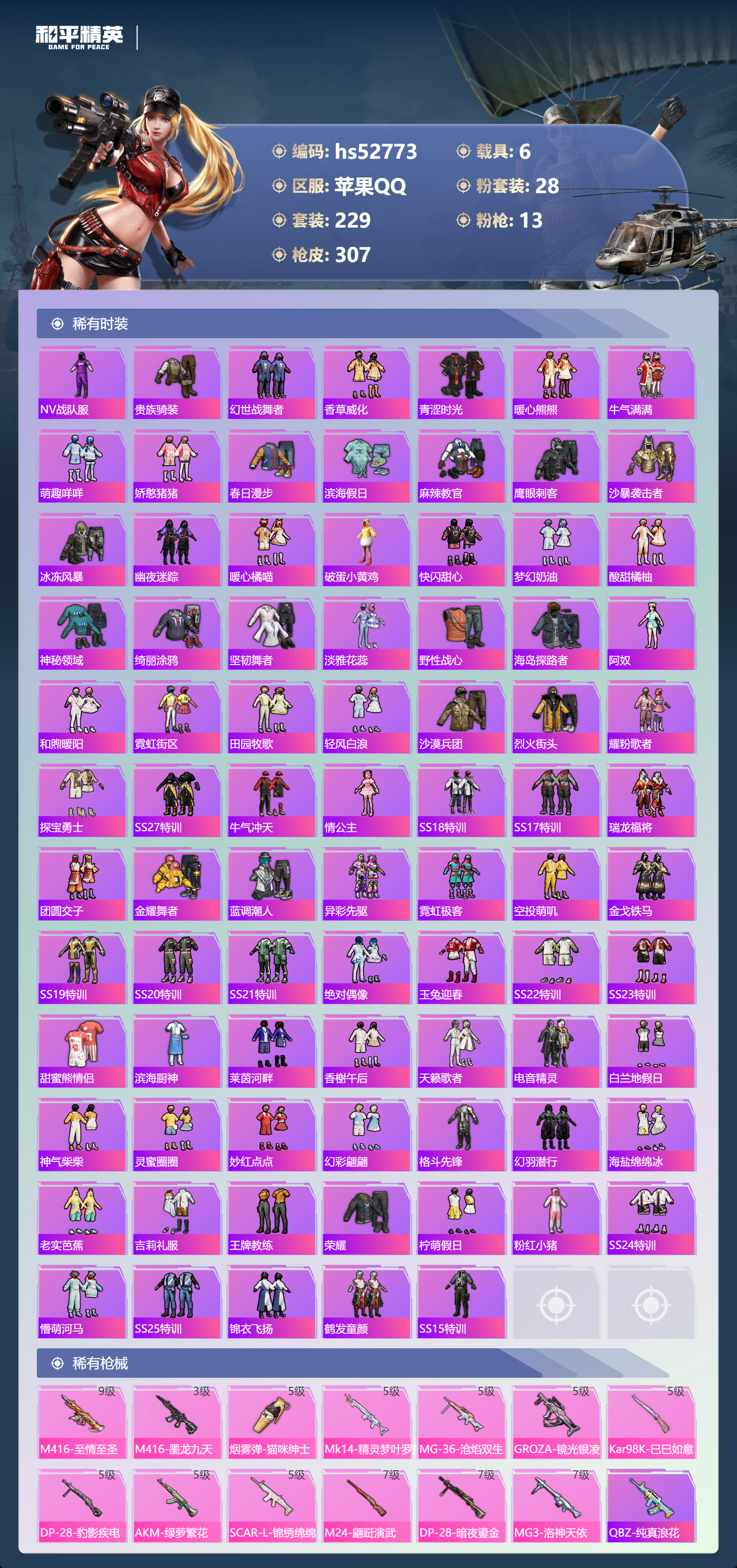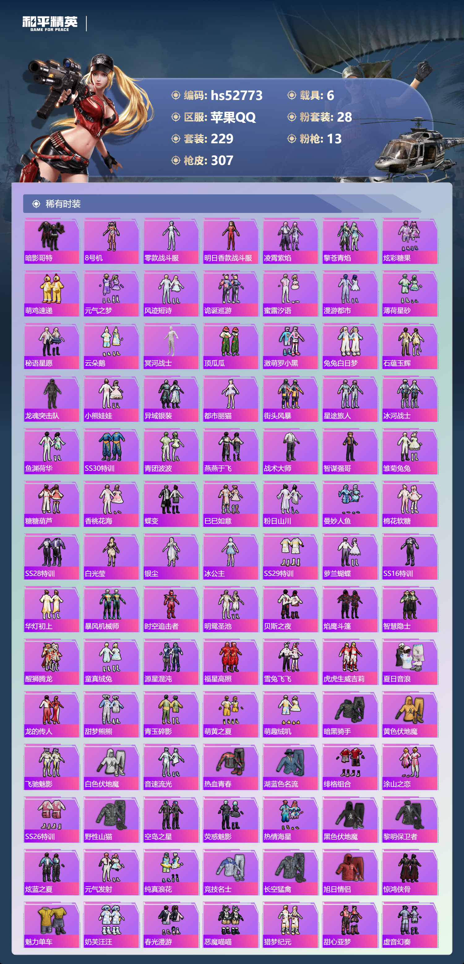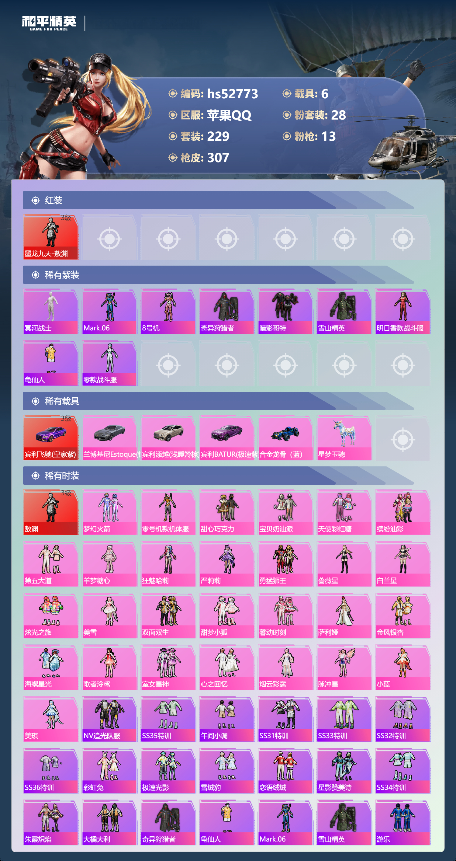 hs52773 苹果手q-19王牌印记-有战神框-1红装-28粉装-13特效呛-6载具-热力值-229套装-307呛皮-11卓越印记-11传奇印记【1红装】墨龙九天-敖渊/3级【28粉装】套装-天使彩虹糖套装-宝贝奶油派角色-美琪角色-白兰星套装-金风银杏套装-海螺星光角色-烟云彩露角色-零号机款机体服角色-美雪角色-蔷薇星套装-心之回忆套装-缤纷油彩角色-