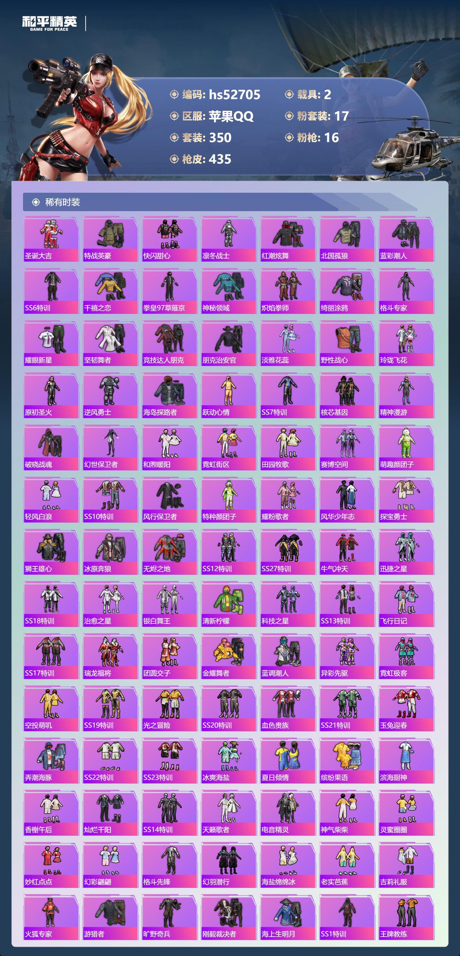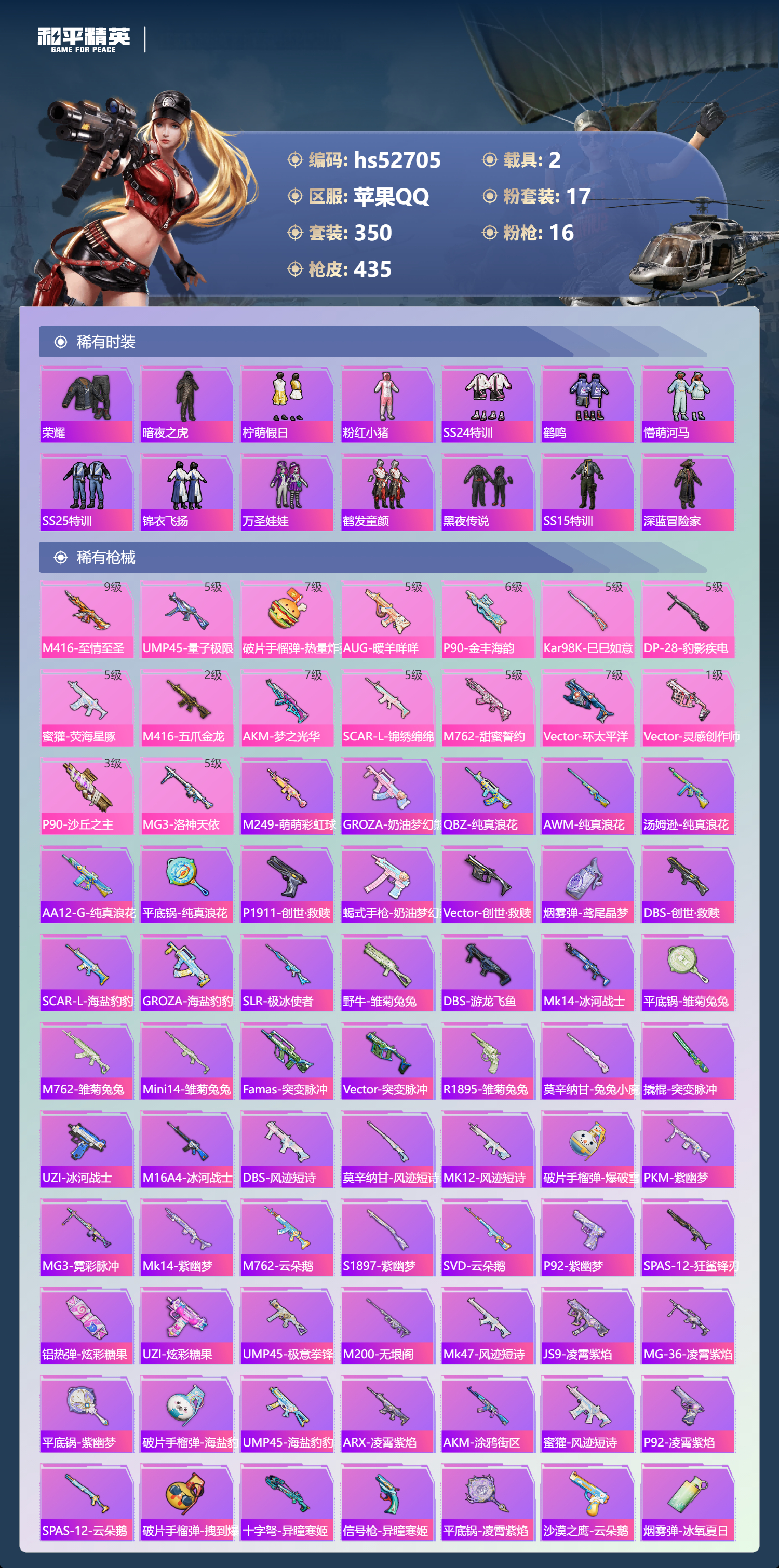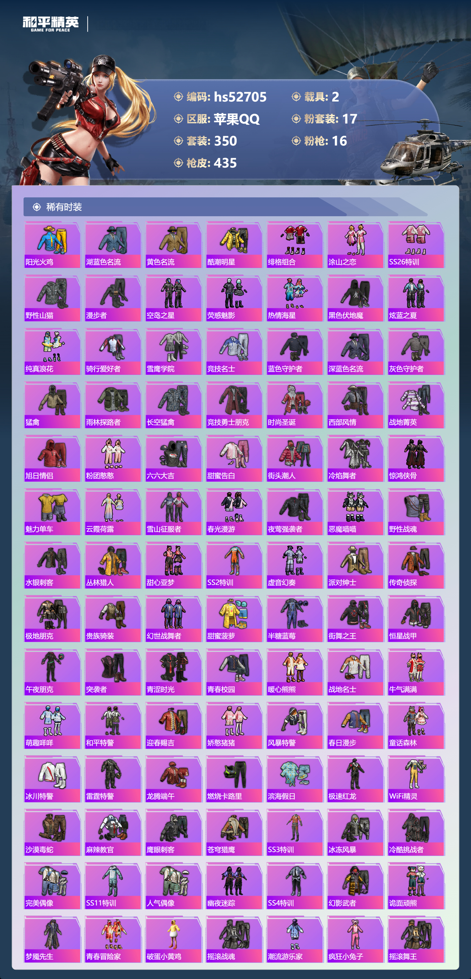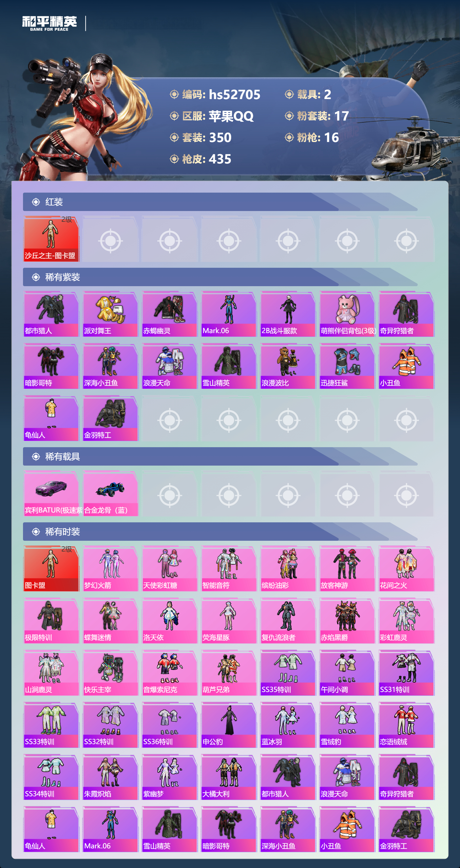 hs52705 苹果手q-21王牌印记-有战神框-1红装-17粉装-16特效呛-2载具-热力值-350套装-435呛皮-5卓越印记-2传奇印记【1红装】沙丘之主-图卡盟/2级【17粉装】套装-缤纷油彩套装-蝶舞迷情套装-彩虹鹿灵套装-智能音符角色-复仇流浪者套装-葫芦兄弟套装-音爆索尼克套装-极限特训角色-洛天依套装-天使彩虹糖套装-山涧鹿灵套装-花间之火角