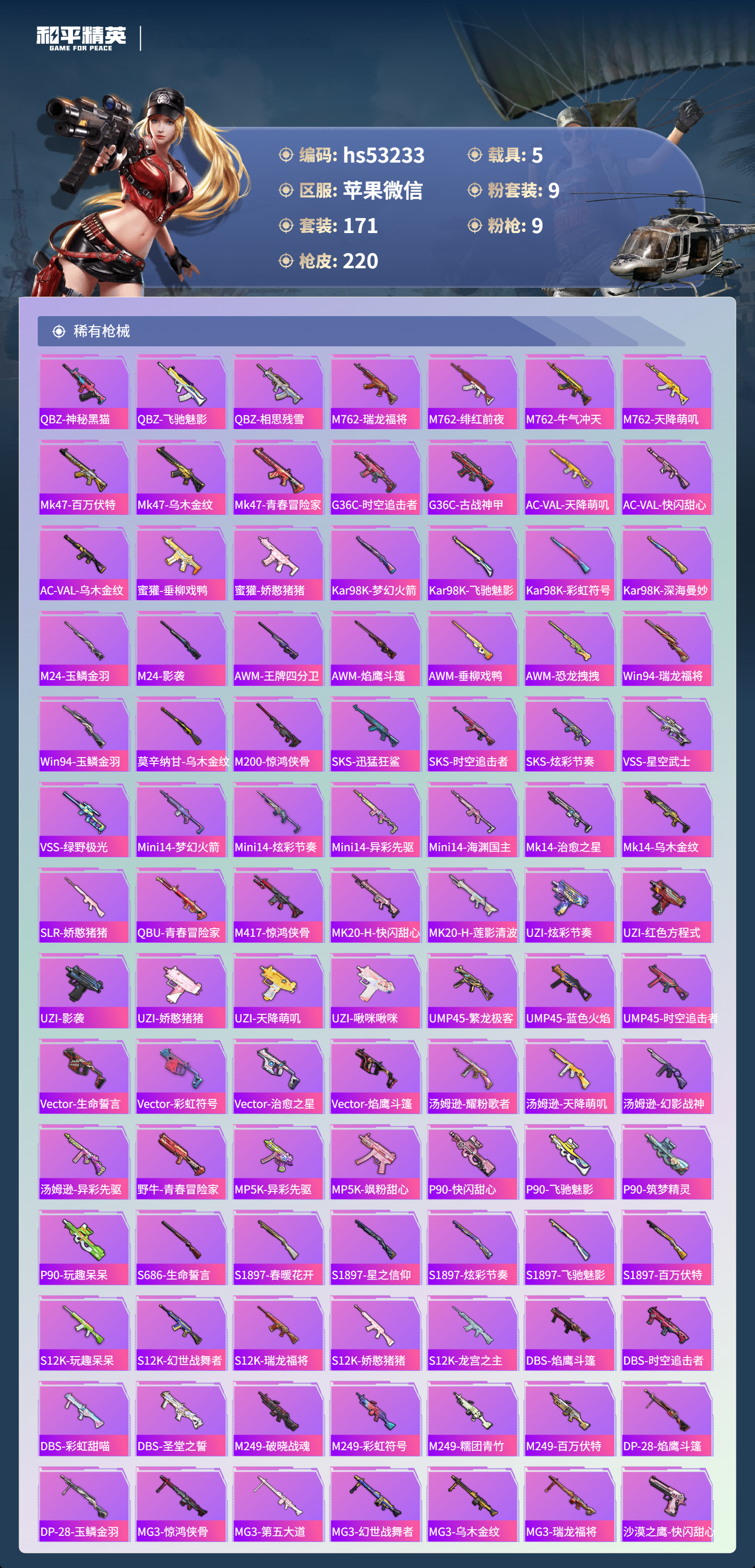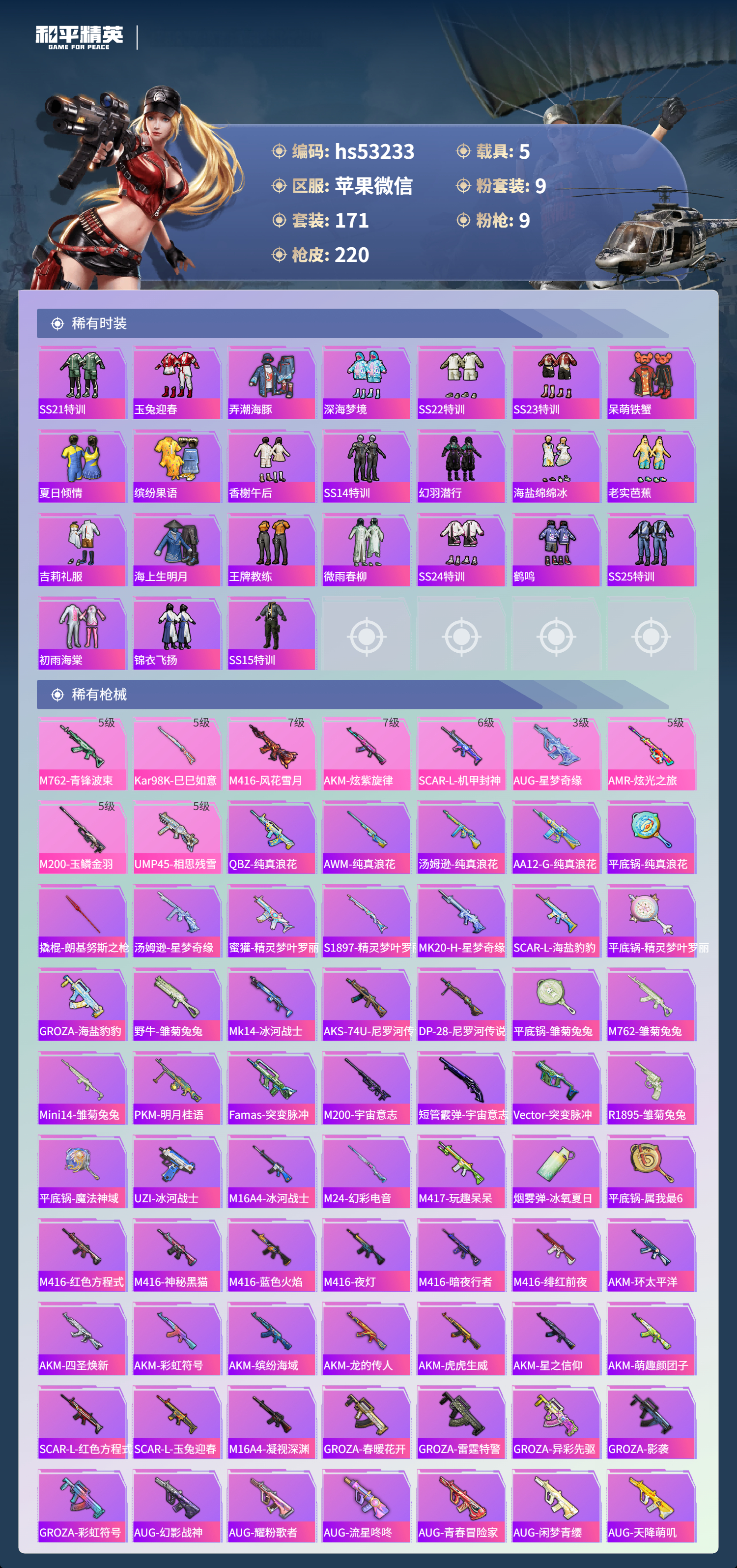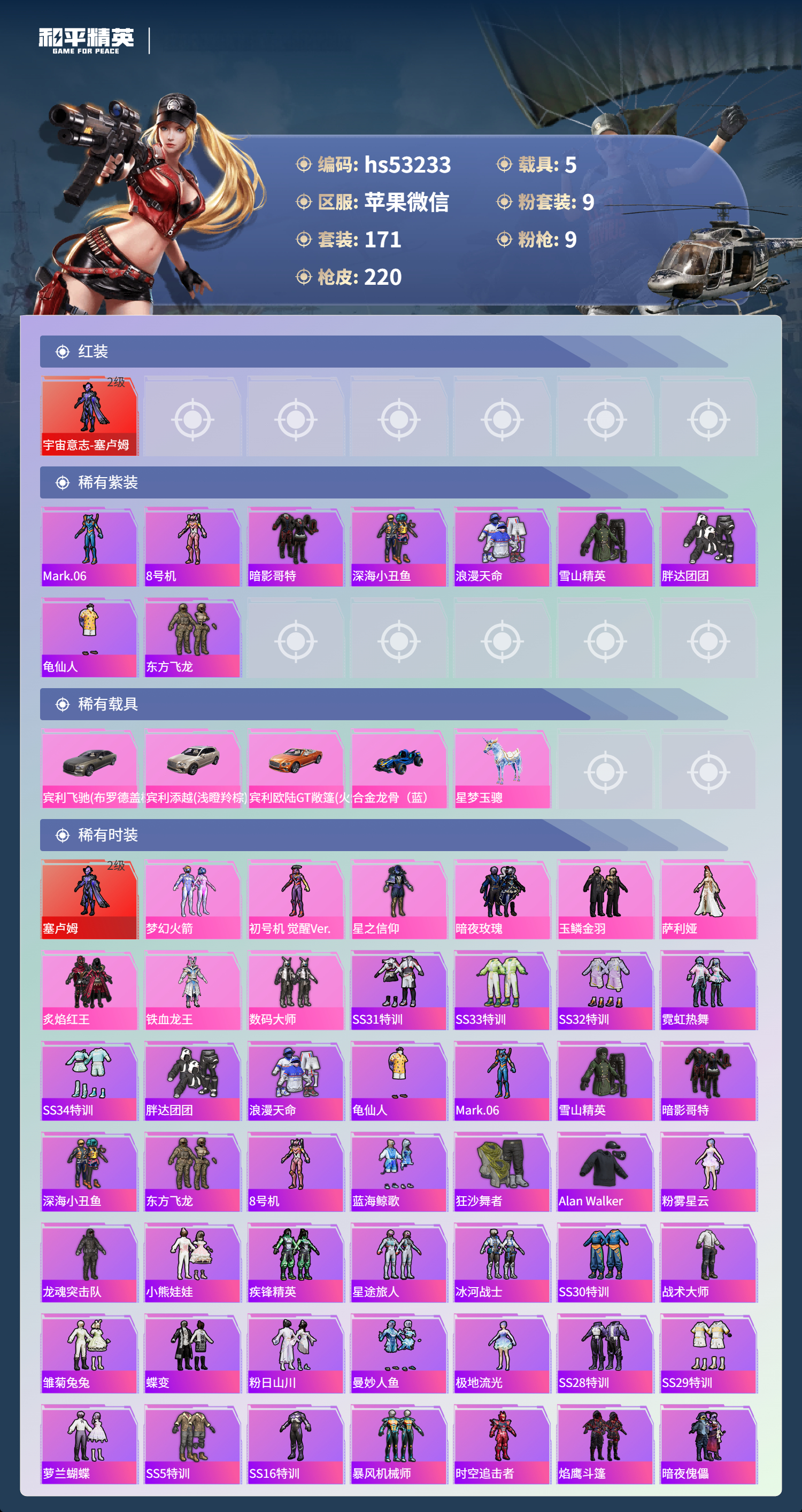 hs53233 苹果微信-12王牌印记-1红装-9粉装-9特效呛-5载具-83316热力值-171套装-220呛皮-3卓越印记【1红装】宇宙意志-塞卢姆/2级【9粉装】套装-暗夜玫瑰套装-梦幻火箭套装-星之信仰角色-初号机 觉醒ver.套装-铁血龙王套装-玉鳞金羽套装-炙焰红王角色-萨利娅套装-数码大师【9特效呛】m762-青锋波束/5级kar98k-巳巳如意/5级m41