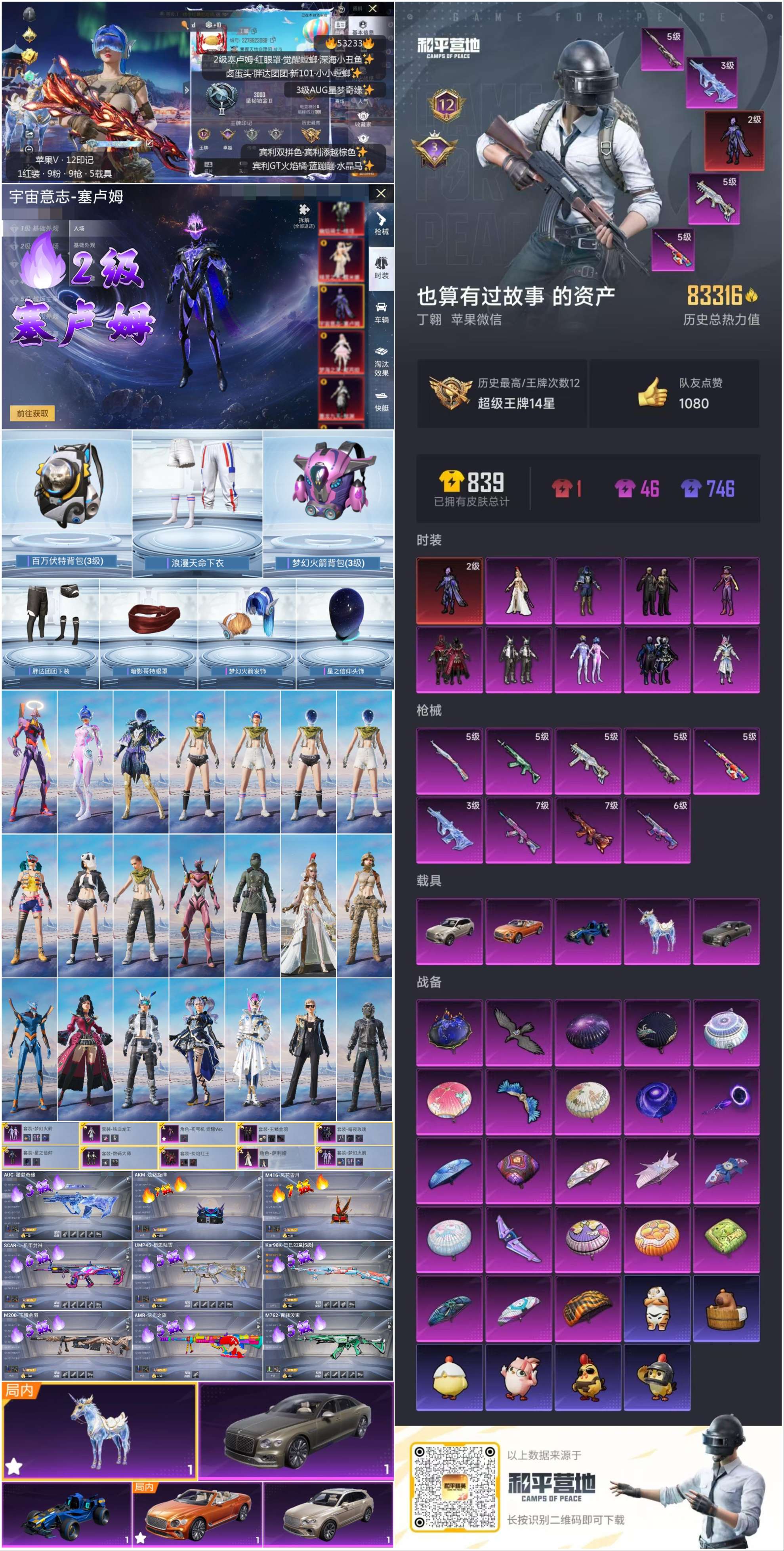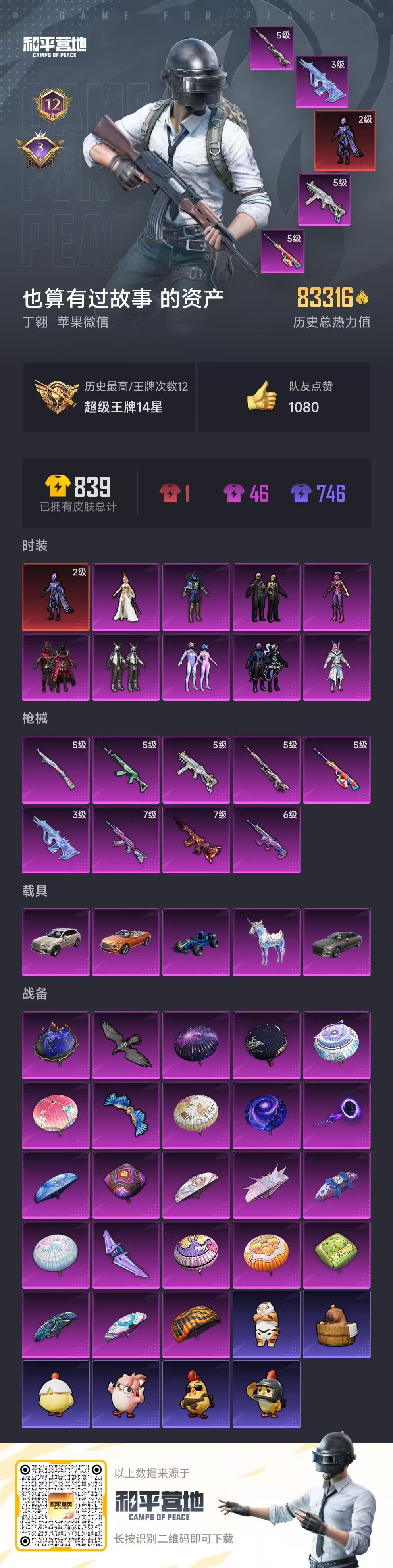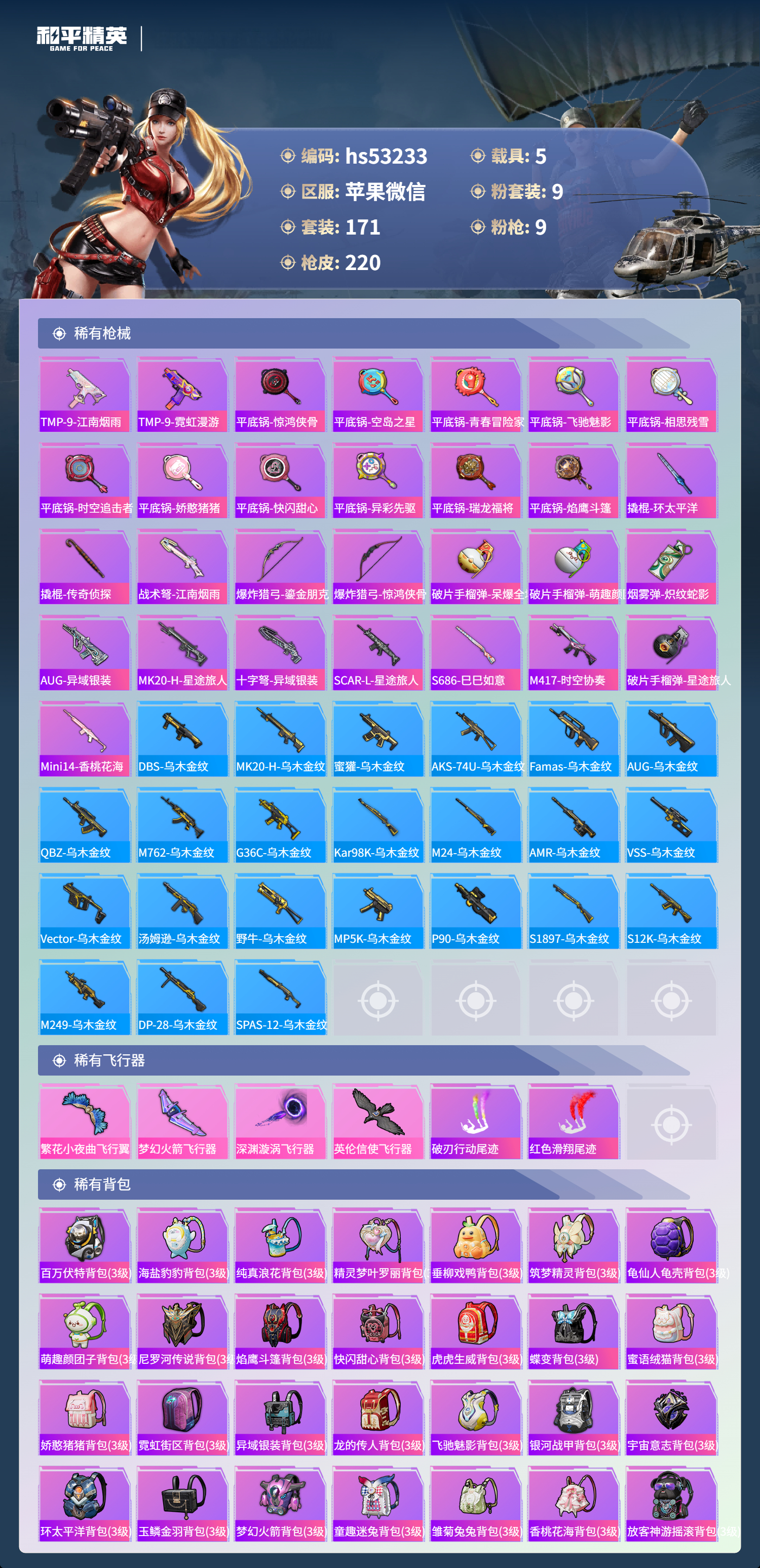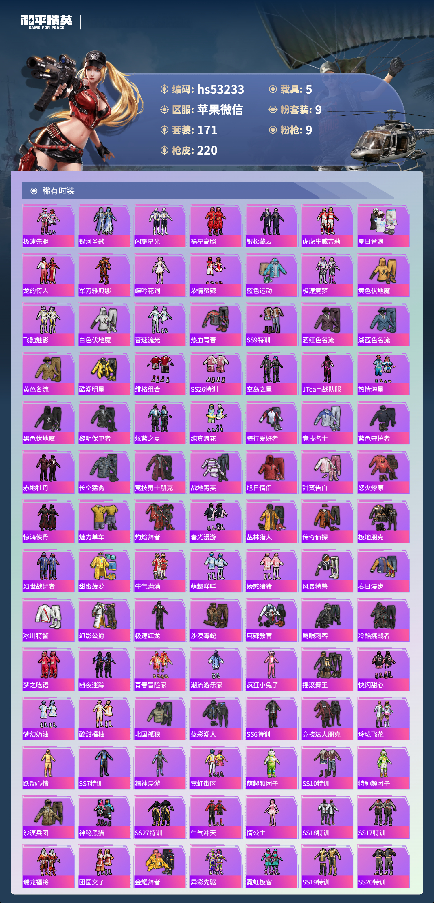 hs53233 苹果微信-12王牌印记-1红装-9粉装-9特效呛-5载具-83316热力值-171套装-220呛皮-3卓越印记【1红装】宇宙意志-塞卢姆/2级【9粉装】套装-暗夜玫瑰套装-梦幻火箭套装-星之信仰角色-初号机 觉醒ver.套装-铁血龙王套装-玉鳞金羽套装-炙焰红王角色-萨利娅套装-数码大师【9特效呛】m762-青锋波束/5级kar98k-巳巳如意/5级m41