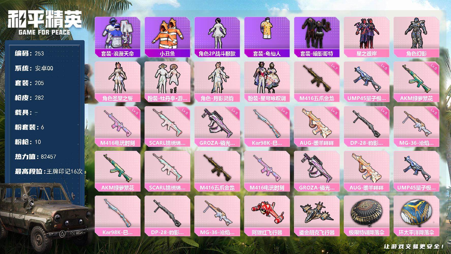 [14527914]连体王者荣耀 安卓 手q-6粉装-10特效呛-0载具-3粉色飞行器-82457热力值-16王牌印记-205套装-282呛皮 【热门品类】:套装-浪漫天命,套装-小丑鱼,角色-2p战斗服款,套装-龟仙人,套装-暗影哥特 【粉色套装】:粉装-星之彼岸,角色-幻影,角色-圣堂之誓,粉装-牡丹亭·游园,角色-月影灵韵,粉装-星穹咏叹调 【粉色呛皮等级】:akm-绿萝繁花五级,scar-l-锦绣绵绵五级,m416-五爪金龙七级,m416-电玩时刻五级,groza-镜光银凌五级,aug-暖羊咩咩五级,ump45-量子极限五级,kar98k-巳巳如意五级,dp-28-豹影疾电五级,mg-36-沧焰双生五级 【粉色呛皮】:akm-绿萝繁花,scar-l-锦绣绵绵,m416-五爪金龙,m416-电玩时刻,groza-镜光银凌,aug-暖羊咩咩,ump45-量子极限,kar98k-巳巳如意,dp-28-豹影疾电,mg-36-沧焰双生 【粉色飞行器】:阿狸红飞行器,鎏金朋克飞行器 【粉色降落伞】:极限特训降落伞,环太平洋降落伞,拂晓神骑降落伞,超新星降落伞,萌酷奶龙降落伞,辉耀战甲降落伞,江南烟雨降落伞,精灵梦叶罗丽降落伞,冠军兔兔降落伞,未来领航者降落伞,智耀战神降落伞,幻彩电音降落伞,最终圣卫者降落伞,绯穹魔姬降落伞,异瞳寒姬降落伞 【稀有套装】:套装-龟仙人,套装-巳巳如意,套装-糖糖葫芦,套装-青团波波,套装-棉花软糖,角色-怀庆长公主,角色-光矢逐梦,套装-燕燕于飞,套装-鱼渊荷华,套装-粉恋花,套装-紫幽梦,套装-蓝冰羽,套装-极速光影,套装-彩虹兔,套装-云朵鹅,套装-雪绒豹,角色-时希公主,角色-夜瞳黯灵,套装-朱霞炽焰,套装-凌霄紫焰,套装-擎苍青焰,角色-绯色魅影,套装-炫彩糖果 【稀有呛皮】:aug-冰晶雪宝,akm-彩虹符号,akm-灼热熔岩,akm-破晓战魂,akm-萌趣颜团子,akm-萝萝小趴兔,akm-虎虎生威,akm-霓虹街区,akm-龙的传人,akm-灵猫魔法师,m16a4-幻世战舞者,m16a4-快乐主宰,m16a4-甜心亚梦,m16a4-红色方程式,m16a4-蓝色火焰,scar-l-夜灯,scar-l-炫彩节奏,scar-l-玉兔迎春,scar-l-红色方程式,m416-夜灯,m416-糯团青竹,m416-