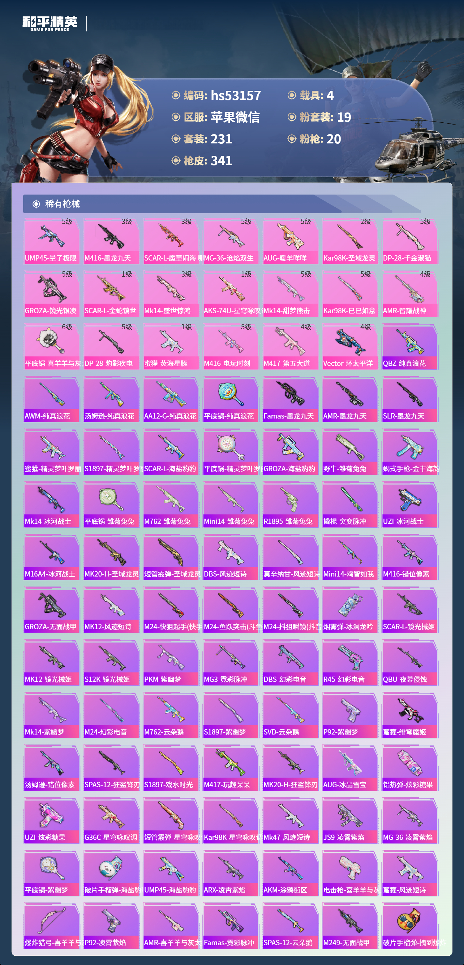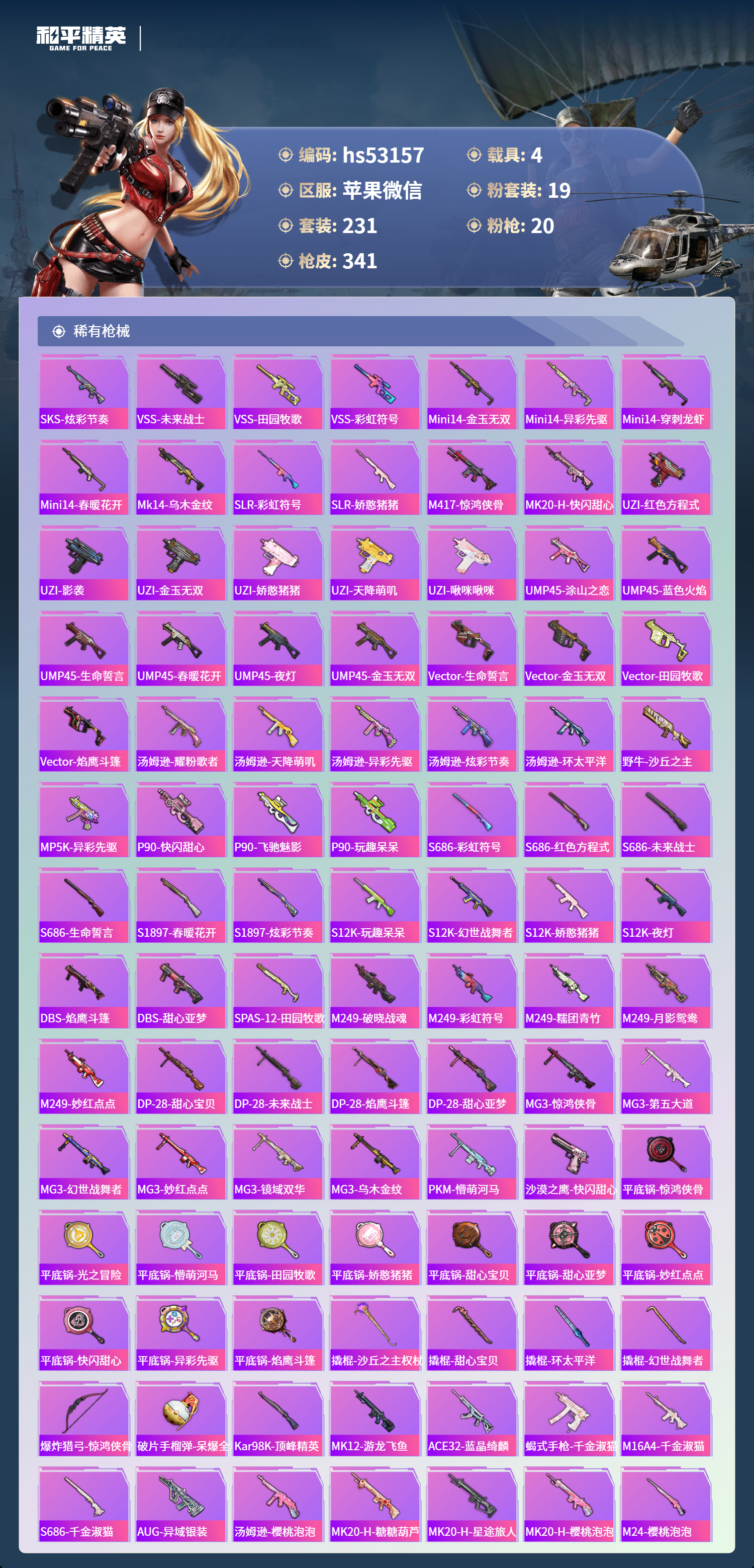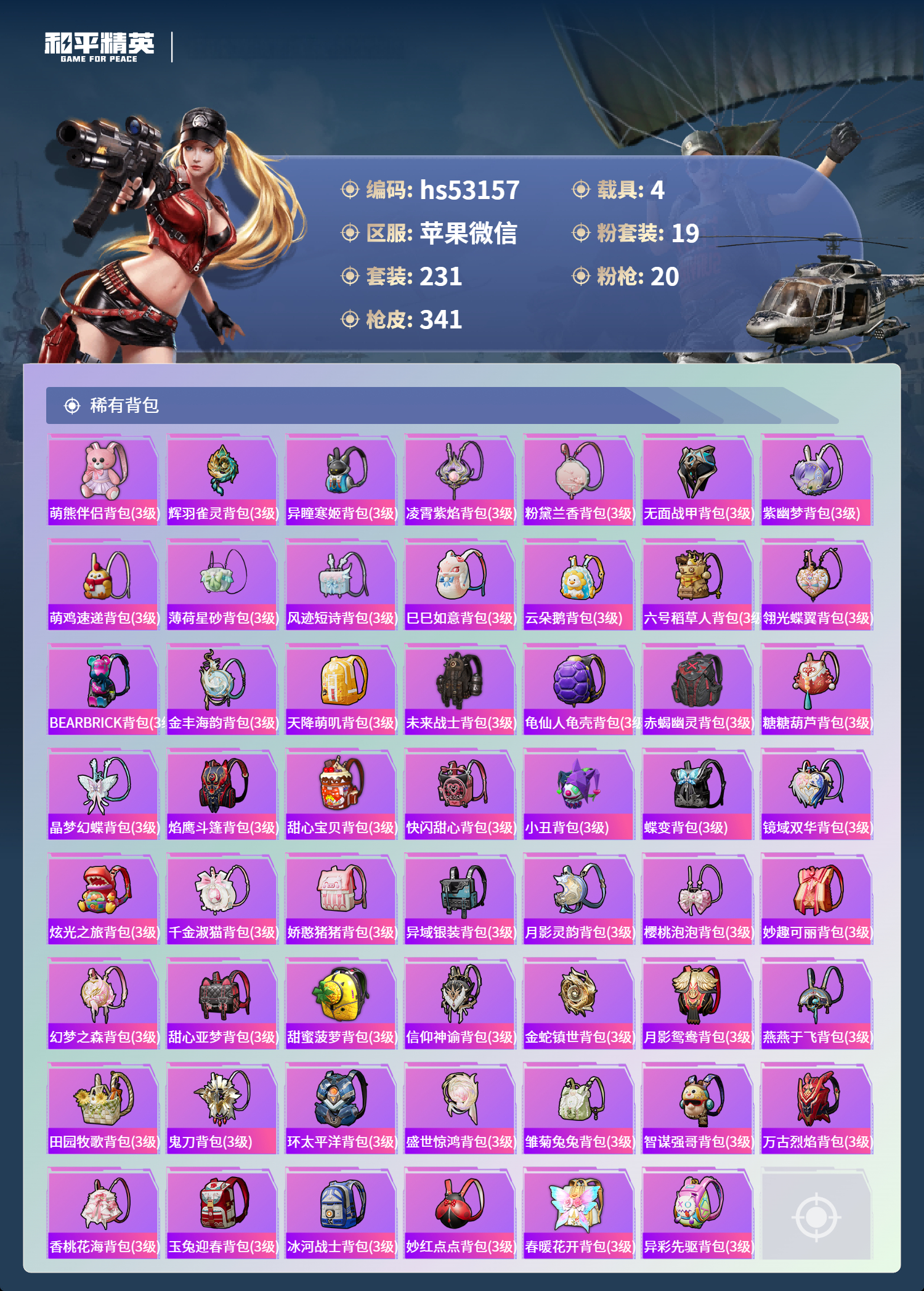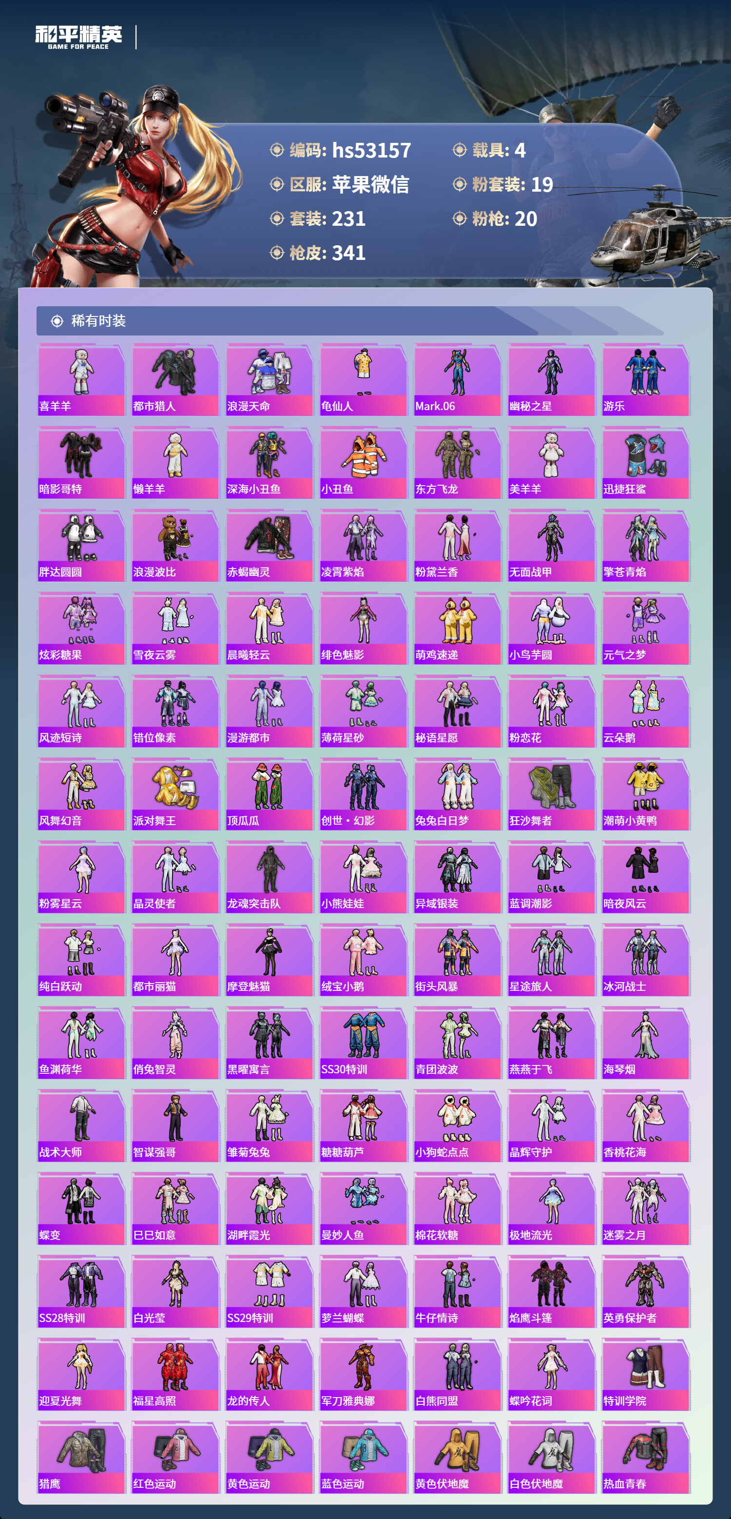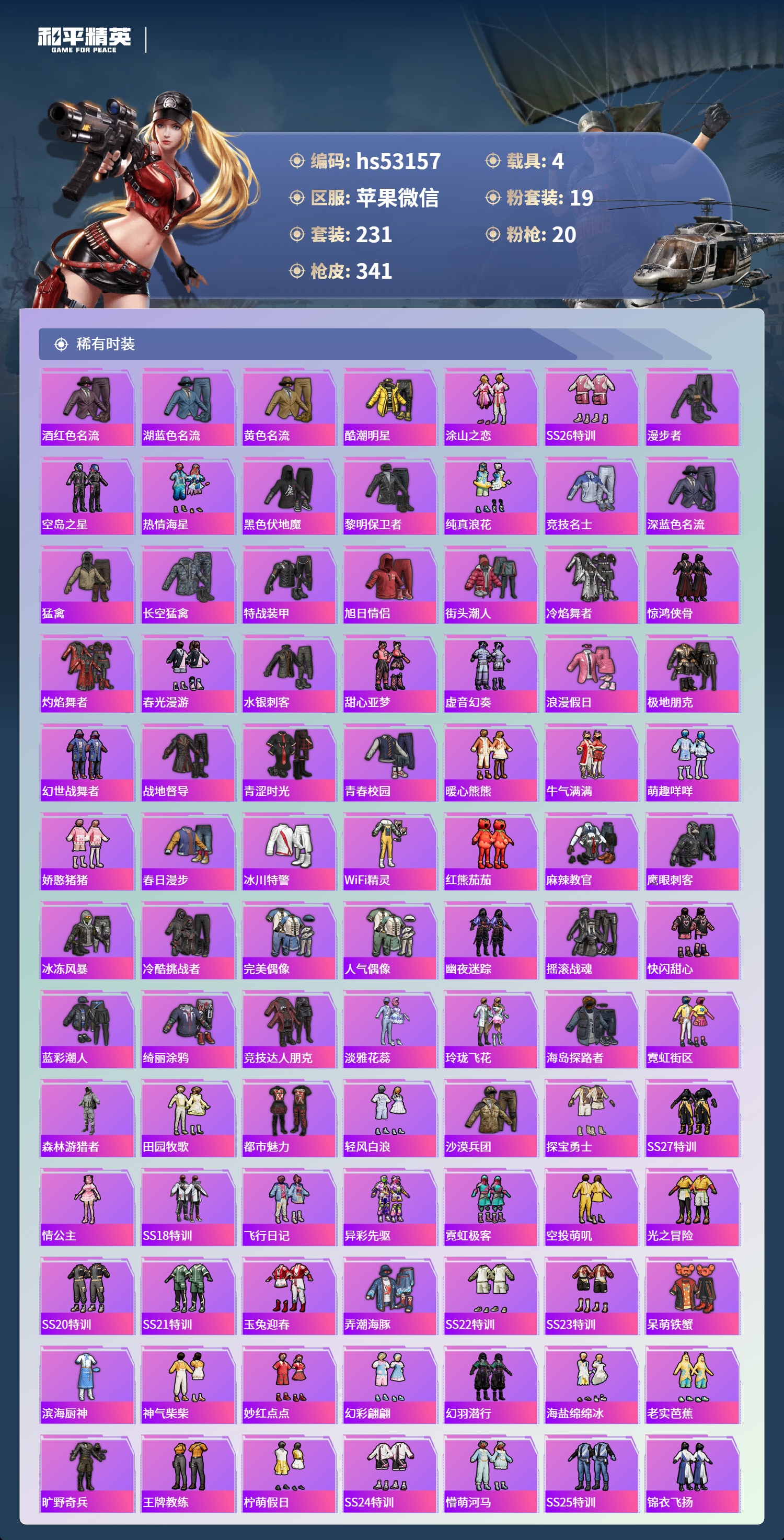 hs53157 苹果微信-16王牌印记-2红装-19粉装-20特效呛-4载具-热力值-231套装-341呛皮-7卓越印记-5传奇印记【2红装】最终圣卫者-帕修斯/1级沙丘之主-图卡盟/3级【19粉装】套装-未来战士角色-狂花道·不知火舞套装-缤纷油彩套装-星穹咏叹调套装-雪月幻音套装-梦幻火箭角色-萨利娅角色-复仇流浪者角色-光极星套装-天使彩虹糖角色-千金淑