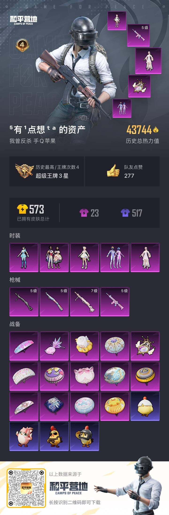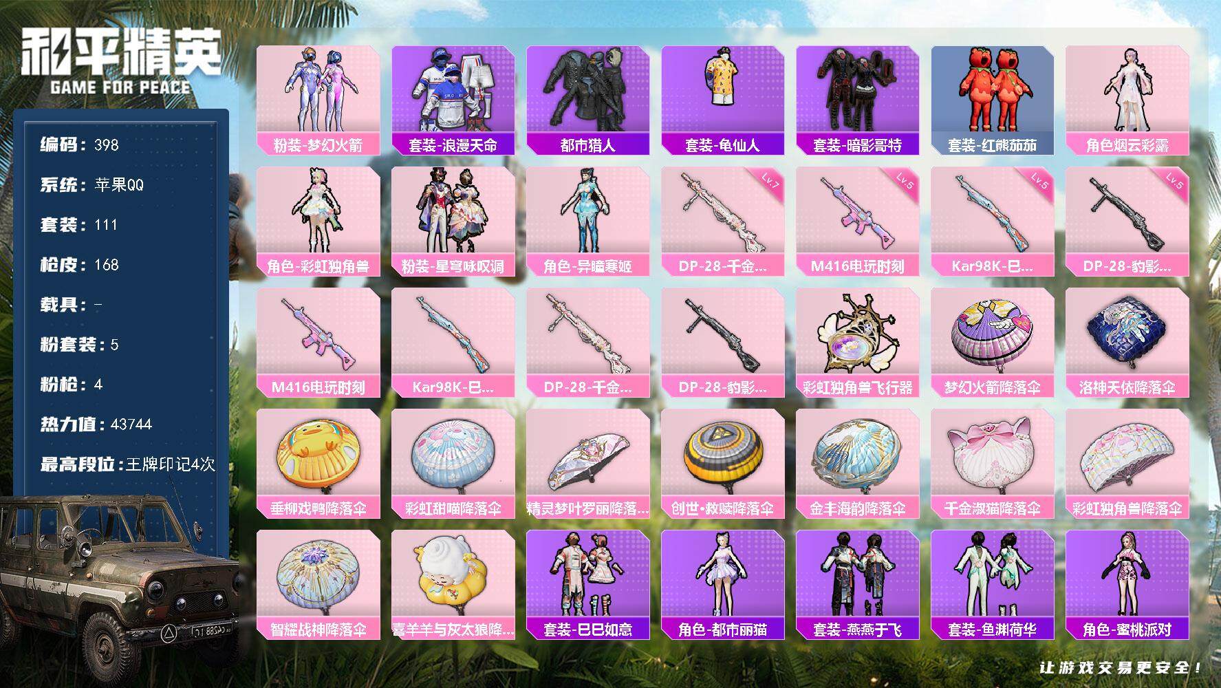 [14528796]连体号,铠银白咏叹调,至尊宝,和平都市猎人 苹果 手q-5粉装-4特效呛-0载具-2粉色飞行器-43744热力值-4王牌印记-111套装-168呛皮 【热门品类】:粉装-梦幻火箭,套装-浪漫天命,套装-都市猎人,套装-龟仙人,套装-暗影哥特,套装-红熊茄茄 【粉色套装】:粉装-梦幻火箭,角色-烟云彩露,角色-彩虹独角兽,粉装-星穹咏叹调,角色-异瞳寒姬 【粉色呛皮等级】:m416-电玩时刻五级,kar98k-巳巳如意五级,dp-28-千金淑猫七级,dp-28-豹影疾电五级 【粉色呛皮】:m416-电玩时刻,kar98k-巳巳如意,dp-28-千金淑猫,dp-28-豹影疾电 【粉色飞行器】:彩虹独角兽飞行器 【粉色降落伞】:梦幻火箭降落伞,洛神天依降落伞,垂柳戏鸭降落伞,彩虹甜喵降落伞,精灵梦叶罗丽降落伞,创世·救赎降落伞,金丰海韵降落伞,千金淑猫降落伞,彩虹独角兽降落伞,智耀战神降落伞,喜羊羊与灰太狼降落伞 【稀有套装】:套装-龟仙人,套装-巳巳如意,角色-都市丽猫,套装-燕燕于飞,套装-鱼渊荷华,角色-蜜桃派对,套装-朱霞炽焰,套装-凌霄紫焰,套装-擎苍青焰,玩偶服-懒羊羊,玩偶服-喜羊羊,角色-紫俏灵猫,套装-炫彩糖果 【稀有呛皮】:aug-冰晶雪宝,akm-彩虹符号,akm-破晓战魂,akm-龙的传人,m16a4-幻世战舞者,m16a4-红色方程式,m16a4-蓝色火焰,m16a4-千金淑猫,scar-l-夜灯,scar-l-玉兔迎春,scar-l-红色方程式,m416-糯团青竹,m416-红色方程式,m416-绯红前夜,m416-蓝色火焰,m416-黄金龙骨,groza-彩虹符号,groza-影袭,groza-春暖花开,aug-天降萌叽,aug-耀粉歌者,q-彩虹符号,m762-天降萌叽,m762-奇异狩猎者,m762-绯红前夜,ac-val-天降萌叽,蜜獾-垂柳戏鸭,蜜獾-天降萌叽,蜜獾-娇憨猪猪,arx-凌霄紫焰,uzi-天降萌叽,uzi-娇憨猪猪,ump45-夜灯,ump45-生命誓言,vect-焰鹰斗篷,vect-彩虹符号,vect-生命誓言,汤姆逊-天降萌叽,汤姆逊-炫彩节奏,汤姆逊-耀粉歌者,aks-74u-鬼刀,js9-凌霄紫焰,p90-巳巳如意,kar98k-梦幻火箭,kar98k-金玉无双,m24-炫彩节奏