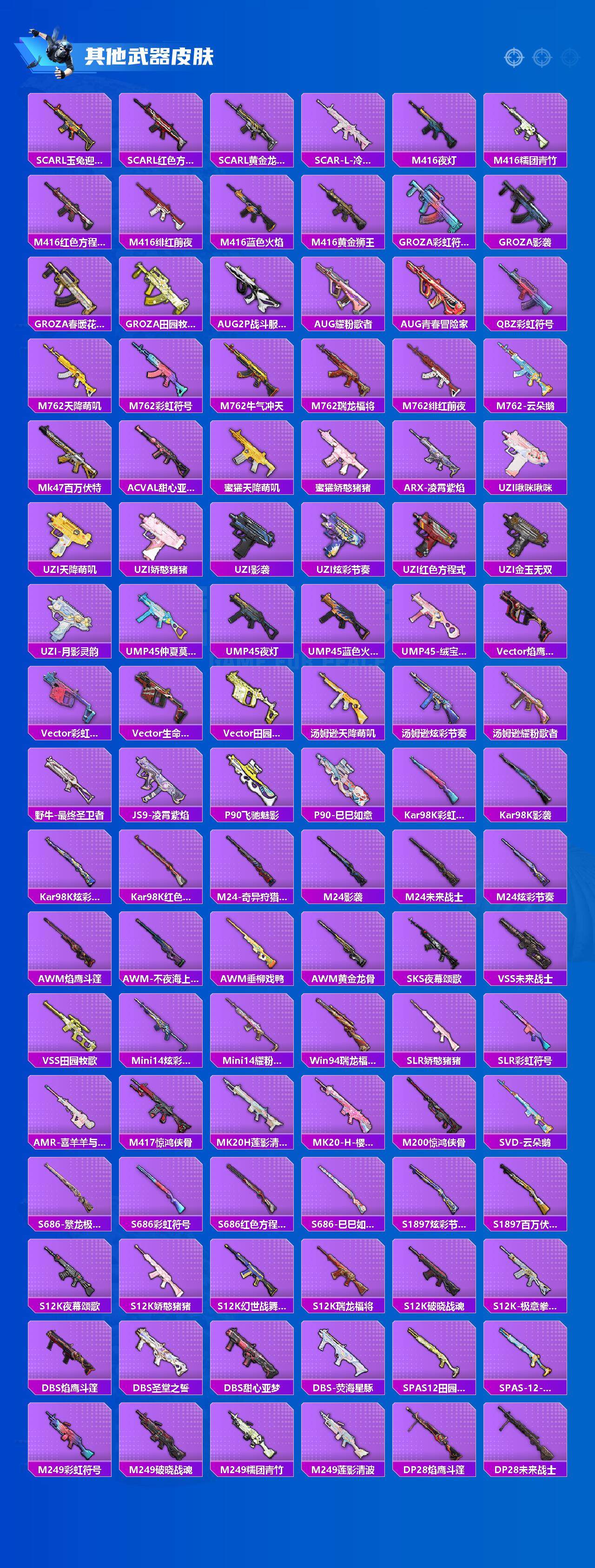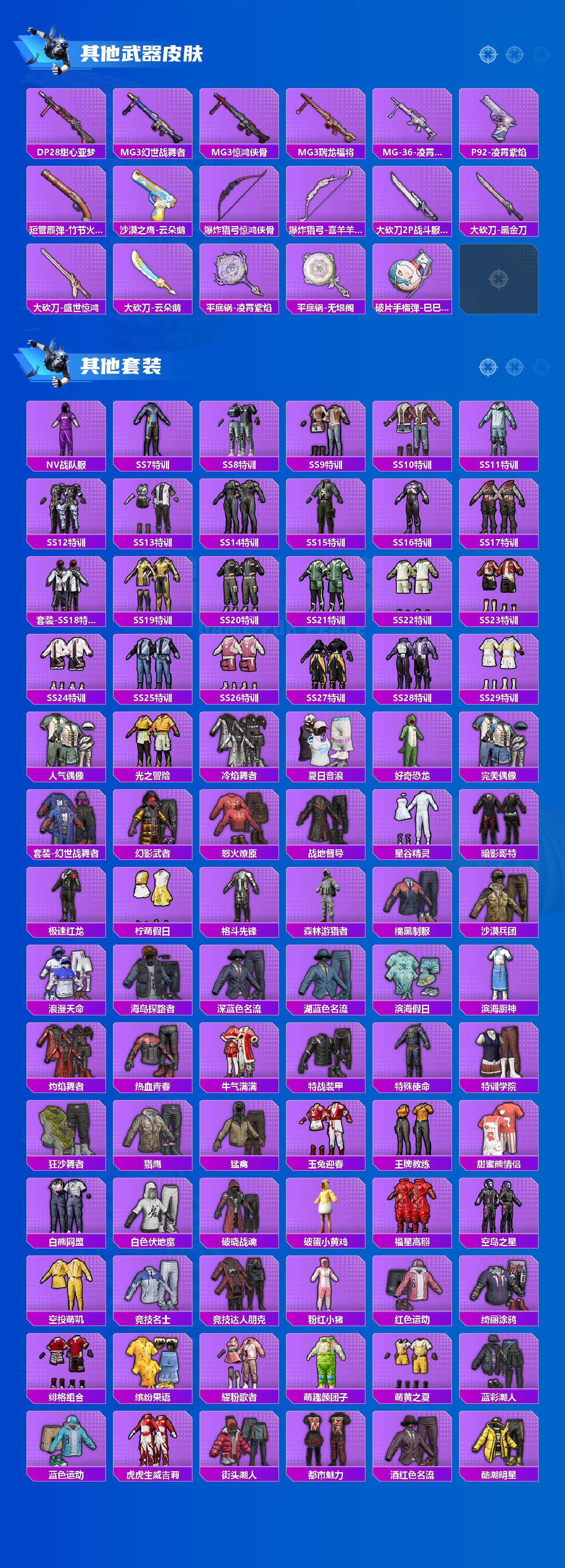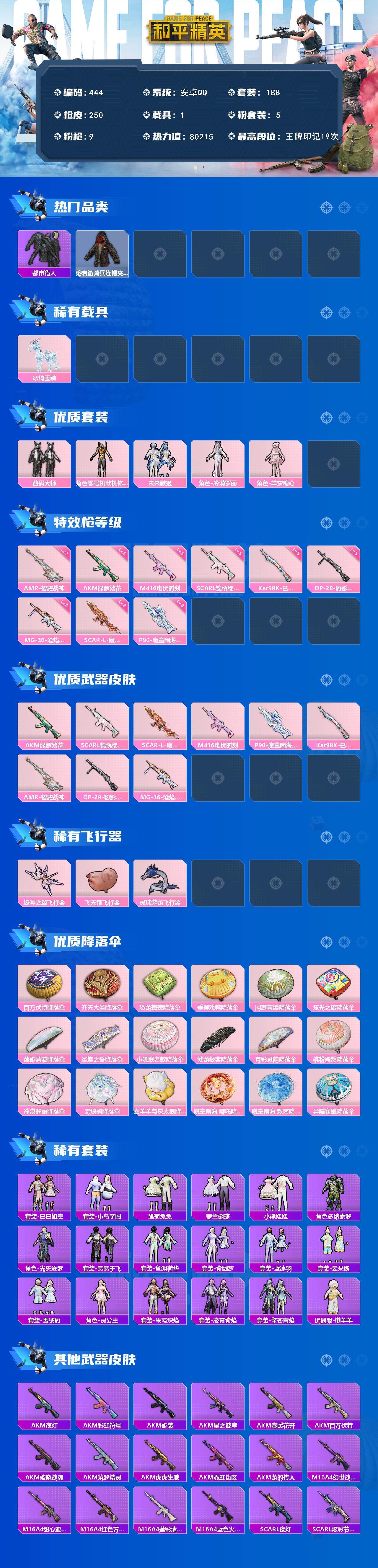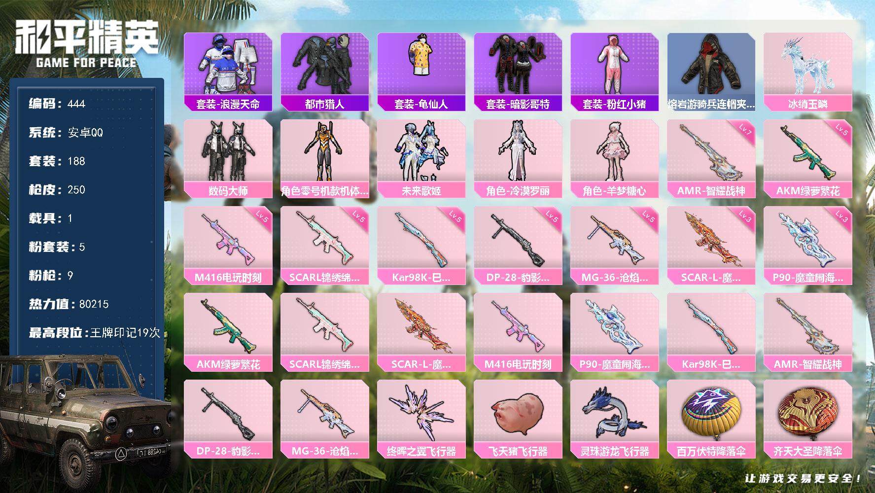 [14529252]安卓 手q-5粉装-9特效呛-1载具-4粉色飞行器-80215热力值-19王牌印记-188套装-250呛皮 【热门品类】:套装-浪漫天命,套装-都市猎人,套装-龟仙人,套装-暗影哥特,套装-粉红小猪,熔岩游骑兵连帽夹克 【粉色载具】:冰绡玉鳞 【粉色套装】:粉装-数码大师,角色-零号机款机体服,粉装-未来歌姬,角色-冷漠罗丽,角色-羊梦糖心 【粉色呛皮等级】:akm-绿萝繁花五级,scar-l-锦绣绵绵五级,scar-l-魔童闹海 哪吒三级,m416-电玩时刻五级,p90-魔童闹海 敖丙三级,kar98k-巳巳如意五级,amr-智耀战神七级,dp-28-豹影疾电五级,mg-36-沧焰双生五级 【粉色呛皮】:akm-绿萝繁花,scar-l-锦绣绵绵,scar-l-魔童闹海 哪吒,m416-电玩时刻,p90-魔童闹海 敖丙,kar98k-巳巳如意,amr-智耀战神,dp-28-豹影疾电,mg-36-沧焰双生 【粉色飞行器】:终晖之翼飞行器,飞天猪飞行器,灵珠游龙飞行器 【粉色降落伞】:百万伏特降落伞,齐天大圣降落伞,恐龙拽拽降落伞,垂柳戏鸭降落伞,闲梦青缨降落伞,炫光之旅降落伞,莲影清波降落伞,圣堂之誓降落伞,小叽联名款降落伞,繁龙极客降落伞,月影灵韵降落伞,桃粉嫣然降落伞,冷漠罗丽降落伞,无垠阁降落伞,喜羊羊与灰太狼降落伞,魔童闹海 哪吒降落伞,魔童闹海 敖丙降落伞,异瞳寒姬降落伞 【稀有套装】:套装-龟仙人,套装-巳巳如意,套装-小鸟芋圆,套装-雏菊兔兔,套装-萝兰蝴蝶,套装-小熊娃娃,角色-多纳泰罗,角色-光矢逐梦,套装-燕燕于飞,套装-鱼渊荷华,套装-紫幽梦,套装-蓝冰羽,套装-云朵鹅,套装-雪绒豹,角色-灵公主,套装-朱霞炽焰,套装-凌霄紫焰,套装-擎苍青焰,玩偶服-懒羊羊 【稀有呛皮】:akm-夜灯,akm-彩虹符号,akm-影袭,akm-星之彼岸,akm-春暖花开,akm-百万伏特,akm-破晓战魂,akm-筑梦精灵,akm-虎虎生威,akm-霓虹街区,akm-龙的传人,m16a4-幻世战舞者,m16a4-甜心亚梦,m16a4-红色方程式,m16a4-莲影清波,m16a4-蓝色火焰,scar-l-夜灯,scar-l-炫彩节奏,scar-l-玉兔迎春,scar-l-红色方程式,scar-l-黄金龙骨,scar-l-冷漠罗