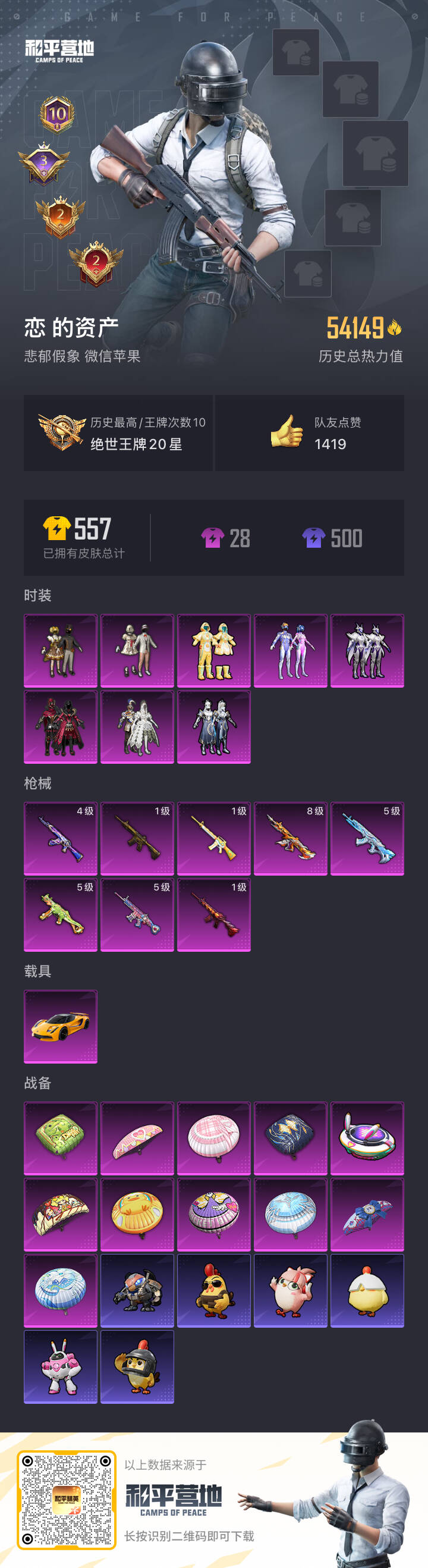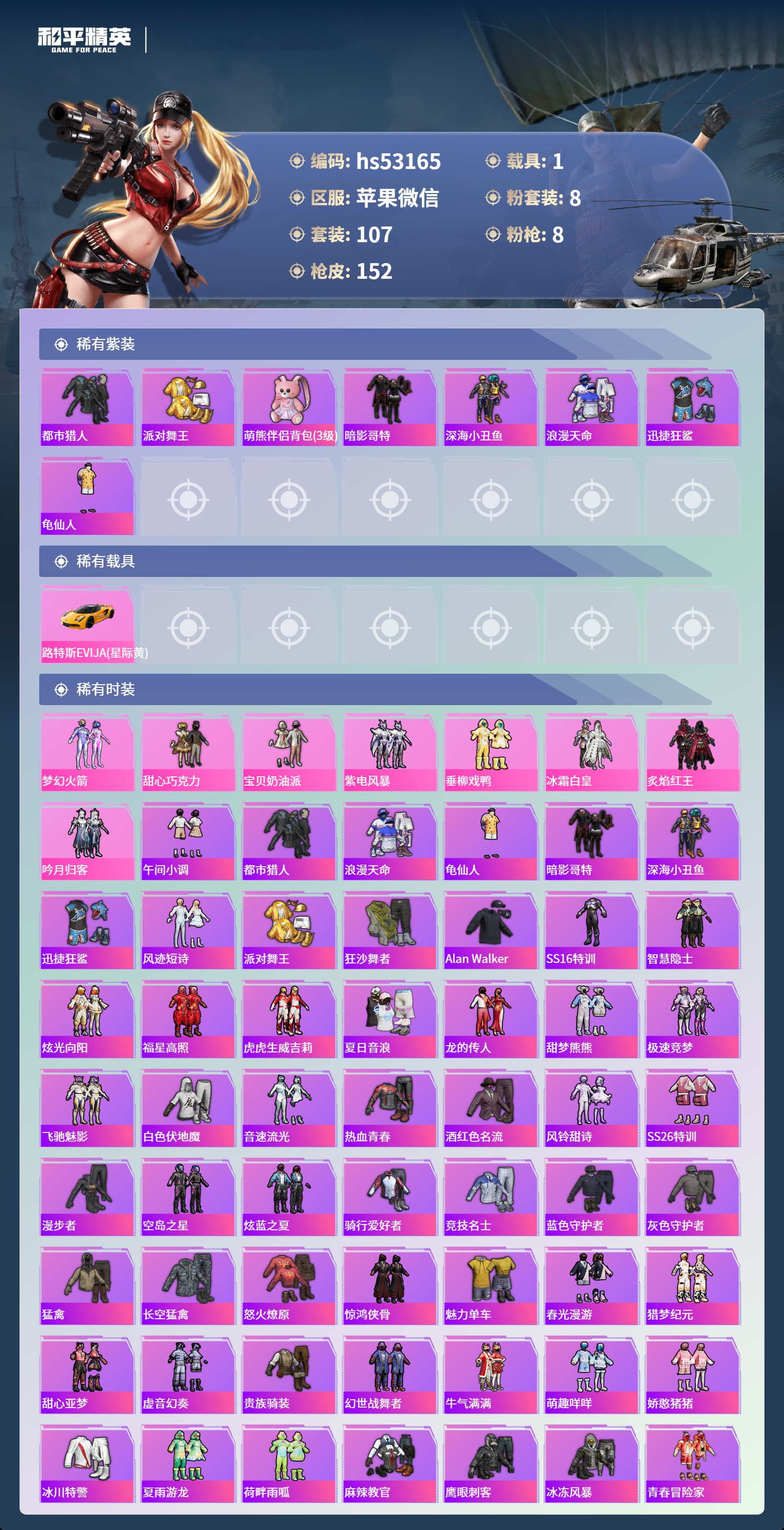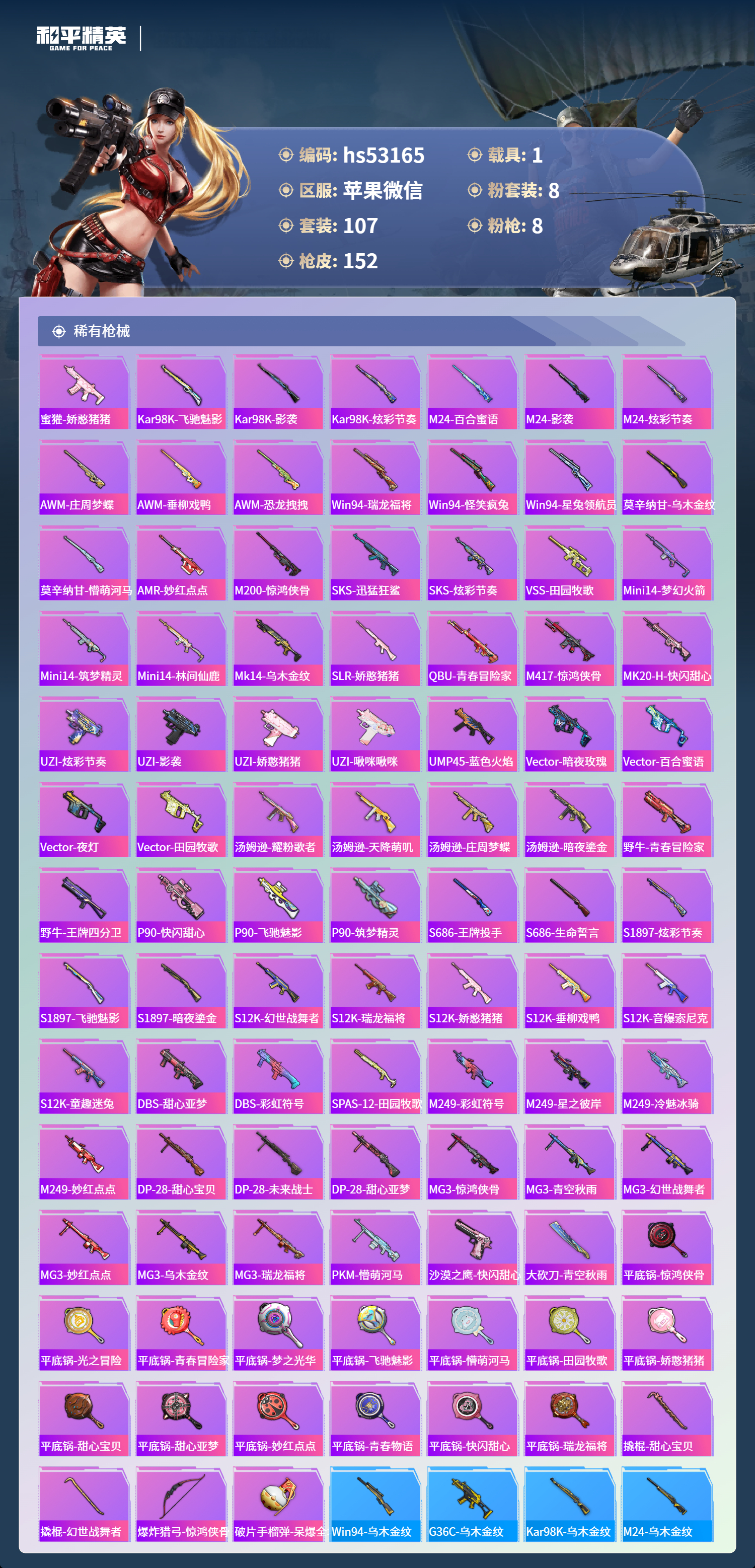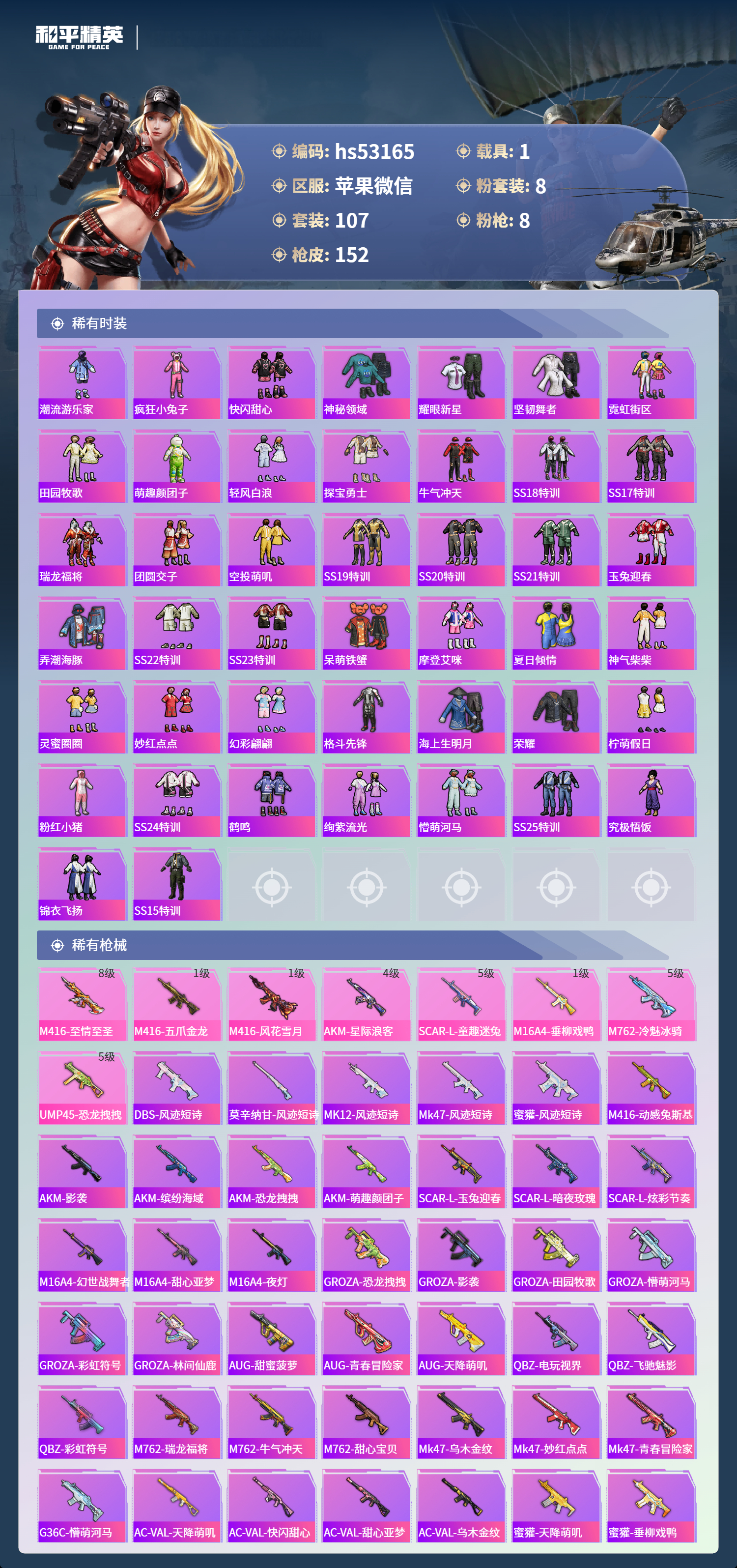 hs53165 苹果微信-10王牌印记-8粉装-8特效呛-1载具-54149热力值-107套装-152呛皮-3卓越印记-2传奇印记【8粉装】套装-垂柳戏鸭套装-紫电风暴套装-炙焰红王套装-吟月归客套装-梦幻火箭套装-甜心巧克力套装-冰霜白皇套装-宝贝奶油派【8特效呛】akm-星际浪客/4级ump45-恐龙拽拽/5级m416-五爪金龙/1级m416-风花雪月/1级m762-
