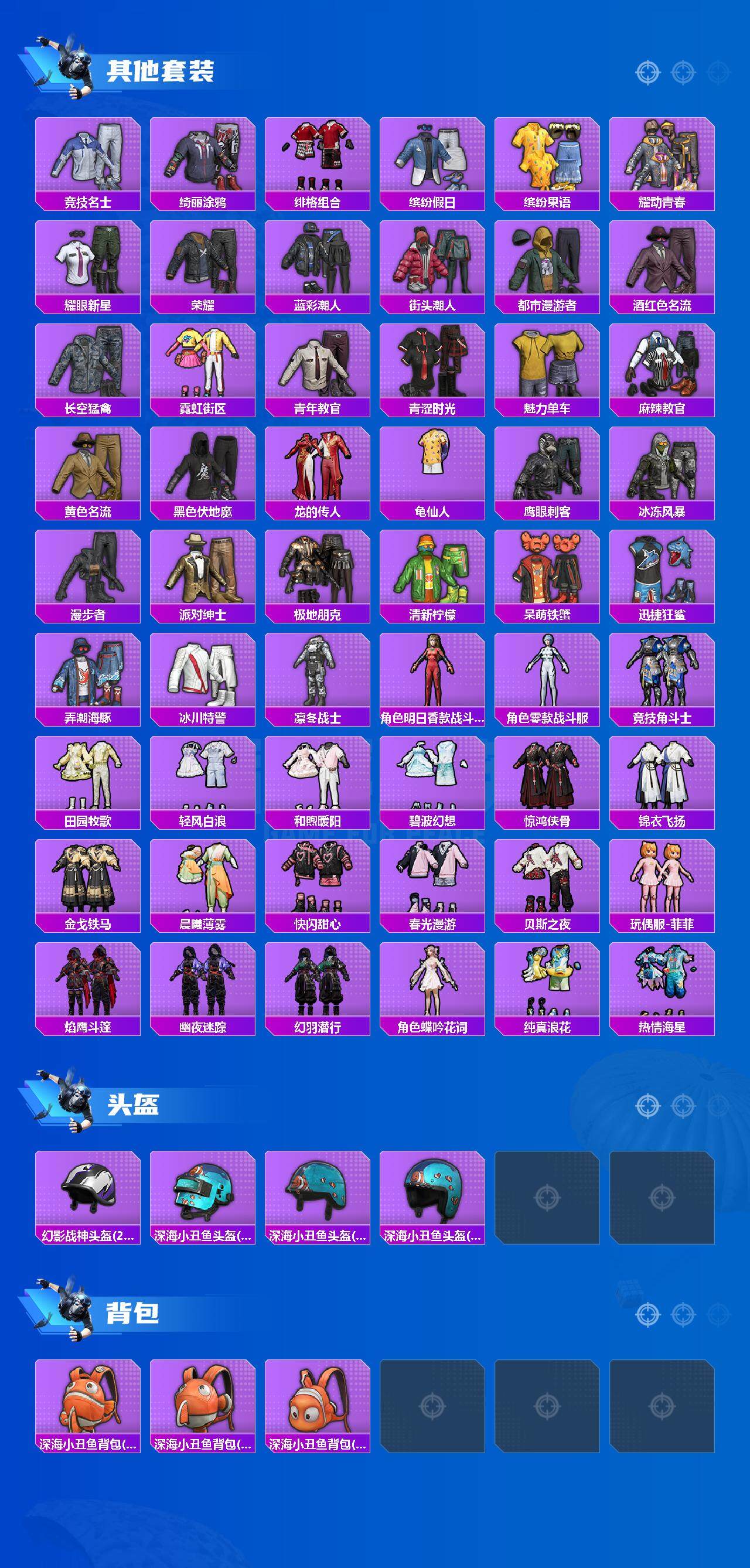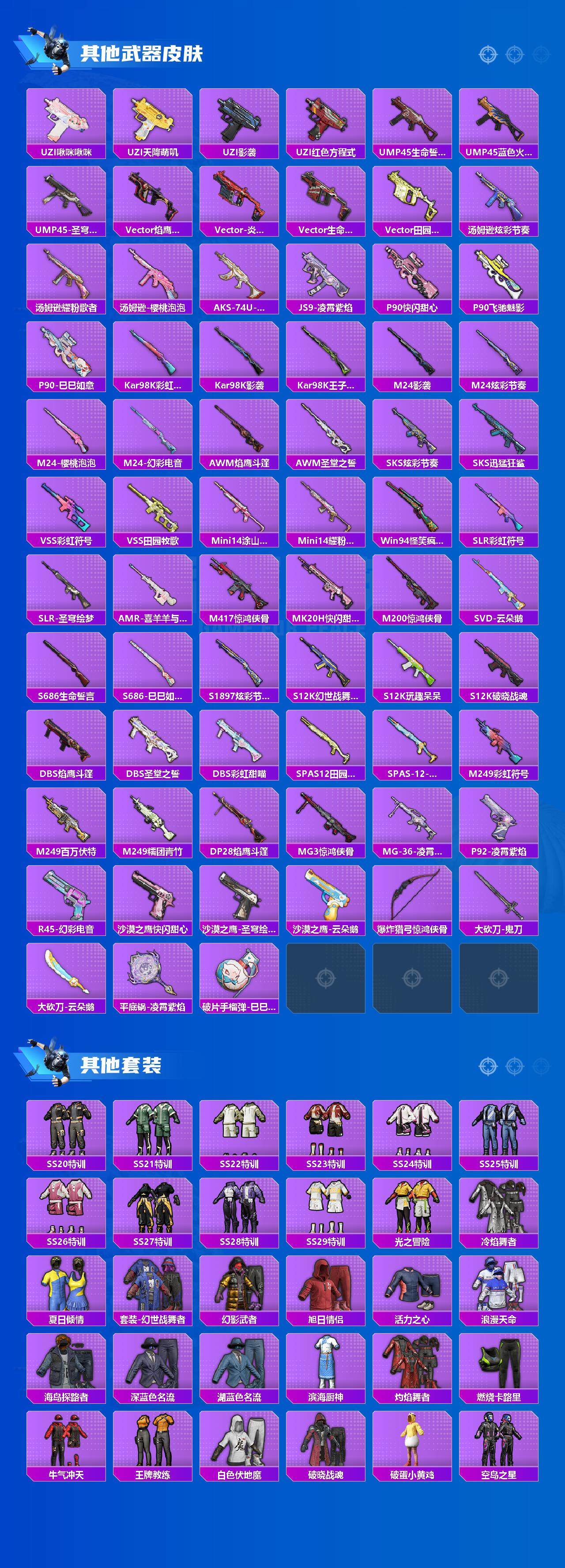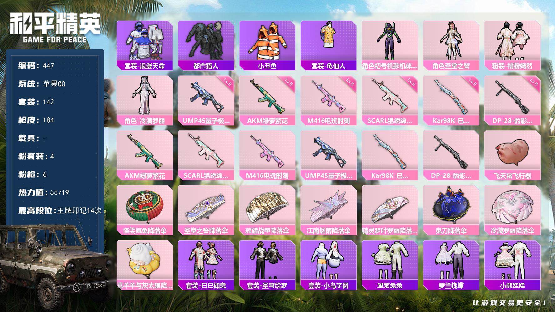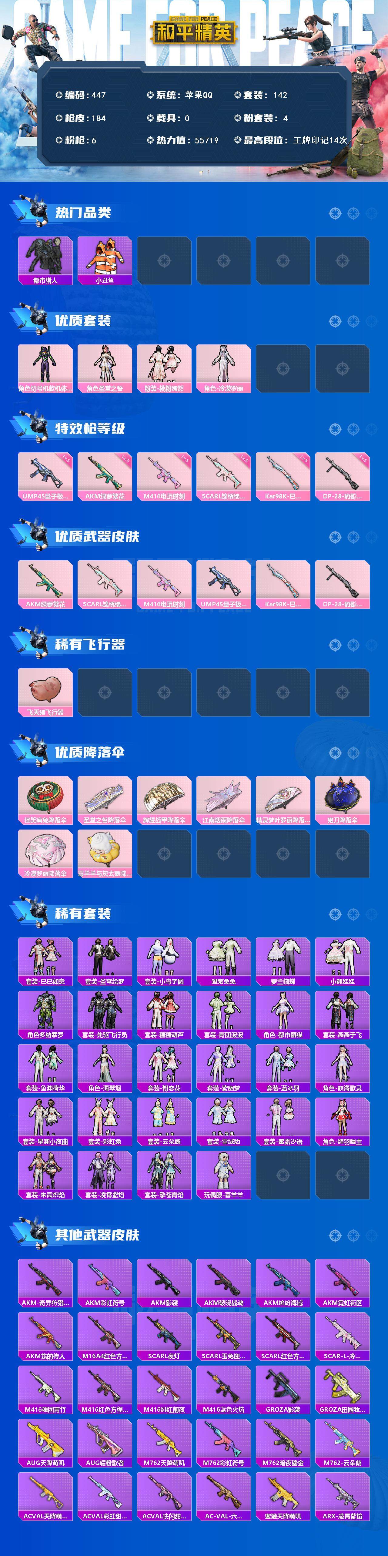 [14529338]苹果 手q-4粉装-6特效呛-0载具-2粉色飞行器-55719热力值-14王牌印记-142套装-184呛皮 【热门品类】:套装-浪漫天命,套装-都市猎人,套装-小丑鱼,套装-龟仙人 【粉色套装】:角色-初号机款机体服,角色-圣堂之誓,粉装-桃粉嫣然,角色-冷漠罗丽 【粉色呛皮等级】:akm-绿萝繁花五级,scar-l-锦绣绵绵五级,m416-电玩时刻五级,ump45-量子极限五级,kar98k-巳巳如意五级,dp-28-豹影疾电五级 【粉色呛皮】:akm-绿萝繁花,scar-l-锦绣绵绵,m416-电玩时刻,ump45-量子极限,kar98k-巳巳如意,dp-28-豹影疾电 【粉色飞行器】:飞天猪飞行器 【粉色降落伞】:怪笑疯兔降落伞,圣堂之誓降落伞,辉耀战甲降落伞,江南烟雨降落伞,精灵梦叶罗丽降落伞,鬼刀降落伞,冷漠罗丽降落伞,喜羊羊与灰太狼降落伞 【稀有套装】:套装-龟仙人,套装-巳巳如意,套装-圣穹绘梦,套装-小鸟芋圆,套装-雏菊兔兔,套装-萝兰蝴蝶,套装-小熊娃娃,角色-多纳泰罗,套装-先驱飞行员,套装-糖糖葫芦,套装-青团波波,角色-都市丽猫,套装-燕燕于飞,套装-鱼渊荷华,角色-海琴烟,套装-粉恋花,套装-紫幽梦,套装-蓝冰羽,角色-鲛海歌灵,套装-星渊小夜曲,套装-彩虹兔,套装-云朵鹅,套装-雪绒豹,套装-蜜露汐语,角色-绛羽幽主,套装-朱霞炽焰,套装-凌霄紫焰,套装-擎苍青焰,玩偶服-喜羊羊 【稀有呛皮】:akm-奇异狩猎者,akm-彩虹符号,akm-影袭,akm-破晓战魂,akm-缤纷海域,akm-霓虹街区,akm-龙的传人,m16a4-红色方程式,scar-l-夜灯,scar-l-玉兔迎春,scar-l-红色方程式,scar-l-冷漠罗丽,m416-糯团青竹,m416-红色方程式,m416-绯红前夜,m416-蓝色火焰,groza-影袭,groza-田园牧歌,aug-天降萌叽,aug-耀粉歌者,m762-天降萌叽,m762-彩虹符号,m762-暗夜鎏金,m762-云朵鹅,ac-val-天降萌叽,ac-val-彩虹甜喵,ac-val-快闪甜心,ac-val-六号稻草人,蜜獾-天降萌叽,arx-凌霄紫焰,uzi-啾咪啾咪,uzi-天降萌叽,uzi-影袭,uzi-红色方程式,ump45-生命誓言,ump45-蓝色火焰,ump4