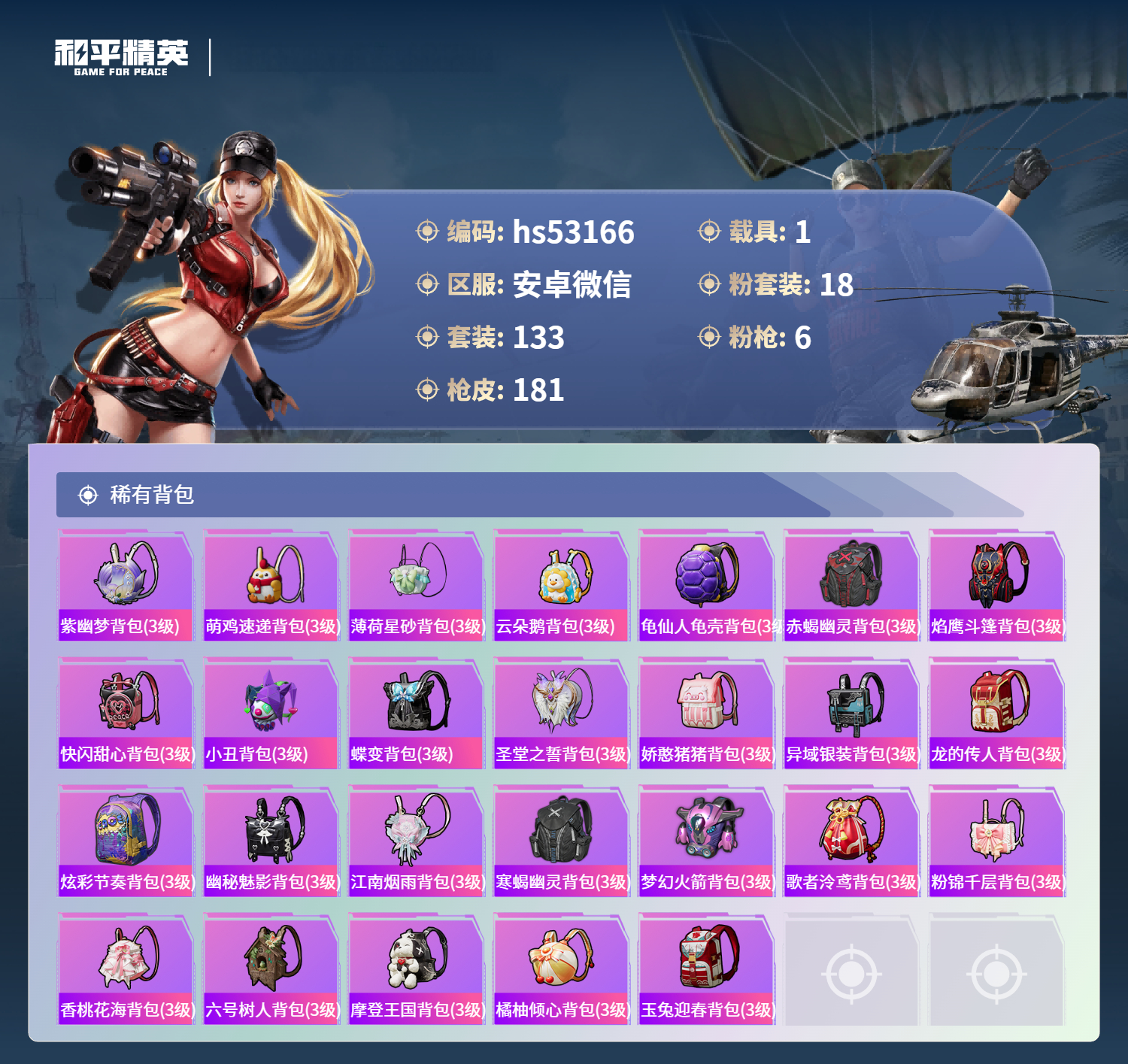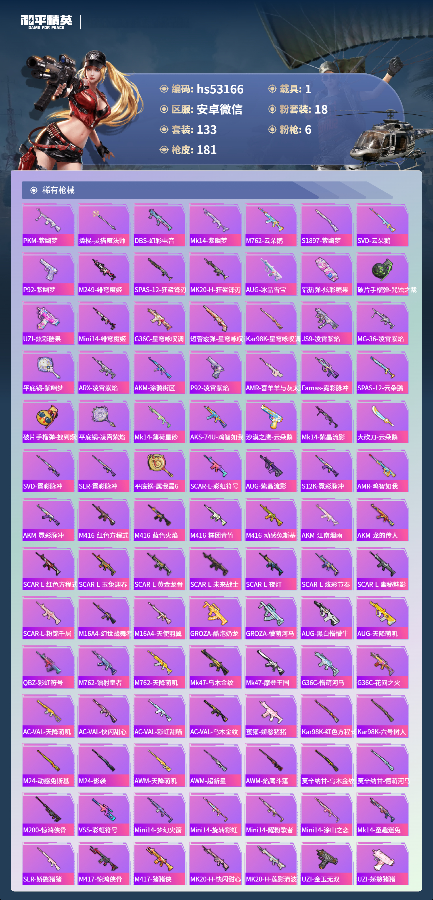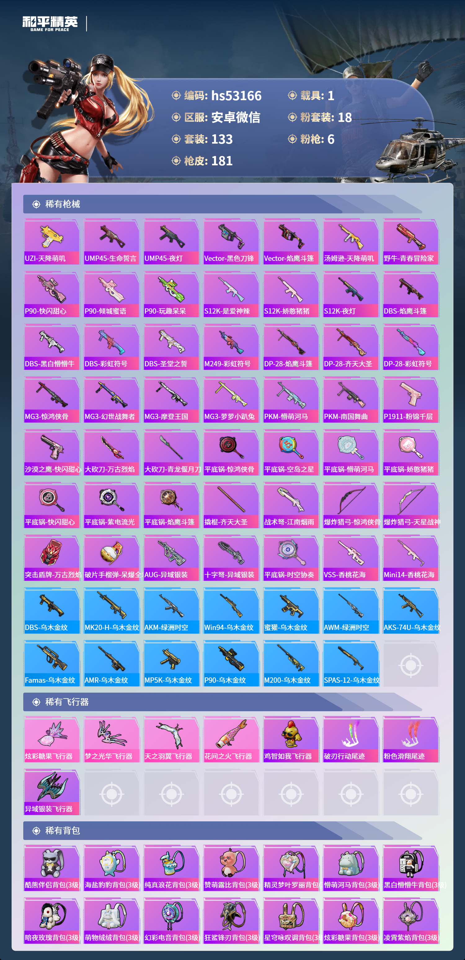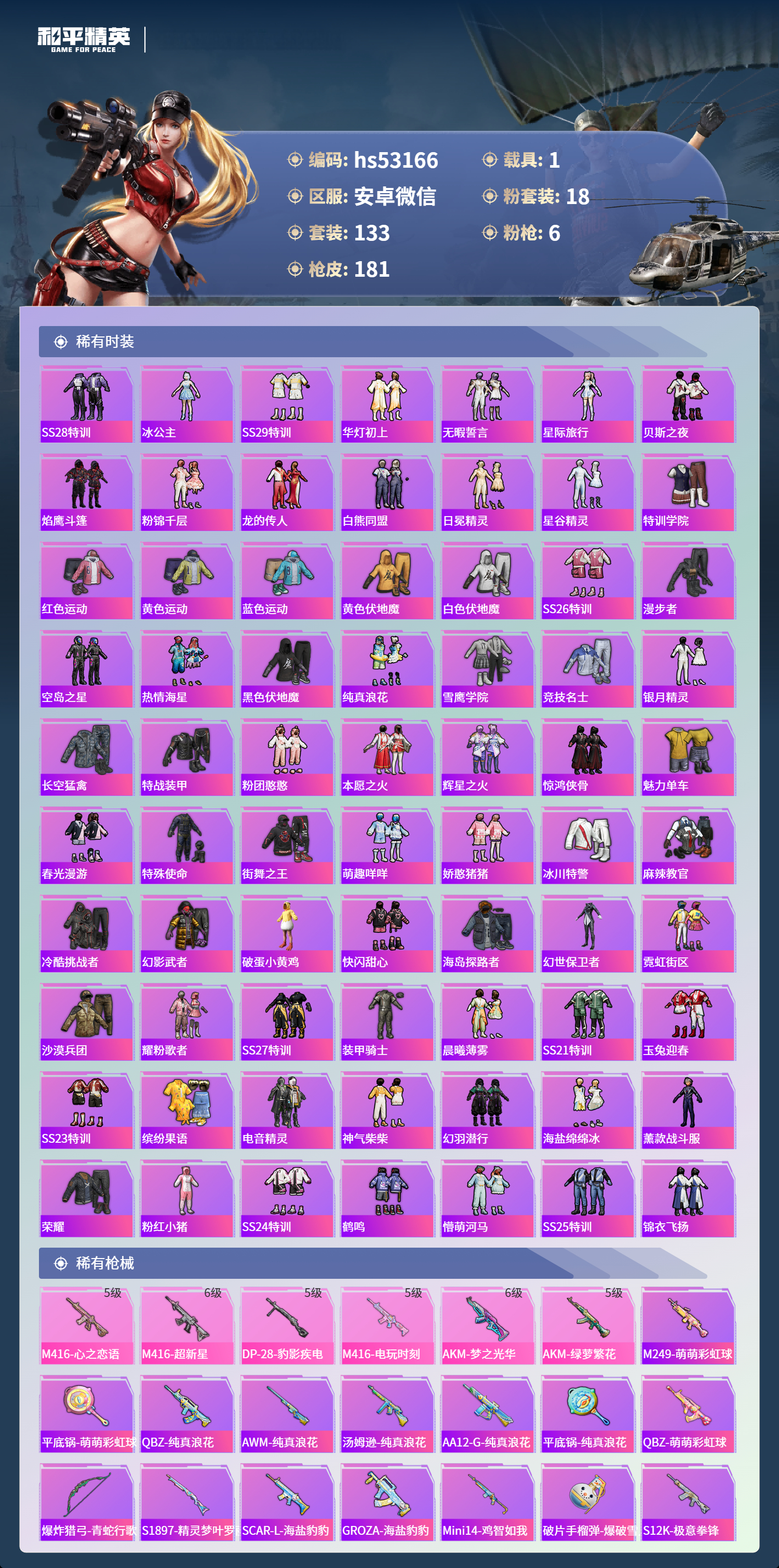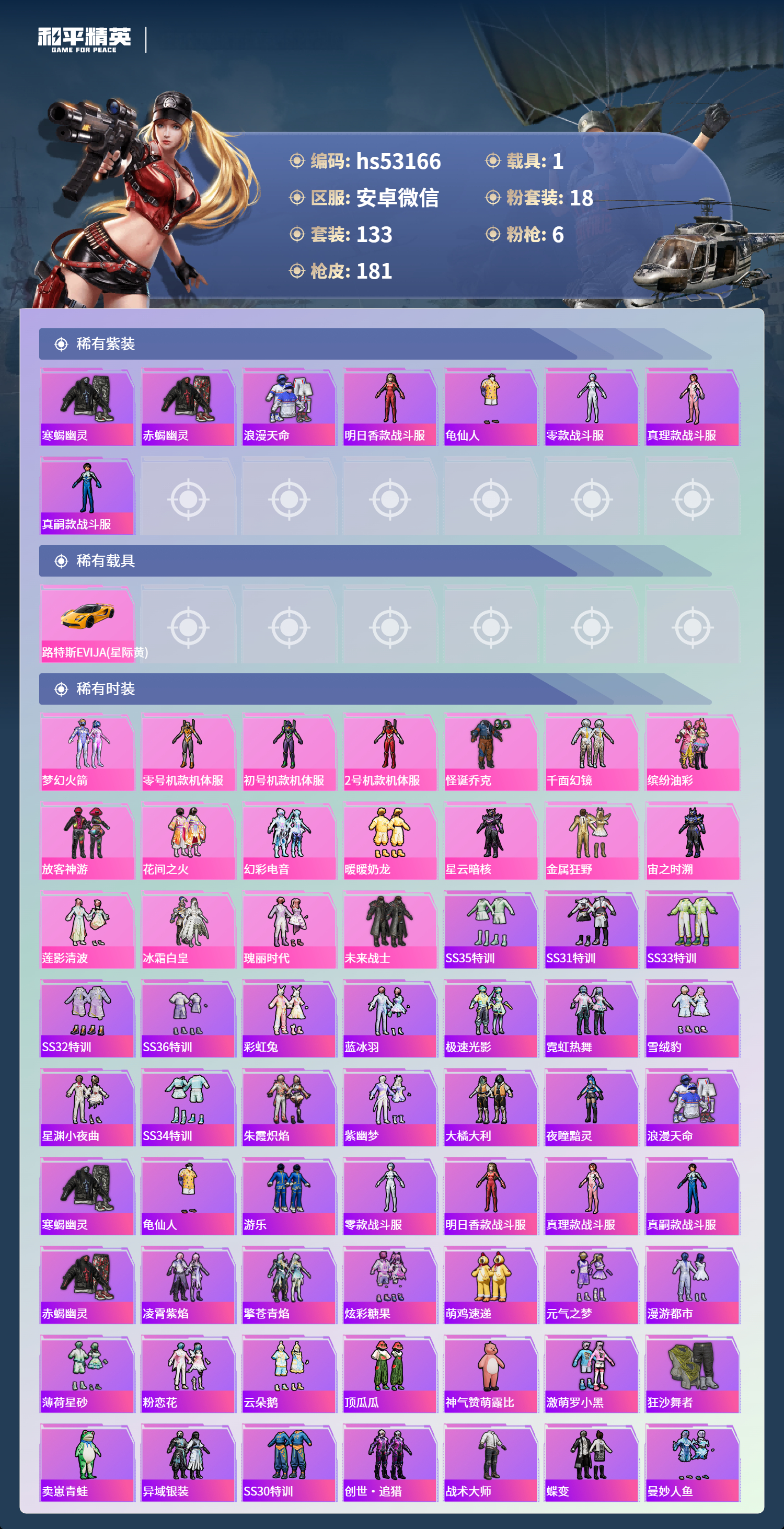 hs53166 安卓微信-10王牌印记-18粉装-6特效呛-1载具-62261热力值-133套装-181呛皮-3卓越印记-2传奇印记【18粉装】套装-暖暖奶龙角色-宙之时溯套装-幻彩电音套装-瑰丽时代角色-零号机款机体服套装-缤纷油彩角色-初号机款机体服套装-怪诞乔克套装-莲影清波套装-放客神游套装-梦幻火箭套装-未来战士套装-金属狂野套装-花间之火角色-2号机款机体