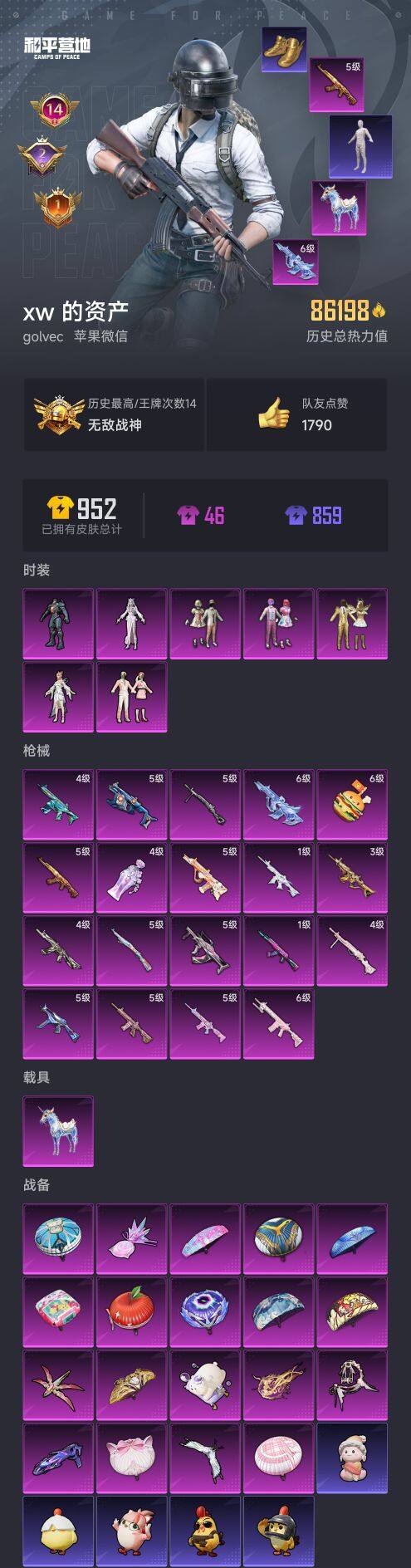 苹果 微信【无敌战神框 木乃伊金靴子 星际漫游m416五级甜心宝贝akm六级星梦奇缘aug】无敌战神框-7粉装-19特效呛-1载具-7粉色飞行器-86198热力值-14王牌印记-191套装-258呛皮 【热门品类】:套装-浪漫天命,套装-冥河战士,套装-派对舞王,套装-奇异狩猎者,角色-军刀雅典娜,套装-龟仙人,套装-暗影哥特,角色-8号机,角色-mark.06,m416-星际漫游 【粉色载具
