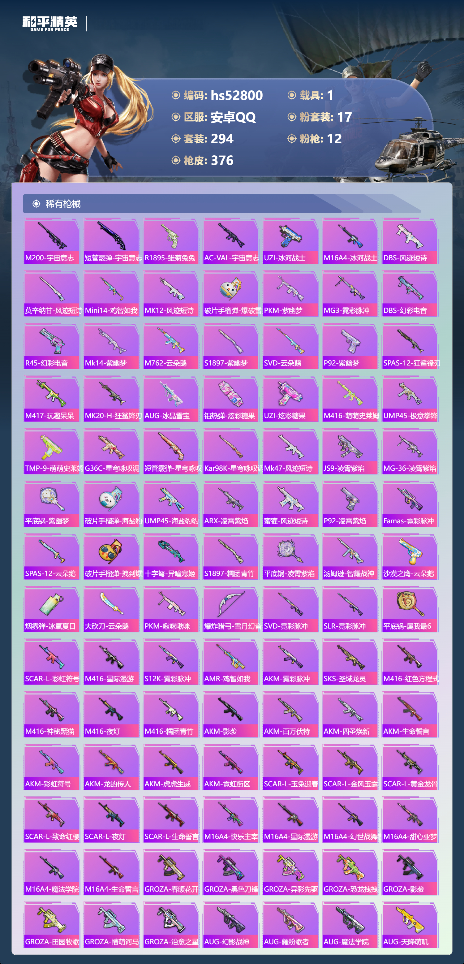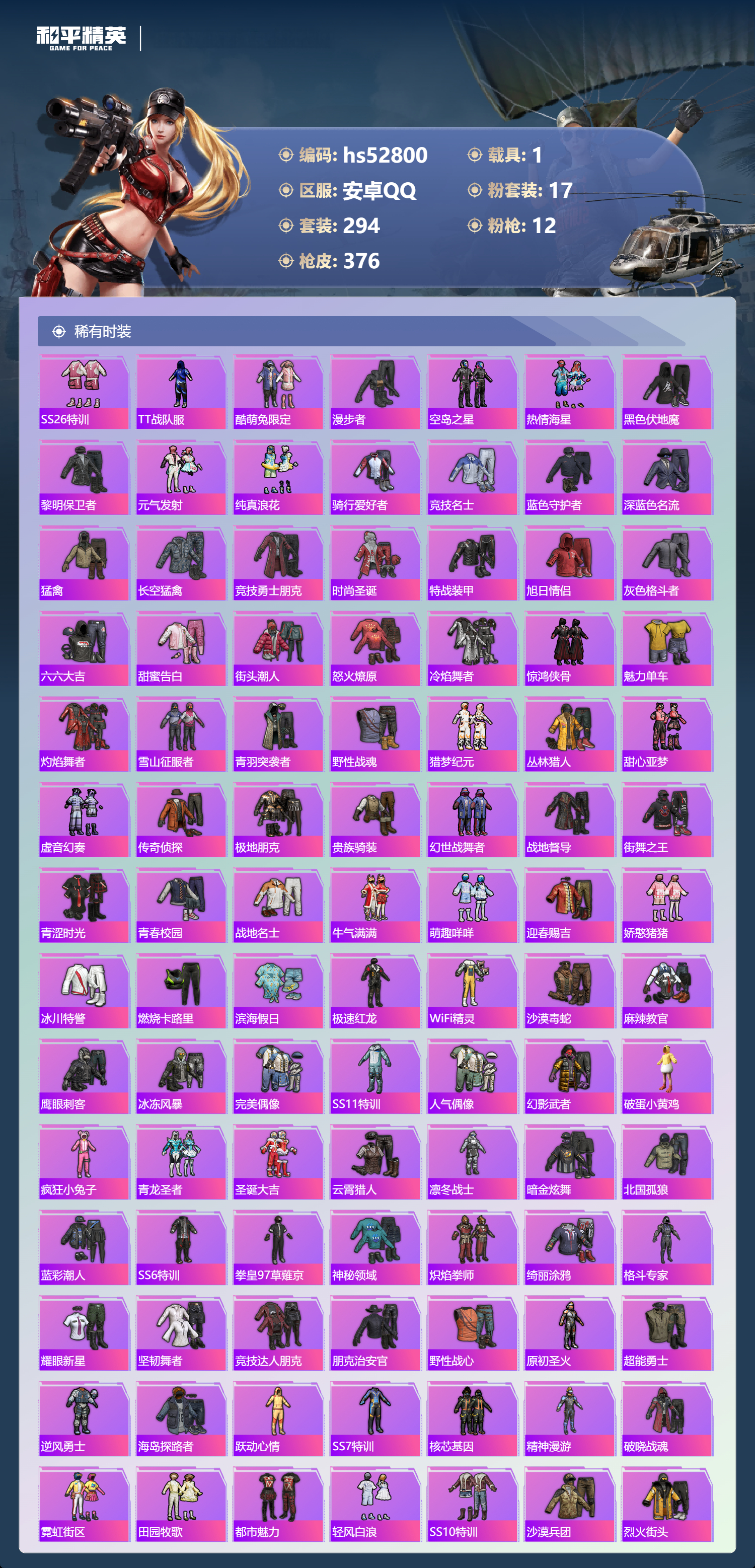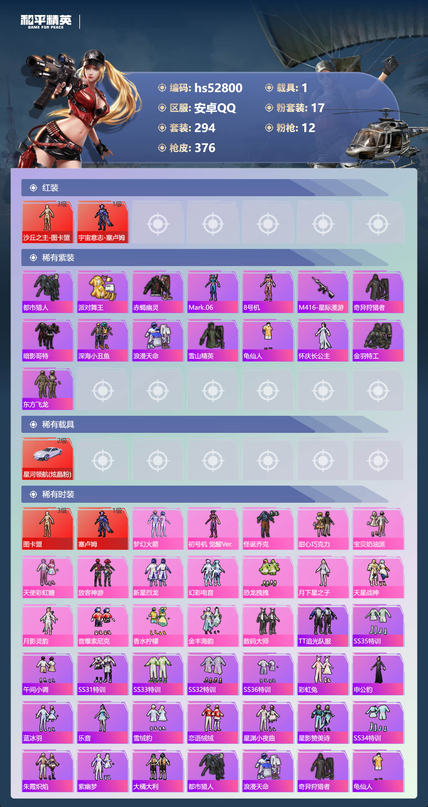 hs52800 安卓手q-17王牌印记-2红装-17粉装-12特效呛-1载具-热力值-294套装-376呛皮-2卓越印记-2传奇印记【2红装】沙丘之主-图卡盟/3级宇宙意志-塞卢姆/1级【17粉装】套装-恐龙拽拽套装-香水柠檬套装-数码大师角色-月影灵韵套装-放客神游角色-初号机 觉醒ver.角色-月下星之子套装-天星战神套装-幻彩电音套装-梦幻火箭套装-音爆