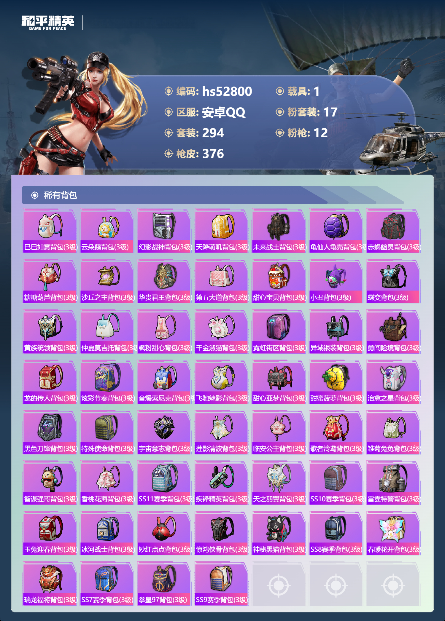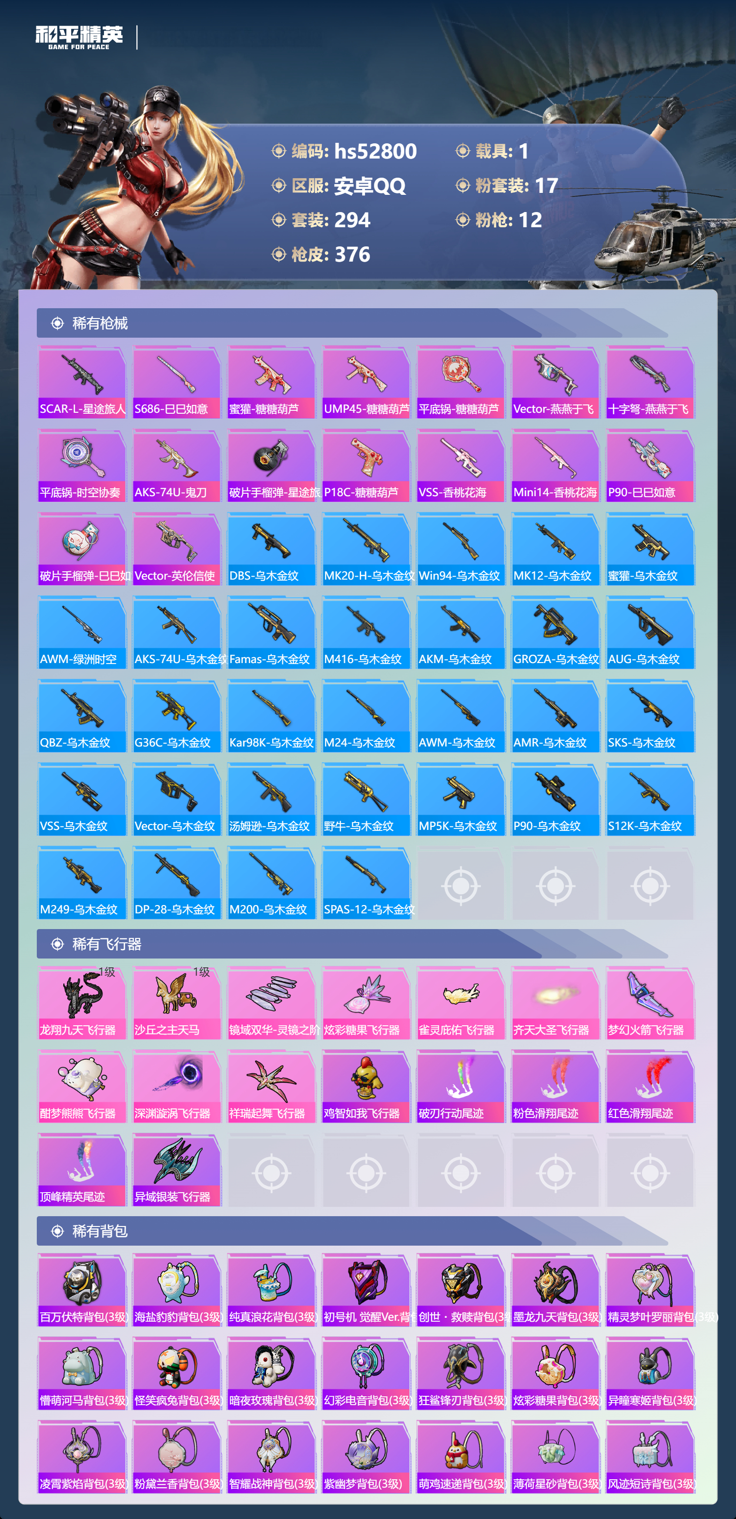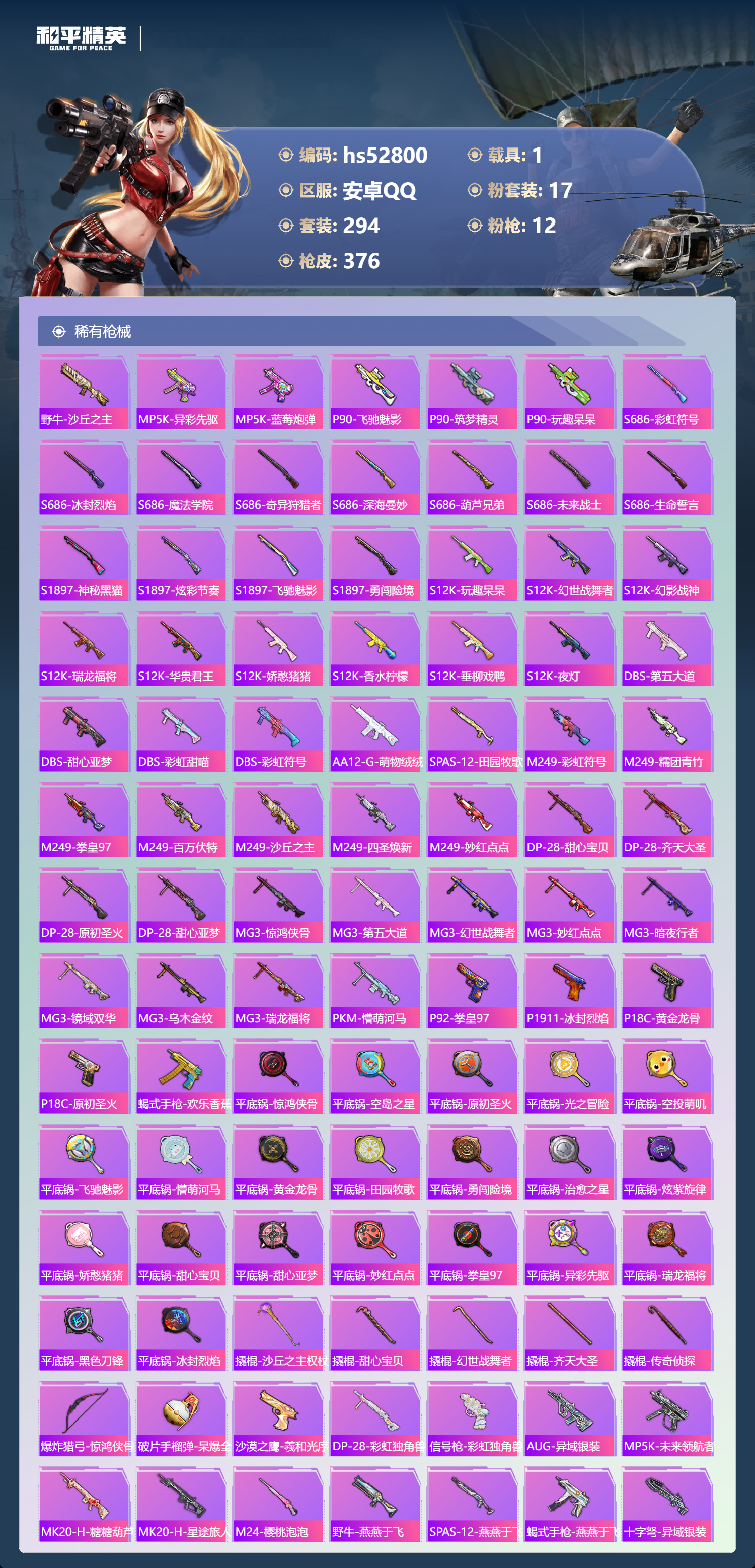 hs52800 安卓手q-17王牌印记-2红装-17粉装-12特效呛-1载具-热力值-294套装-376呛皮-2卓越印记-2传奇印记【2红装】沙丘之主-图卡盟/3级宇宙意志-塞卢姆/1级【17粉装】套装-恐龙拽拽套装-香水柠檬套装-数码大师角色-月影灵韵套装-放客神游角色-初号机 觉醒ver.角色-月下星之子套装-天星战神套装-幻彩电音套装-梦幻火箭套装-音爆
