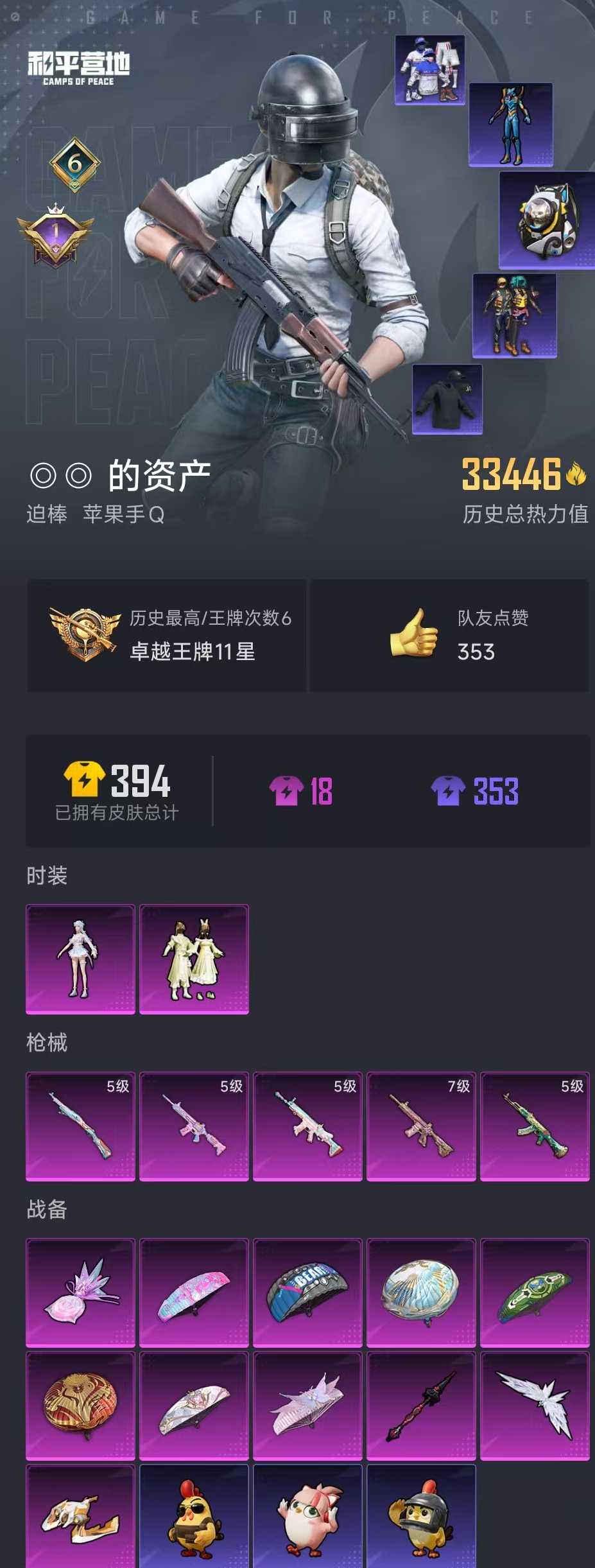 【和平精英】【lyhp17419】双字id 2粉装5特效呛 蓝螳螂 浪漫天命 小丑鱼 艾伦沃克 猫包 满级心之恋语m4 满级绿萝ak 满级锦绣死噶 2粉装,5特效呛,0载具,历史最高段位:卓越王牌11星 王牌印记6次 热力值:33501,78套装,111呛械,133装备,59战备;套装:套装-闲梦青缨,角色-荧海星豚,套装-红色运动,套装-黄色运动,套装-蓝色运动,套装-白色伏地魔,套装-黑色伏地魔,套装-竞技名士,套装-深蓝色名流,套装-猛禽,套装-长空猛禽,套装-雨林探路者,套装-冷焰舞者,套装-浪漫天命,套装-青春校园,套装-活力之心,套装-冰冻风暴,套装-魅力单车,套装-森林游猎者,套装-都市魅力,套装-甜蜜菠萝,套装-清新柠檬,套装-深海小丑鱼,套装-缤纷果语,套装-alan walker,套装-龙魂突击队,套装-冰川特警,套装-霓虹街区,套装-白熊同盟,套装-战术大师,套装-曼妙人鱼,套装-热情海星,套装-纯真浪花,套装-光之冒险,套装-ss23特训,套装-王牌教练,套装-柠萌假日,套装-ss24特训,套装-日照花林,套装-龟仙人,套装-ss25特训,套装-惊鸿侠骨,套装-锦衣飞扬,套装-龙的传人,套装-冰河战士,套装-ss26特训,套装-快闪甜心,套装-春光漫游,套装-空岛之星,套装-童真绒兔,套装-贝斯之夜,套装-焰鹰斗篷,套装-幽夜迷踪,套装-幻羽潜行,套装-ss27特训,套装-老实芭蕉,套装-ss28特训,玩偶服-卖崽青蛙,角色-情公主,角色-mark.06,套装-海盐绵绵冰,套装-蝶变,套装-创世·幻影,套装-ss29特训,套装-雏菊兔兔,套装-萝兰蝴蝶,角色-绯色魅影,套装-星途旅人,角色-许七安,套装-ss30特训,套装-ss31特训,套装-智谋强哥,套装-ss33特训,套装-巳巳如意,套装-炫彩糖果,套装-ss34特训,套装-ss35特训,套装-ss36特训;呛皮:7级m416-心之恋语,5级m416-电玩时刻,m416-蓝色火焰,m416-糯团青竹,蜜獾-天降萌叽,5级akm-绿萝繁花,akm-破晓战魂,akm-霓虹街区,akm-涂鸦街区,akm-彩虹符号,akm-龙的传人,akm-江南烟雨,groza-影袭,groza-绯红回忆,groza-海盐豹豹,aug-耀粉歌者,aug-冰晶雪宝,g36c-六号树人,m762-奇异狩猎者,m762-天降萌叽,m762-雏菊兔兔,ac-val-乌木金纹,ac-val-快闪甜心,famas-镜域双华,famas-乌木金纹,mk47-炫光之旅,mk47-极冰使者,q-未来歌姬,q-纯真浪花,5级scar-l-锦绣绵绵,scar-l-星途旅人,scar-l-海盐豹豹,m16a4-冰河战士,m16a4-千金淑猫,m200-惊鸿侠骨,m200-乌木金纹,win94-乌木金纹,awm-焰鹰斗篷,awm-纯真浪花,5级kar98k-巳巳如意,kar98k-彩虹符号,amr-乌木金纹,莫辛纳甘-乌木金纹,sks-迅猛狂鲨,sks-糯团青竹,mk14-冰河战士,mini14-雏菊兔兔,mk20-h-莲影清波,mk20-h-快闪甜心,mk20-h-星途旅人,mk20-h-狂鲨锋刃,mk20-h-乌木金纹,slr-彩虹符号,slr-守护天翼,slr-极冰使者,slr-霓彩脉冲,vss-彩虹符号,m417-惊鸿侠骨,vect-生命誓言,vect-金玉无双,vect-焰鹰斗篷,汤姆逊-炫彩节奏,汤姆逊-天降萌叽,汤姆逊-纯真浪花,p90-快闪甜心,p90-玩趣呆呆,p90-巳巳如意,p90-乌木金纹,aks-74u-乌木金纹,uzi-红色方程式,uzi-影袭,uzi-天降萌叽,uzi-冰河战士,uzi-啾咪啾咪,uzi-炫彩糖果,ump45-生命誓言,mp5k-乌木金纹,野牛-雏菊兔兔,dbs-歌者泠鸢,dbs-焰鹰斗篷,dbs-乌木金纹,s12k-玩趣呆呆,s686-未来战士,s686-生命誓言,spas-12-乌木金纹,aa12-g-纯真浪花,s1897-精灵梦叶罗丽,dp-28-焰鹰斗篷,m249-彩虹符号,mg3-幻世战舞者,mg3-乌木金纹,mg3-惊鸿侠骨,r1895-雏菊兔兔,p1911-粉锦千层,p1911-创世·救赎,沙墨之鹦-快闪甜心,平底锅-惊鸿侠骨,平底锅-快闪甜心,平底锅-空岛之星,平底锅-绝色倾城,平底锅-花傲天,平底锅-焰鹰斗篷,平底锅-精灵梦叶罗丽,平底锅-纯真浪花,平底锅-雏菊兔兔,撬棍-齐天大圣,撬棍-朗基努斯之呛,铝热弹-炫彩糖果,破片手留单-呆爆全场,突击盾牌-初号机 觉醒ver.,爆炸猎弓-惊鸿侠骨;降落伞:拂晓神骑飞行器,镜光幻境飞行翼,夜幕颂歌飞行器,炫彩糖果飞行器; 详情看图