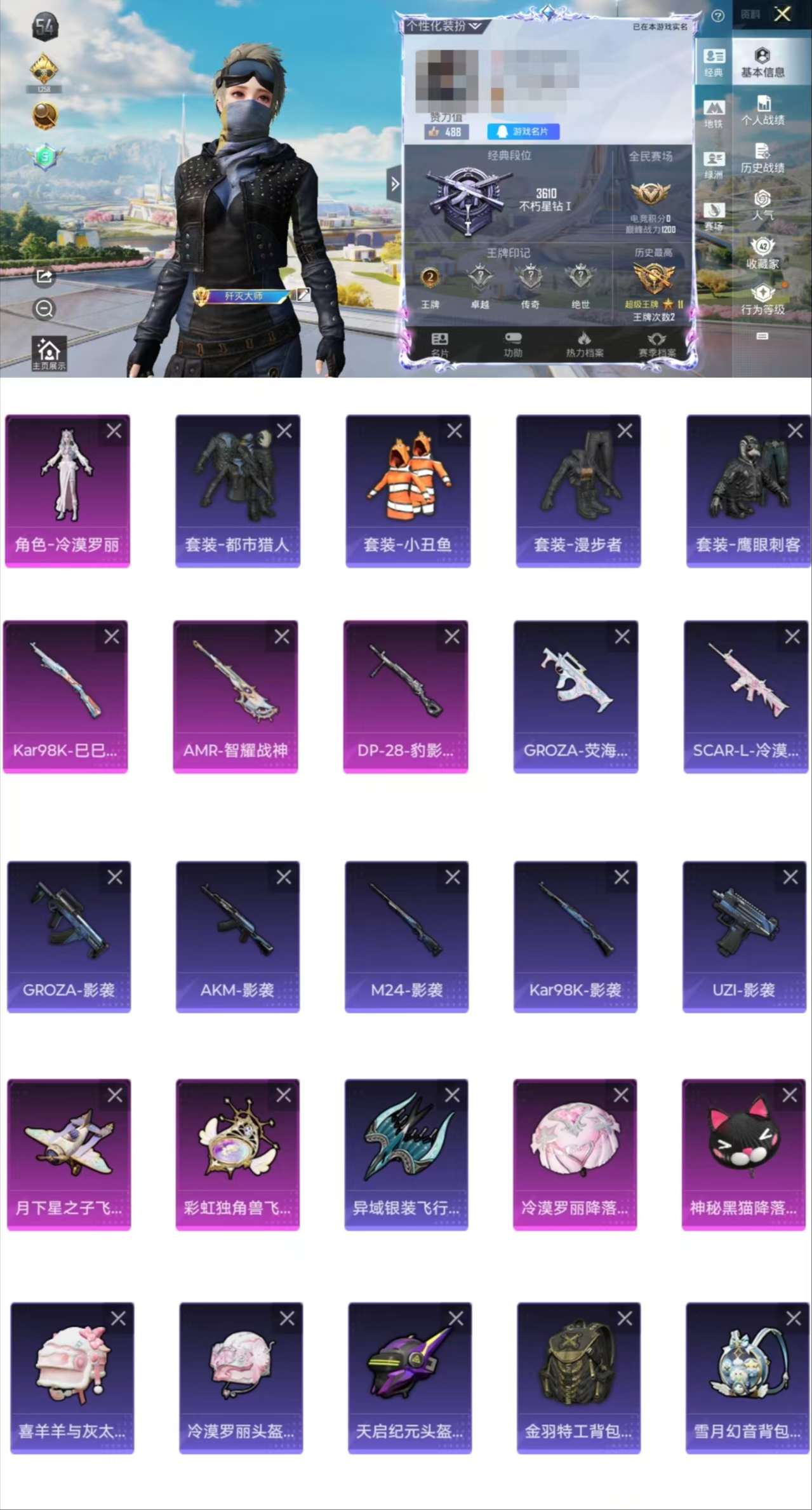 0载具-73套装-134呛皮-ch85【全套都市猎人1粉装3满级特效呛3飞行器 小丑鱼 地铁天赋已开】安卓q区-可二次-1粉装-3特效呛-32730热力值-2王牌印记-73套装-133呛皮【优质套装】: 冷漠萝莉【特效呛等级】:amr-智耀之神七级-amr-智耀之神kar98k-巳巳如意五级kar98k-巳巳如意【优质武器皮肤】: kar98k-巳巳如意【稀有武器皮肤】: kar98k-巳巳如意