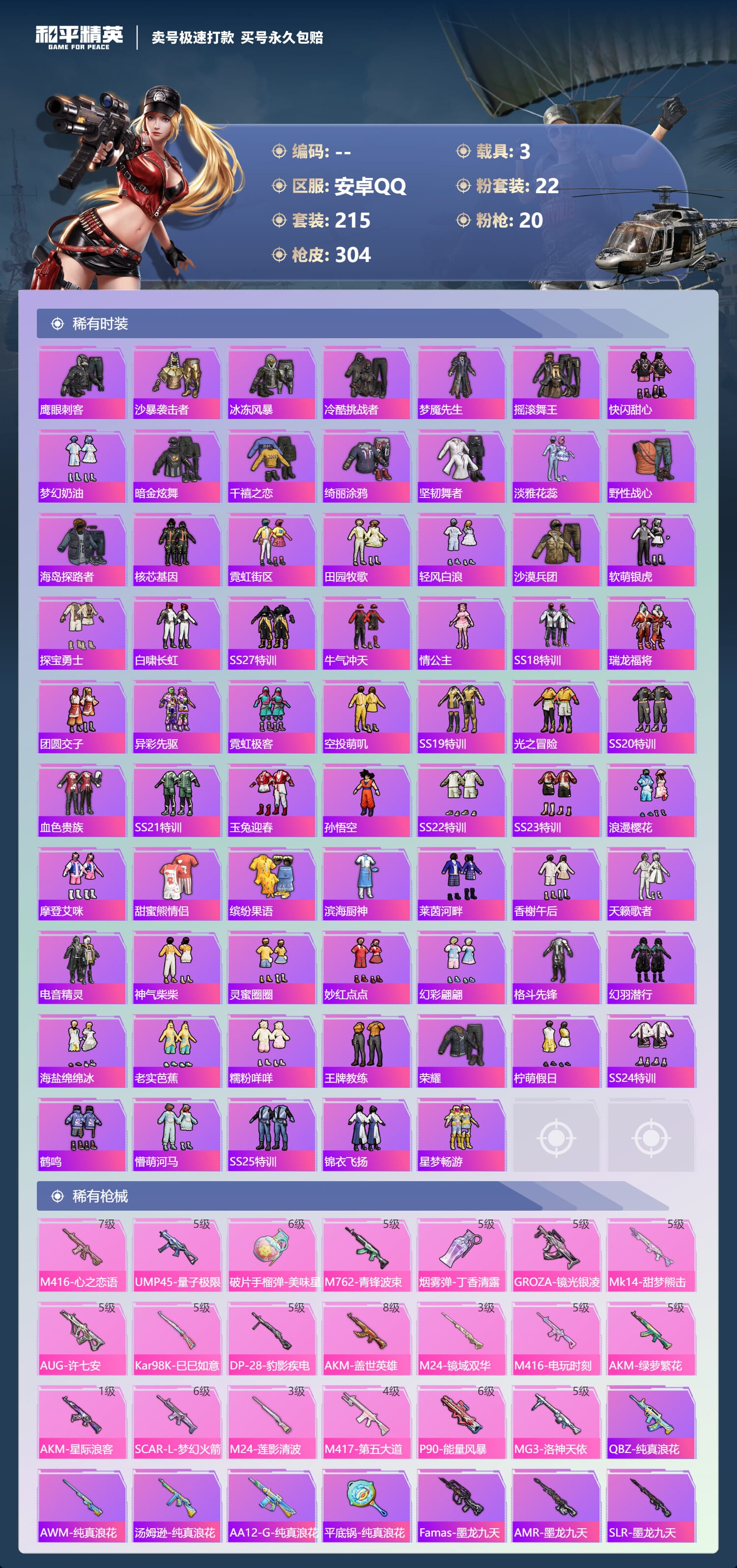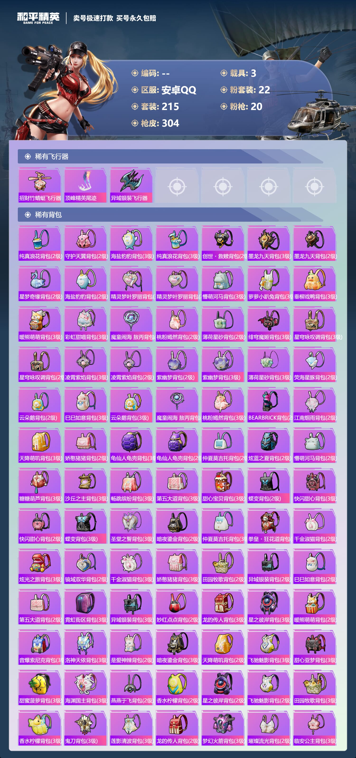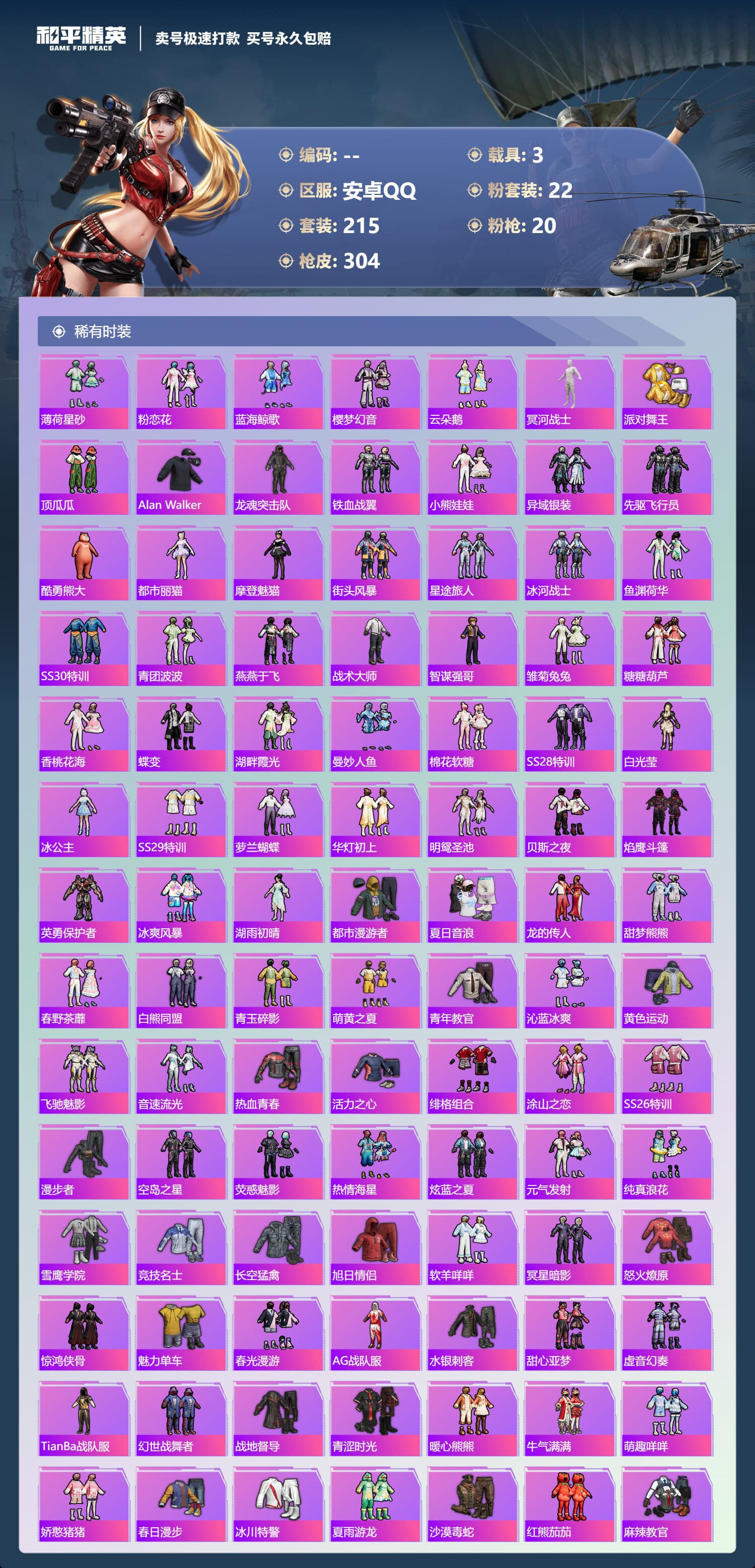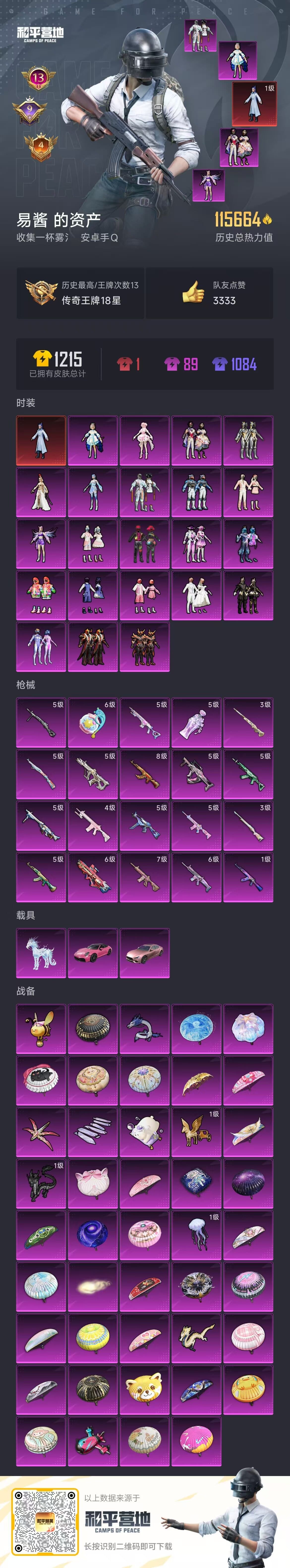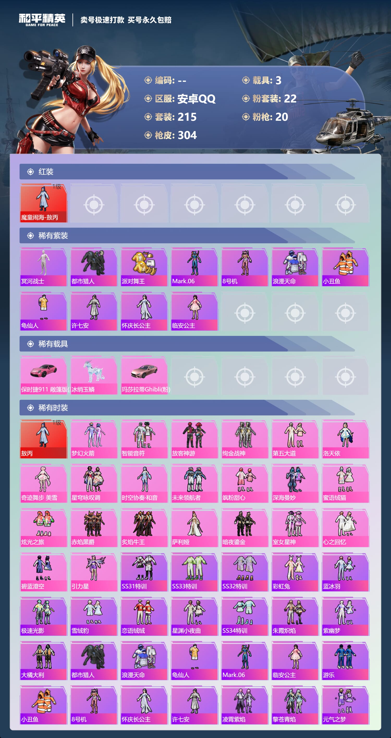 [14539394]实名: 不可修改 时装数: 784 载具数: 3 呛械数: 304 战备数: 237 神级装扮: 魔童闹海-敖丙 热门装扮: 梦幻火箭新101深海曼妙梦魇先生放客神游鹰眼刺客智能音符都市猎人绚金战神冥河战士洛天依炙焰牛王赤焰黑爵软萌银虎暗夜鎏金心之