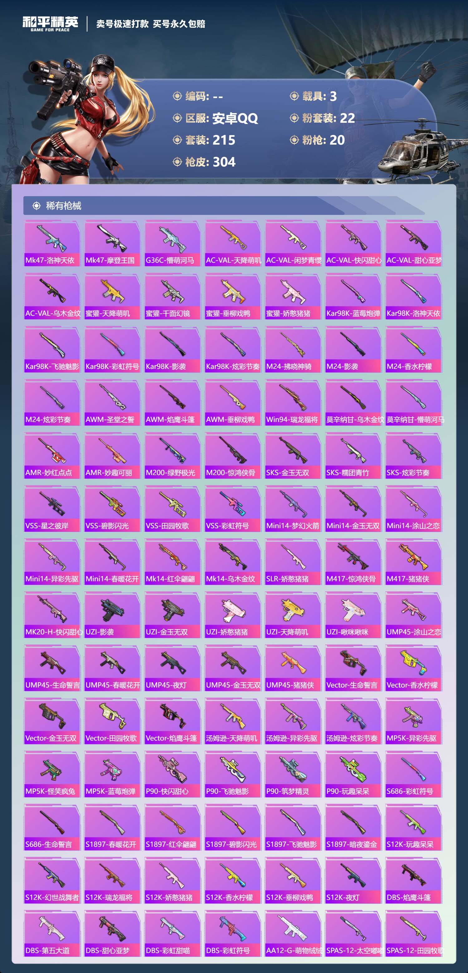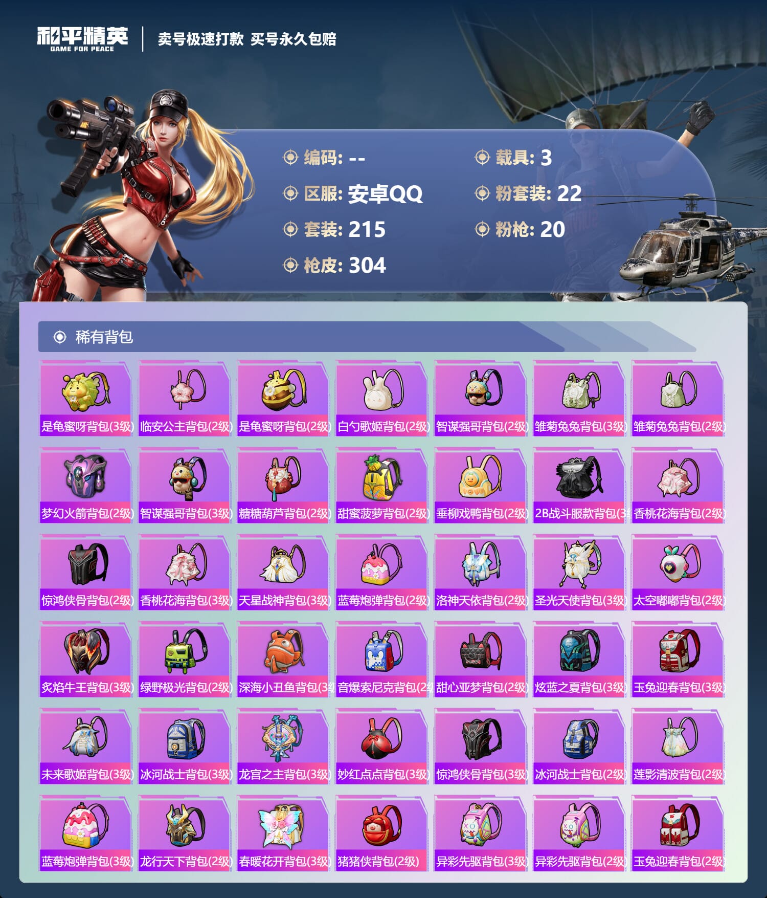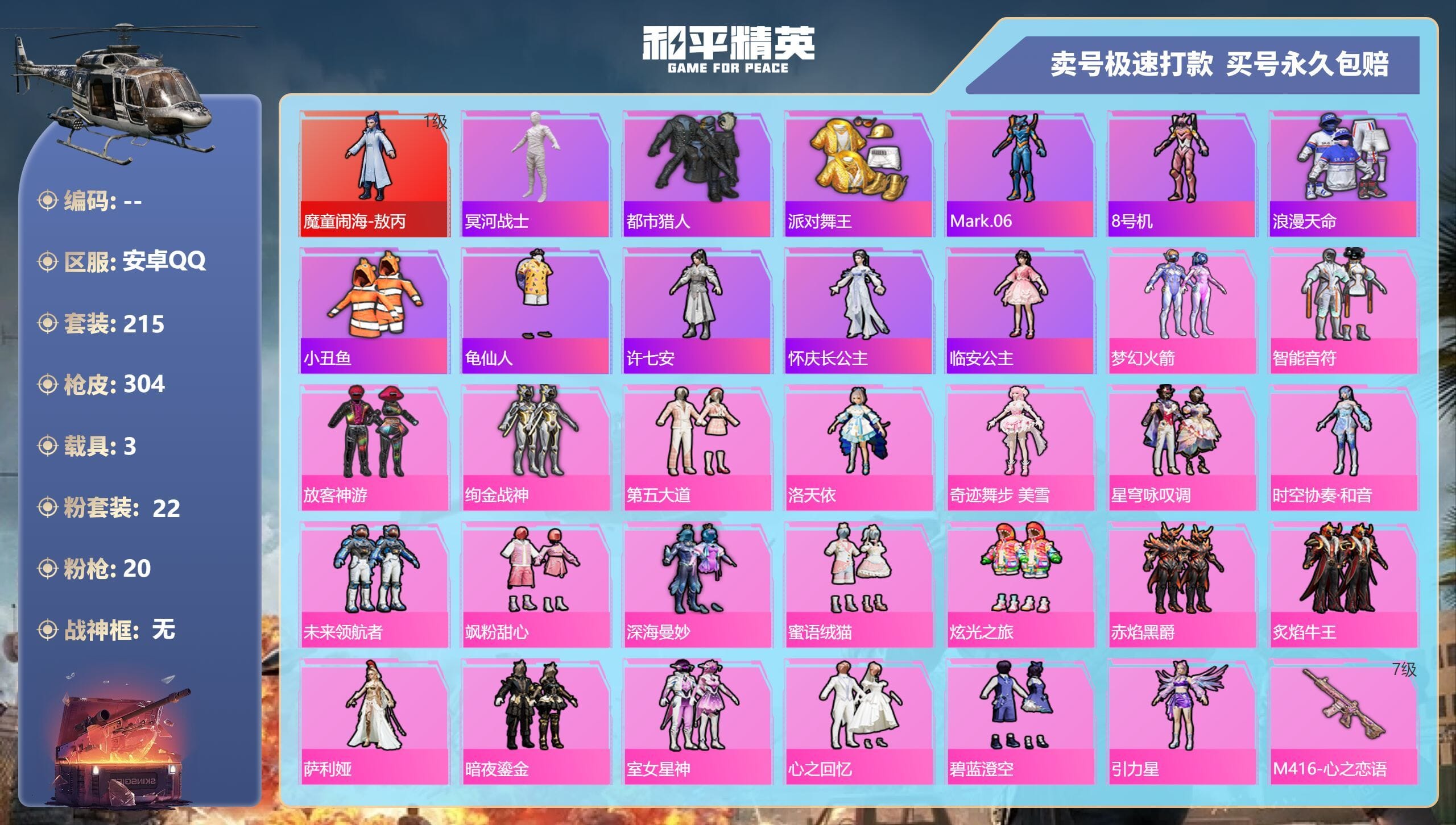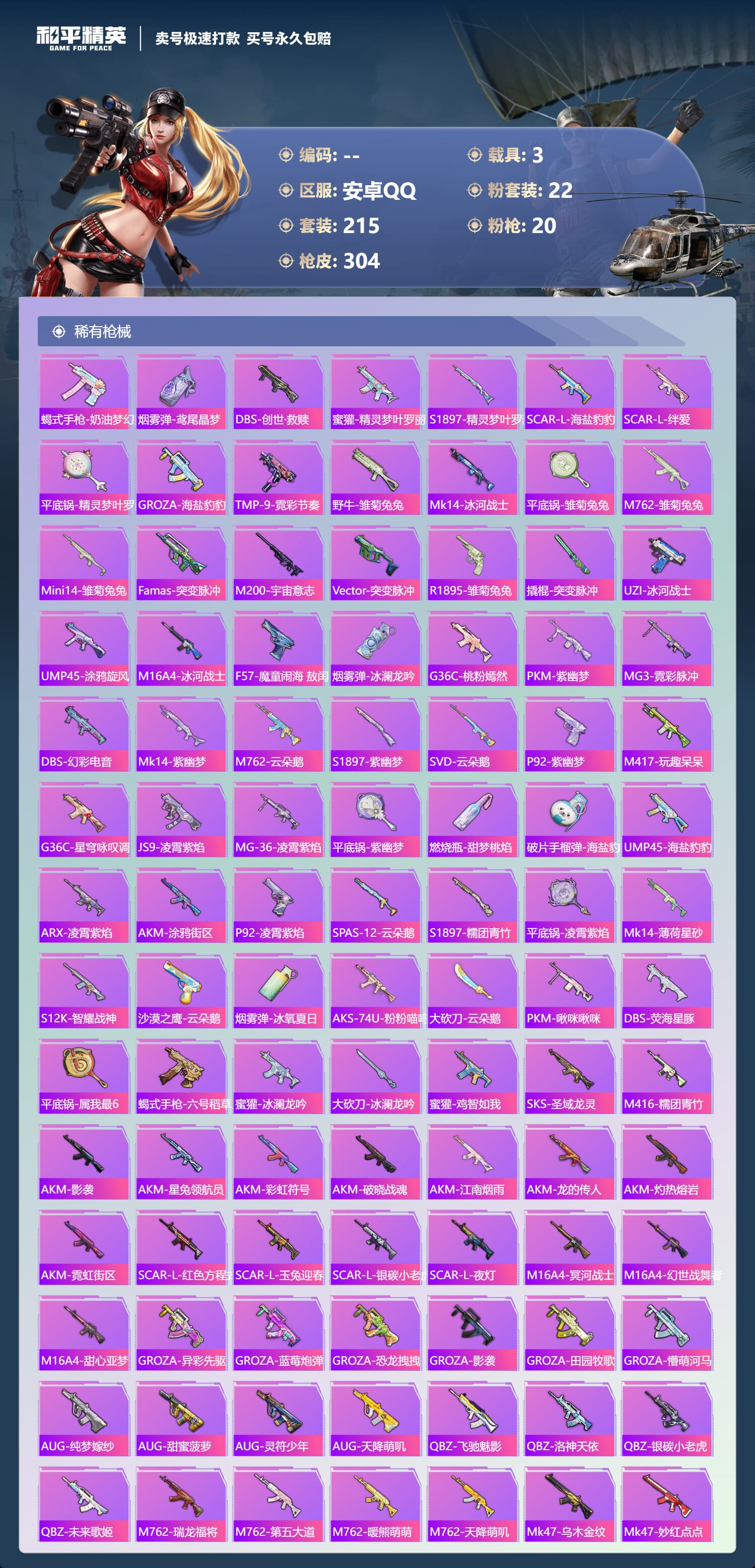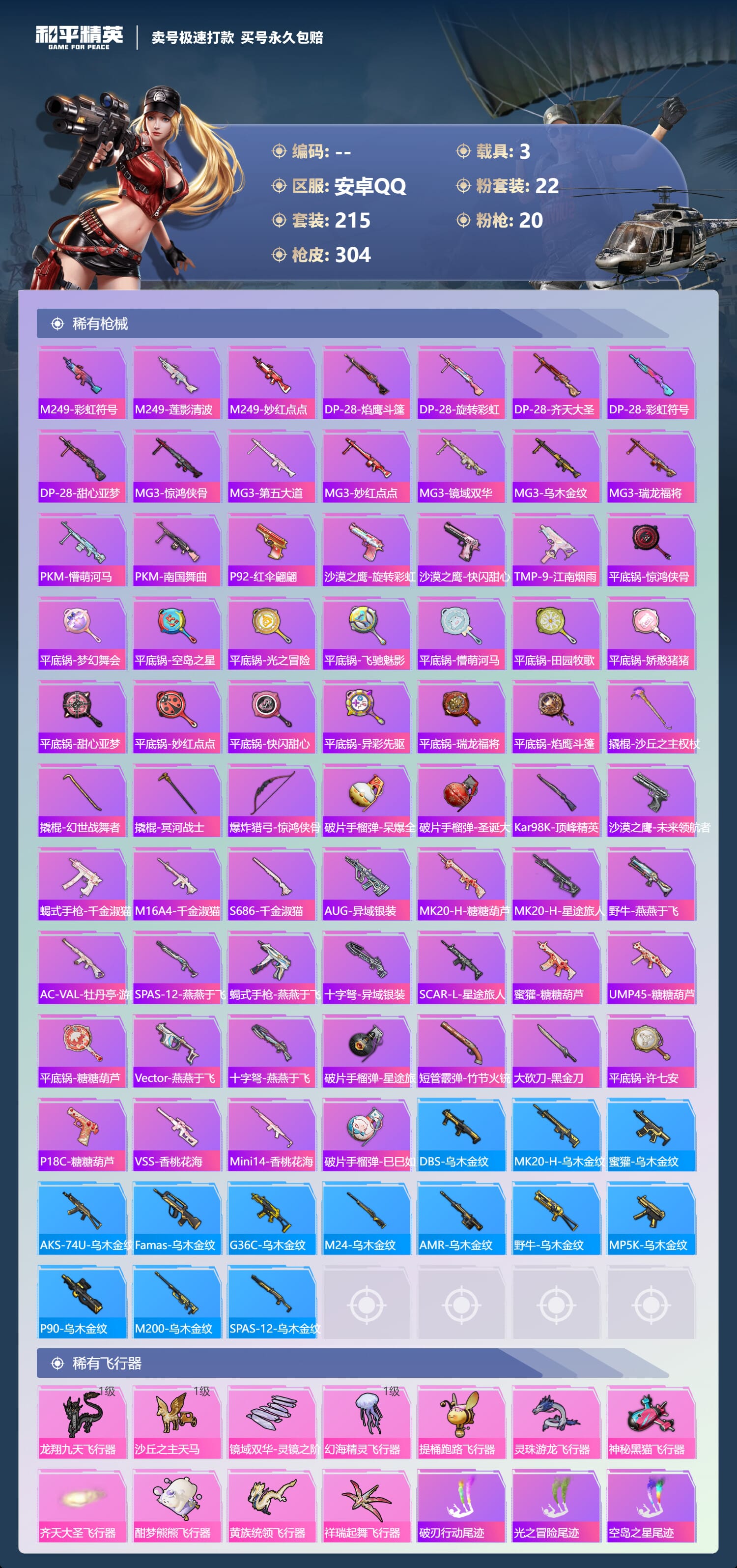 [14539394]实名: 不可修改 时装数: 784 载具数: 3 呛械数: 304 战备数: 237 神级装扮: 魔童闹海-敖丙 热门装扮: 梦幻火箭新101深海曼妙梦魇先生放客神游鹰眼刺客智能音符都市猎人绚金战神冥河战士洛天依炙焰牛王赤焰黑爵软萌银虎暗夜鎏金心之