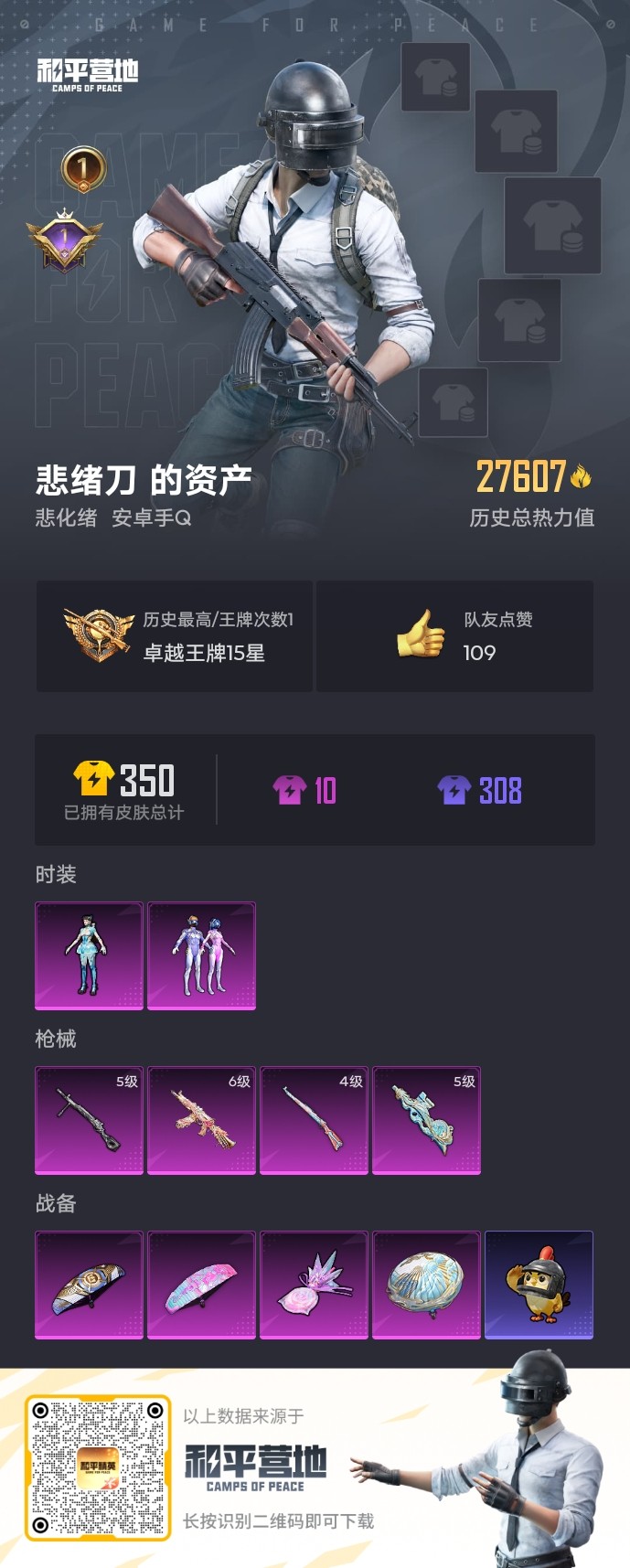 【和平精英】【txhp4762】2粉装,4特效呛,0载具,历史最高段位:卓越王牌15星 王牌印记1次 热力值:27607,74套装,95呛械,116装备,46战备;套装:套装-梦幻火箭,角色-异瞳寒姬,套装-黄色运动,套装-蓝色运动,套装-黄色伏地魔,套装-白色伏地魔,套装-竞技名士,套装-长空猛禽,套装-灼焰舞者,套装-刚毅裁决者,套装-浪漫天命,套装-特殊使命,套装-鹰眼刺客,套装-幻影武者,套装-蓝彩潮人,套装-魅力单车,套装-都市漫游者,套装-金羽特工,套装-破晓战魂,套装-幻世战舞者,套装-冰凉西瓜,套装-夏日倾情,套装-青涩时光,套装-缤纷果语,套装-龙魂突击队,套装-冰川特警,套装-极速红龙,套装-破蛋小黄鸡,套装-疯狂小兔子,套装-迷域探索者,套装-ss7特训,套装-黑色刀锋,套装-核芯基因,套装-精神漫游,套装-鹤鸣,套装-白熊同盟,套装-nv战队服,套装-战术大师,套装-热情海星,套装-纯真浪花,套装-ss22特训,套装-光之冒险,套装-绯格组合,套装-ss23特训,套装-王牌教练,套装-冰河战士,套装-ss28特训,角色-mark.06,套装-海盐绵绵冰,套装-蝶变,套装-湖畔霞光,套装-ss29特训,套装-雏菊兔兔,套装-游龙飞鱼,套装-萝兰蝴蝶,角色-紫俏灵猫,套装-自由猎手,套装-绒宝小鹅,套装-ss31特训,套装-鱼渊荷华,套装-燕燕于飞,套装-晶辉守护,套装-巳巳如意,套装-ss32特训,套装-大橘大利,套装-炫彩糖果,套装-元气之梦,套装-ss34特训,套装-ss35特训,套装-午间小调,套装-秘语星愿,套装-风迹短诗,套装-粉黛兰香,套装-ss36特训;呛皮:m762-天降萌叽,m762-雏菊兔兔,m16a4-幻世战舞者,m16a4-冰河战士,aug-耀粉歌者,aug-冰晶雪宝,aug-乌木金纹,mk47-极冰使者,mk47-风迹短诗,m416-红色方程式,m416-极冰使者,m416-乌木金纹,scar-l-夜灯,scar-l-炫彩节奏,scar-l-玉兔迎春,akm-破晓战魂,akm-霓彩脉冲,akm-乌木金纹,ac-val-天降萌叽,蜜獾-天降萌叽,蜜獾-风迹短诗,蜜獾-乌木金纹,q-彩虹符号,q-纯真浪花,groza-黑色刀锋,groza-乌木金纹,win94-乌木金纹,m200-乌木金纹,4级kar98k-巳巳如意,kar98k-自由猎手,awm-垂柳戏鸭,awm-纯真浪花,莫辛纳甘-风迹短诗,mk20-h-乌木金纹,sks-勇闯险境,sks-炫彩节奏,mini14-梦幻火箭,mini14-雏菊兔兔,slr-金丰海韵,mk12-游龙飞鱼,mk12-风迹短诗,vss-华贵君王,vss-黑色刀锋,m417-幻影飞狐,mk14-冰河战士,uzi-天降萌叽,uzi-冰河战士,uzi-炫彩糖果,uzi-乌木金纹,汤姆逊-勇闯险境,汤姆逊-耀粉歌者,汤姆逊-天降萌叽,汤姆逊-纯真浪花,vect-黑色刀锋,vect-创世·救赎,vect-游龙飞鱼,vect-燕燕于飞,野牛-雏菊兔兔,野牛-燕燕于飞,5级p90-金丰海韵,ump45-夜灯,ump45-生命誓言,ump45-海盐豹豹,ump45-极意拳锋,6级aks-74u-星穹咏叹调,aks-74u-乌木金纹,aa12-g-纯真浪花,dbs-游龙飞鱼,dbs-风迹短诗,dbs-乌木金纹,s686-生命誓言,s686-巳巳如意,s686-乌木金纹,s12k-夜灯,s12k-乌木金纹,spas-12-燕燕于飞,pkm-啾咪啾咪,5级dp-28-豹影疾电,dp-28-彩虹符号,mg3-幻世战舞者,mg3-乌木金纹,m249-彩虹符号,蝎式手呛-燕燕于飞,信号呛-异瞳寒姬,r1895-雏菊兔兔,平底锅-黑色刀锋,平底锅-勇闯险境,平底锅-缤纷糖果,平底锅-纯真浪花,平底锅-雏菊兔兔,撬棍-朗基努斯之呛,突击盾牌-初号机 觉醒ver.,铝热弹-炫彩糖果,十子怒-异瞳寒姬,十子怒-燕燕于飞;降落伞:炫彩糖果飞行器,粉色滑翔尾迹,狂鲨锋刃飞行器,鸡智如我飞行器; 详情看图2.7w热力值-2粉/新101-4特