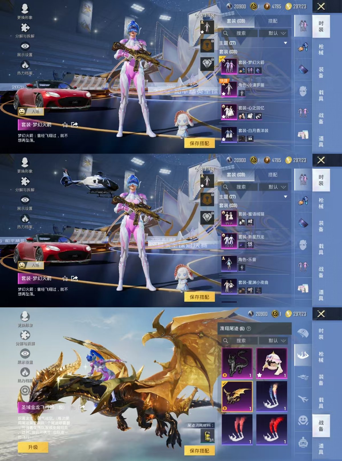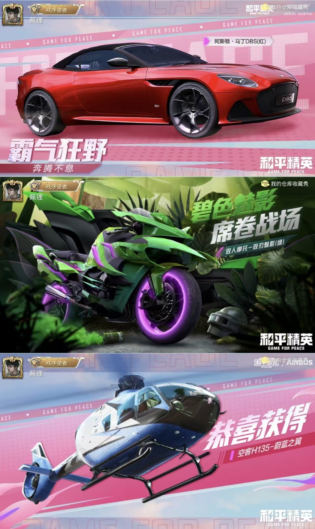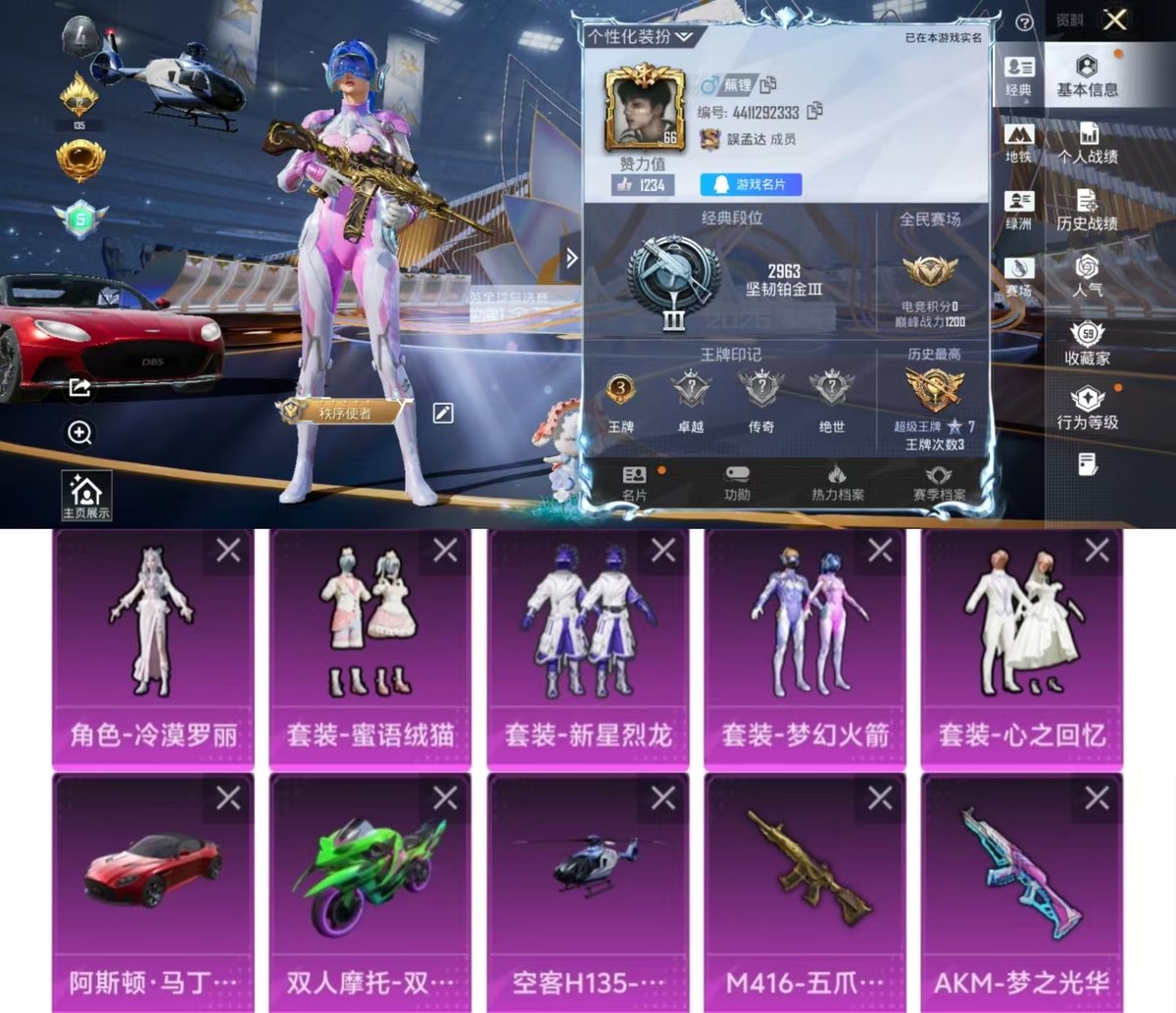 _2304070-实名:可修改时装数:534载具数:2呛械数:178战备数:105热门装扮:奇异狩猎者梦幻火箭新101迅捷狂鲨鹰眼刺客新星烈龙心之回忆蜜语绒猫冷漠罗丽载具:双人摩托-双刃魅影绿阿斯顿·马丁dbs红空客h135-蔚蓝之翼稀有呛皮:m416五爪金龙akm梦之光华kar98k-巳巳如意