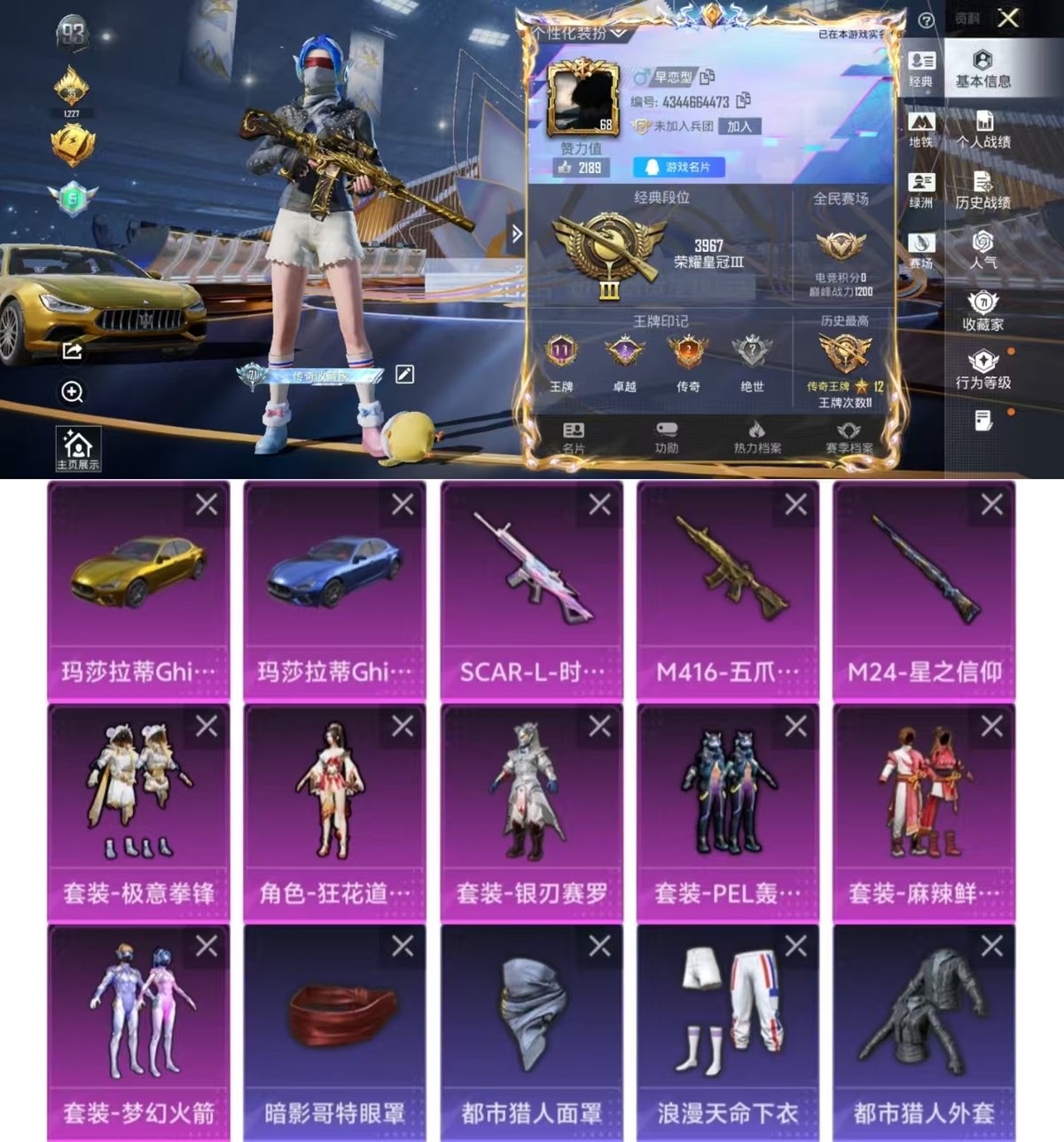 _2304081-实名:可修改时装数:666载具数:2呛械数:224战备数:154热门装扮:梦幻火箭新101天启纪元浪漫波比木曜青龙都市猎人pel轰鸣竞梦者麻辣鲜香锅银刃赛罗精灵迷巫华贵君王潮萌小黄鸭奇迹天团蔷薇魔法师神秘黑猫狂花道·不知火舞极意拳锋载具:玛莎拉蒂ghibli金玛莎拉蒂ghibli蓝稀有呛皮:mini14龙虾霸霸m24星之信仰m416五爪金龙m762-青锋波束scar-l-时空协奏爆炸猎弓-拳皇·狂花道kar98k-巳巳如意aug-暖羊咩咩mk14-甜梦熊击dp-28-豹影疾电