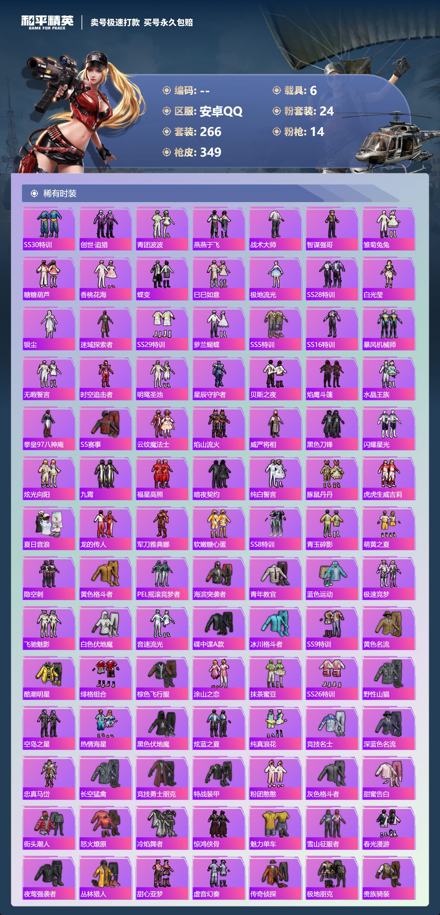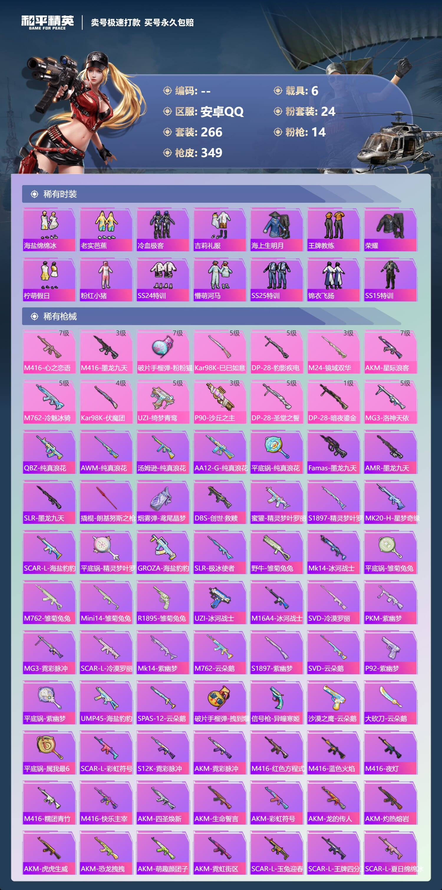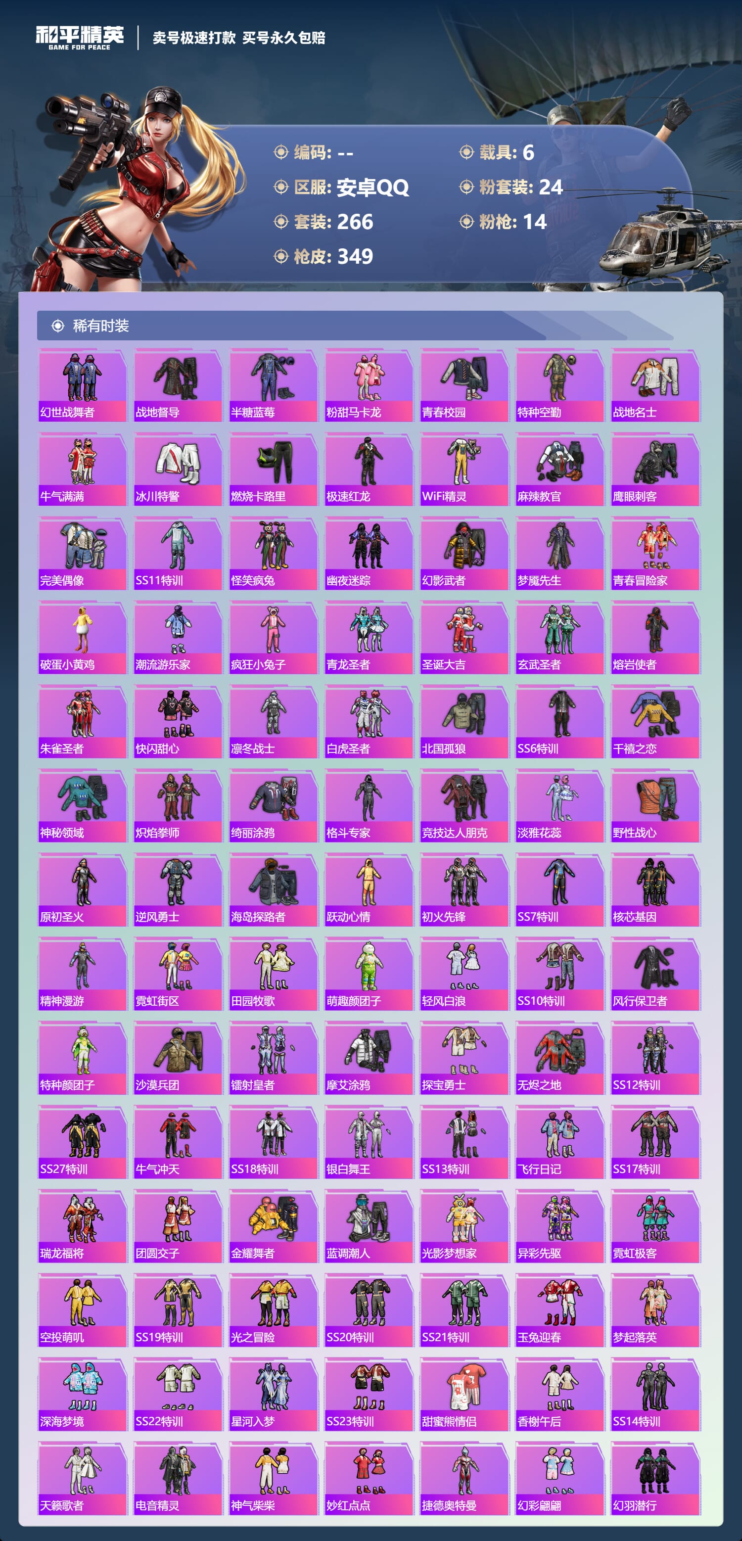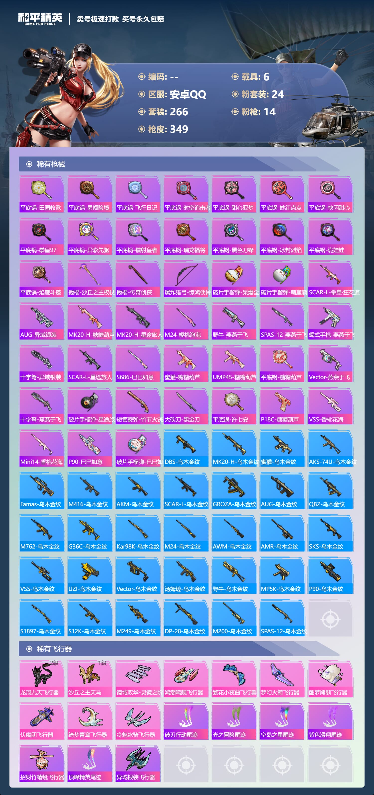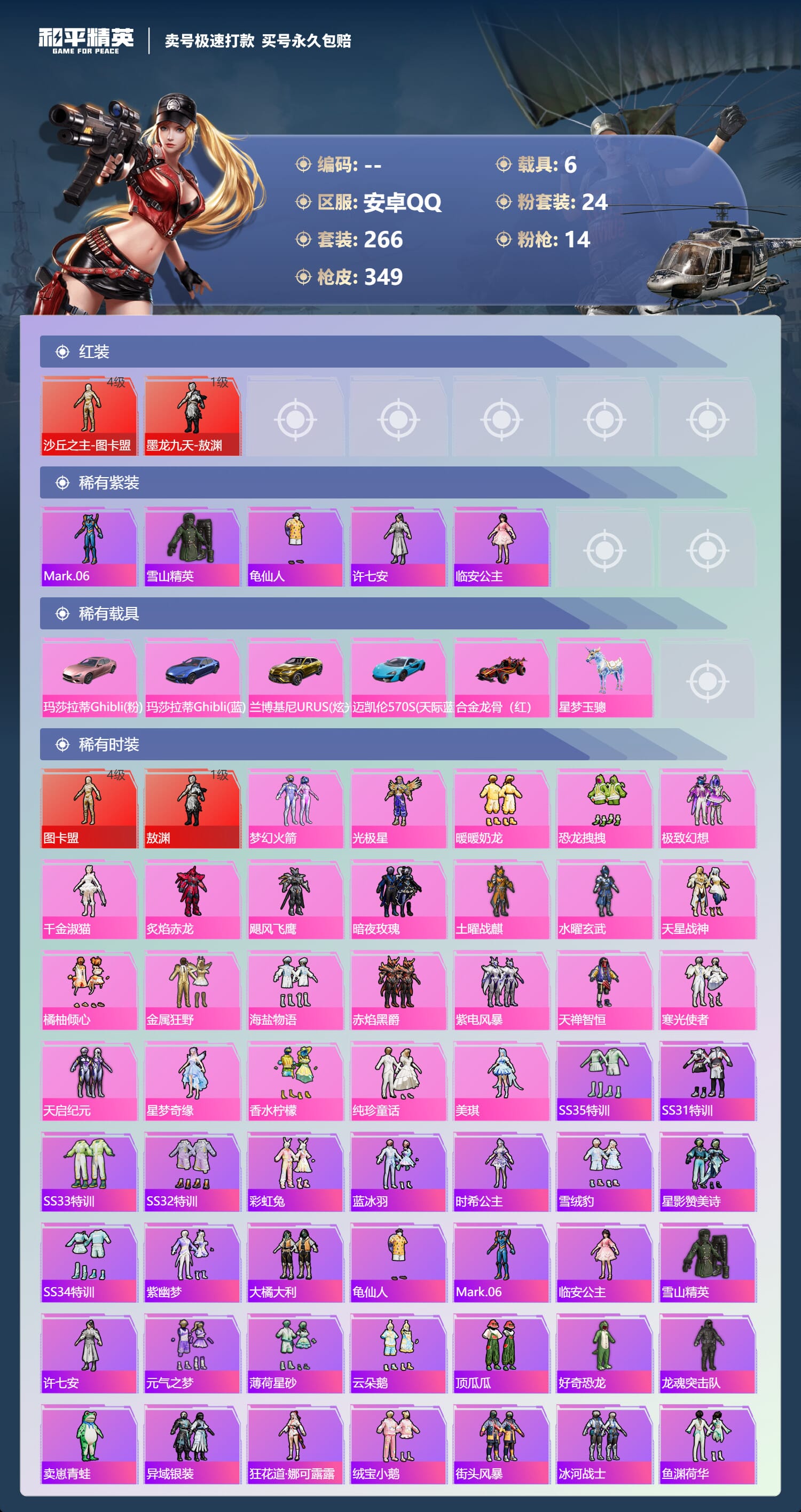 6载具-0套装-351呛皮-实名: 不可修改 时装数: 1029 载具数: 6 呛械数: 351 战备数: 256 神级装扮: 沙丘之主-图卡盟墨龙九天-敖渊 热门装扮: 梦幻火箭新101天启纪元梦魇先生水曜玄武土曜战麒金属狂野鹰眼刺客好奇恐龙香水柠檬天禅智恒极致幻想炙焰赤龙飓风飞鹰暗夜玫瑰海