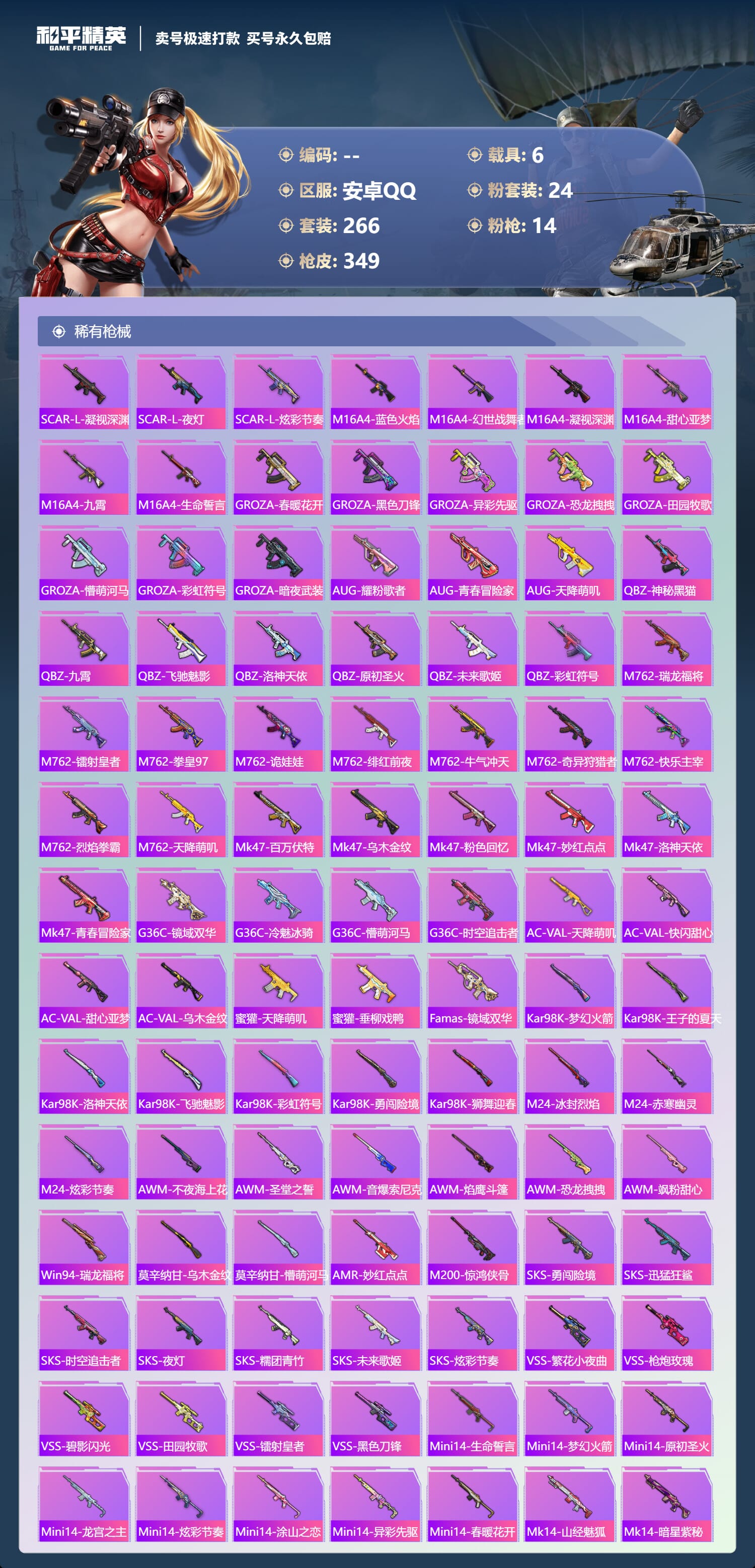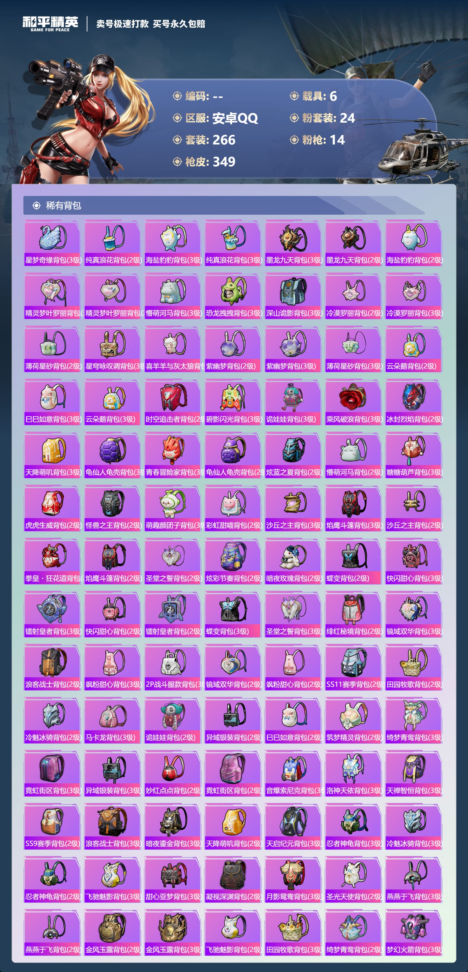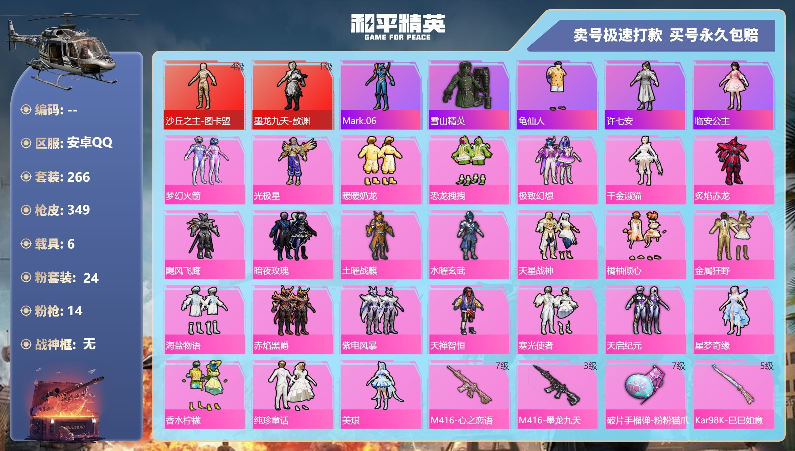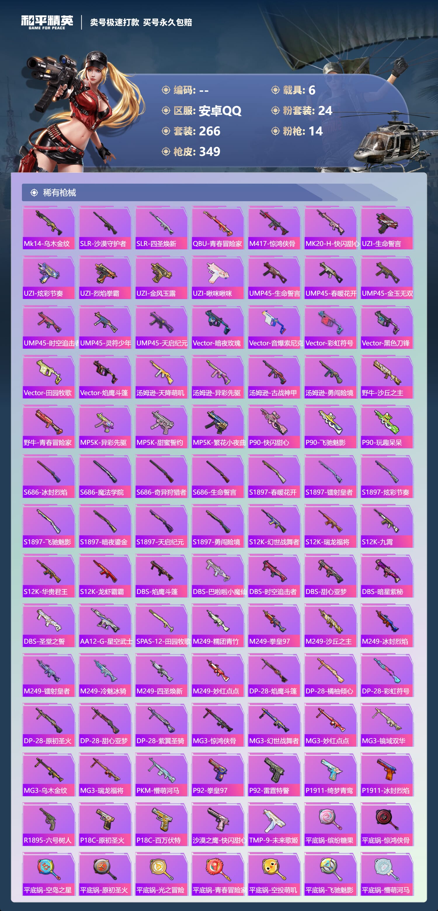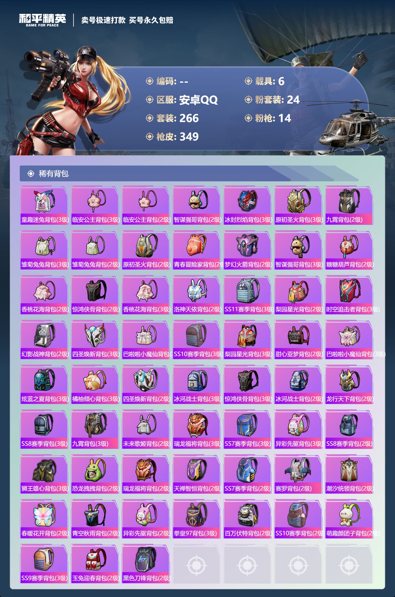 6载具-0套装-351呛皮-实名: 不可修改 时装数: 1029 载具数: 6 呛械数: 351 战备数: 256 神级装扮: 沙丘之主-图卡盟墨龙九天-敖渊 热门装扮: 梦幻火箭新101天启纪元梦魇先生水曜玄武土曜战麒金属狂野鹰眼刺客好奇恐龙香水柠檬天禅智恒极致幻想炙焰赤龙飓风飞鹰暗夜玫瑰海