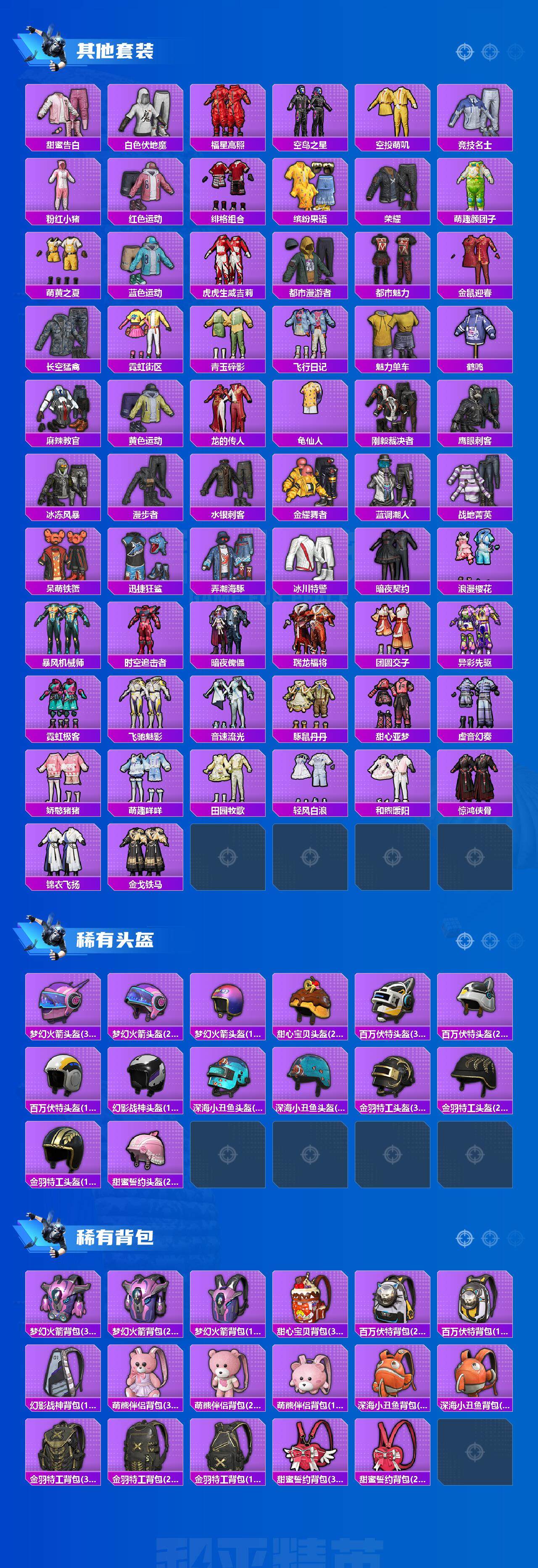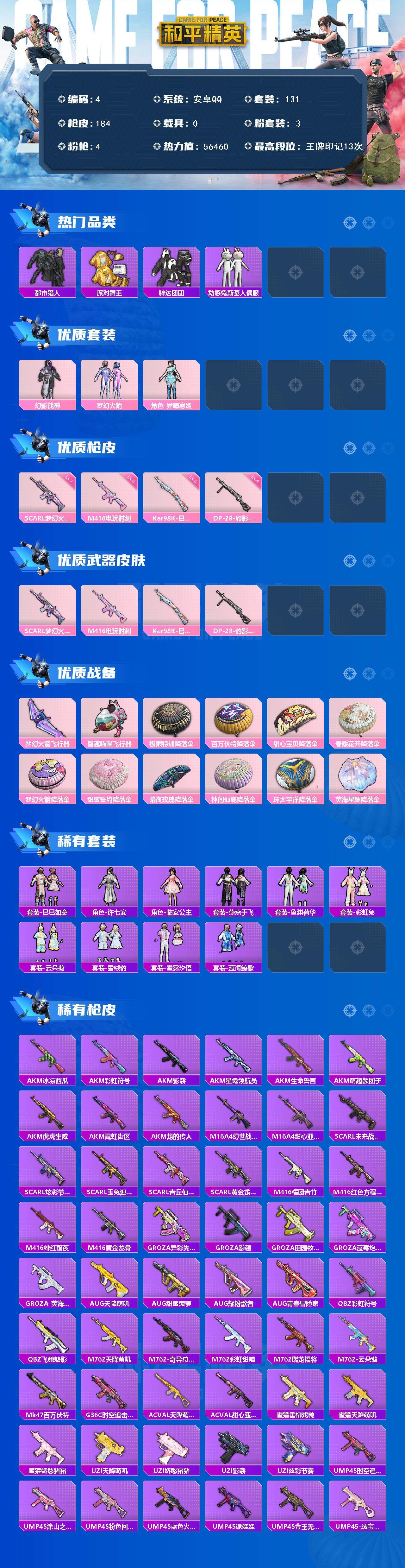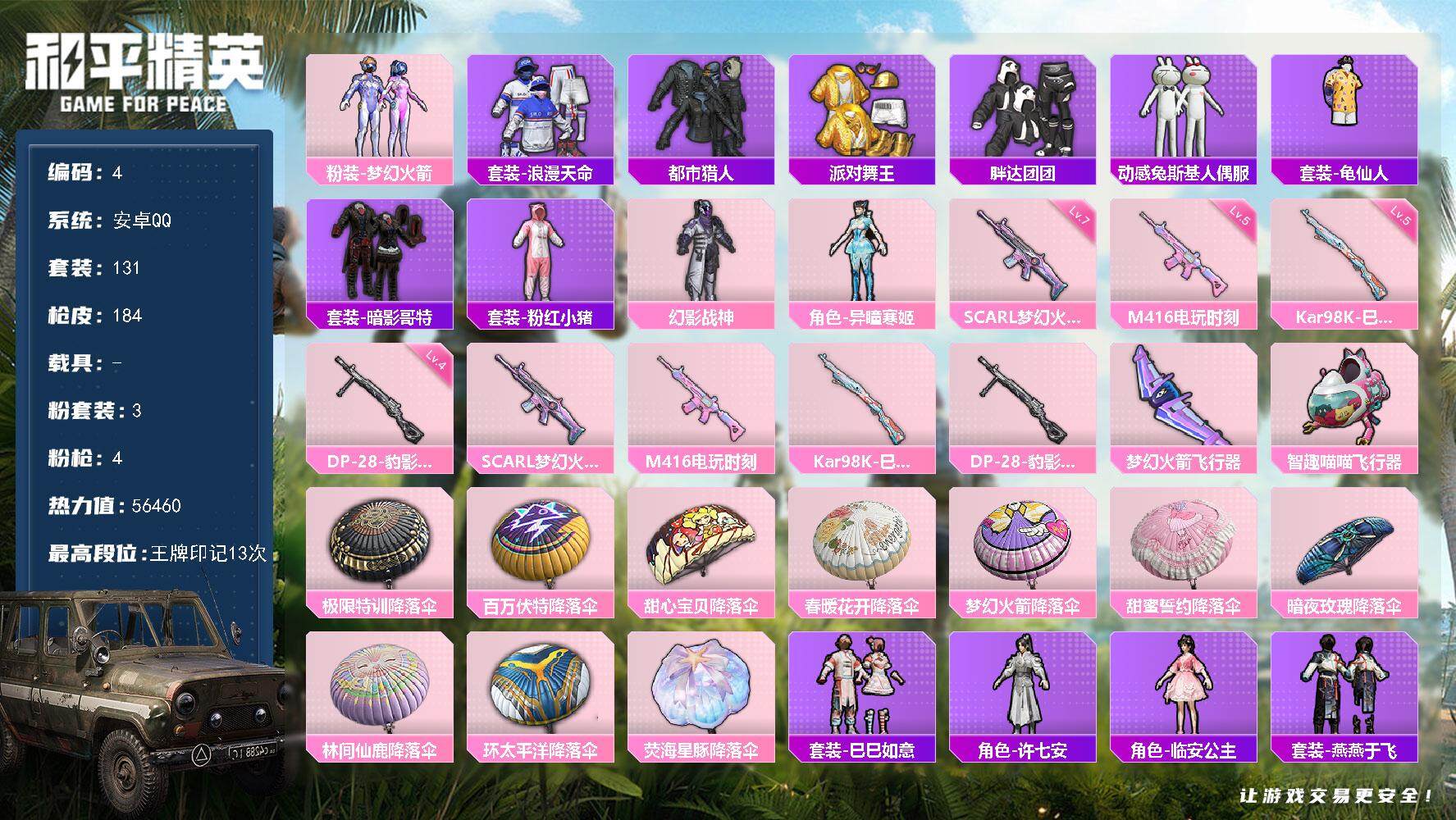 0载具-131套装-184呛皮-【身法号 梦幻火箭 电玩时刻 热门 都市猎人 派对舞王 暗影哥特 浪漫天命 小熊背包全套】安卓q-6稀有3粉装4特效呛21热门131套装184呛皮 56460热力值 13印记 历史超级王牌21星 【6稀有】 m416-黄金龙骨 awm-黄金龙骨 都市猎人 浪漫天命 派对舞王 派对舞王(金靴子) 【3粉装】 梦幻火箭 异瞳寒姬 幻影战神 【4特效呛】 scar-l-梦幻火箭